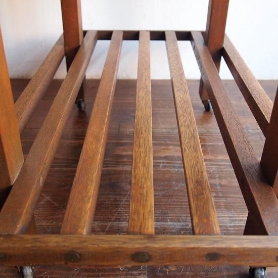 こちらも珍しいデザインの「ワゴンテーブル」。落ち着いた木地色で雰囲気がとても良く、緑やお花とも相性がよさそうですね。キャスターがついているのでキッチンやアトリエなどで少々重たいものをのせても移動はスムーズにいけます。