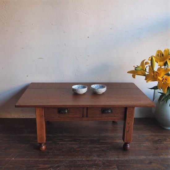 小ぶりサイズの「文机」。味わい深い取っ手がすてきな表情をつくり、脚のデザインもすてきな印象。サイズも可愛らしく、本やお花を置いたり、ちょっとした作業やお茶をするのに活躍してくれそうです。