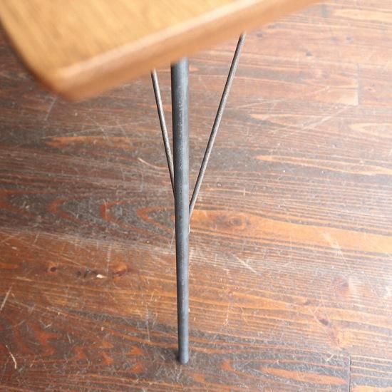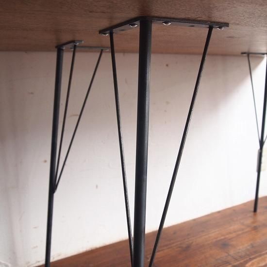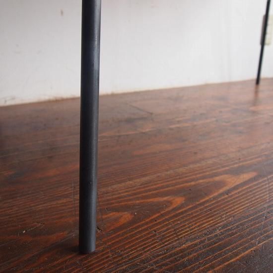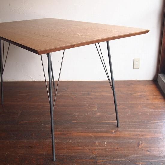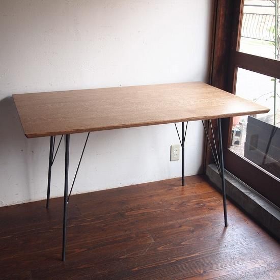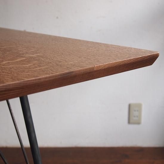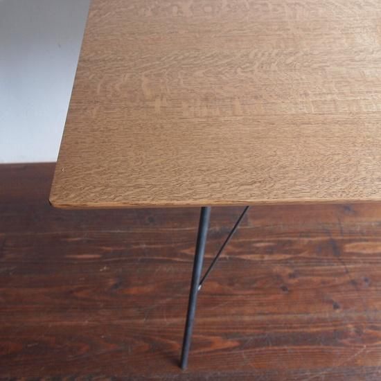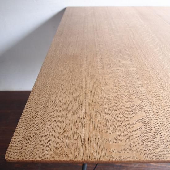 鉄脚に贅沢に「楢」で造った天板をのせました。しっかりとした厚みのある天板で、やわらかな木地色がすてきな印象。4人で囲んで頂けるサイズです、スツールを合わせて頂ければ6人でも囲んで頂けます。ダイニングや作業台として活躍してくれます!