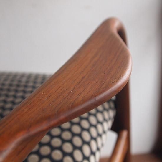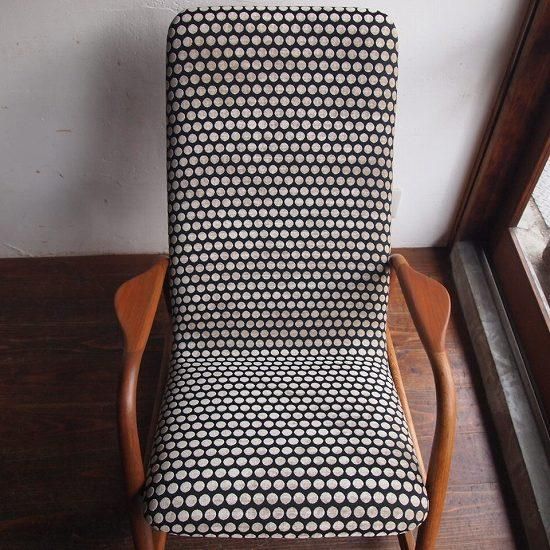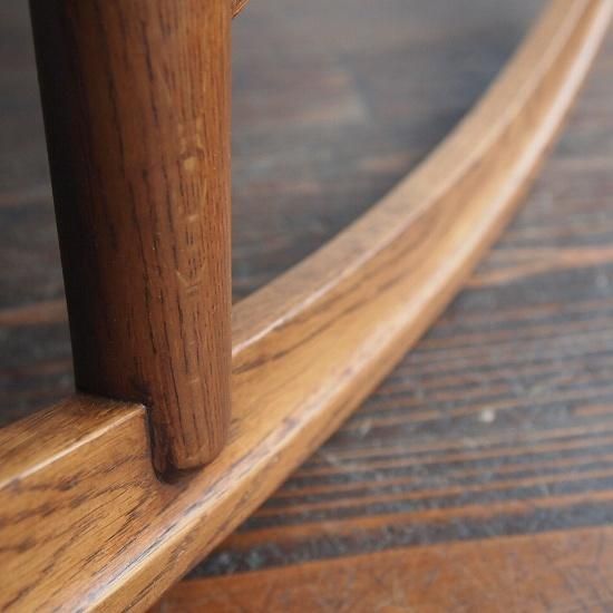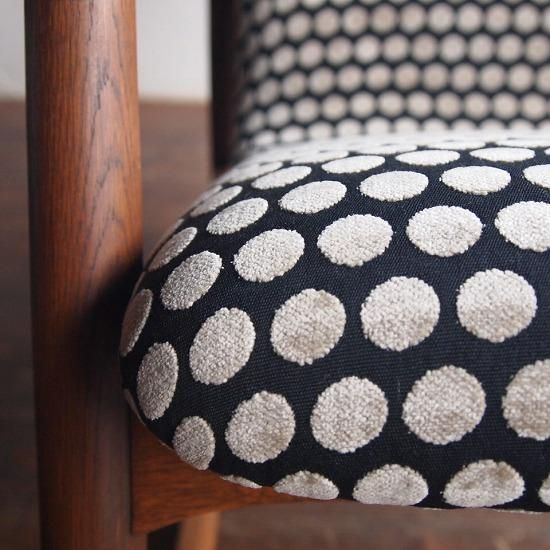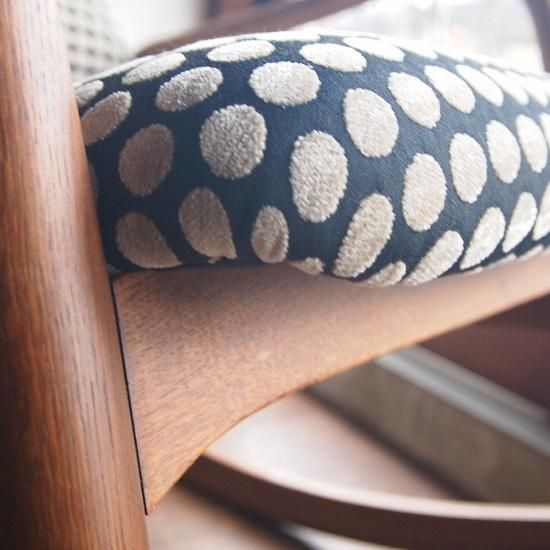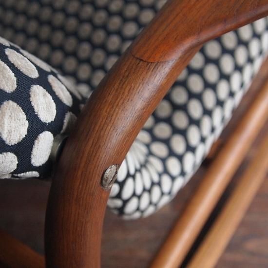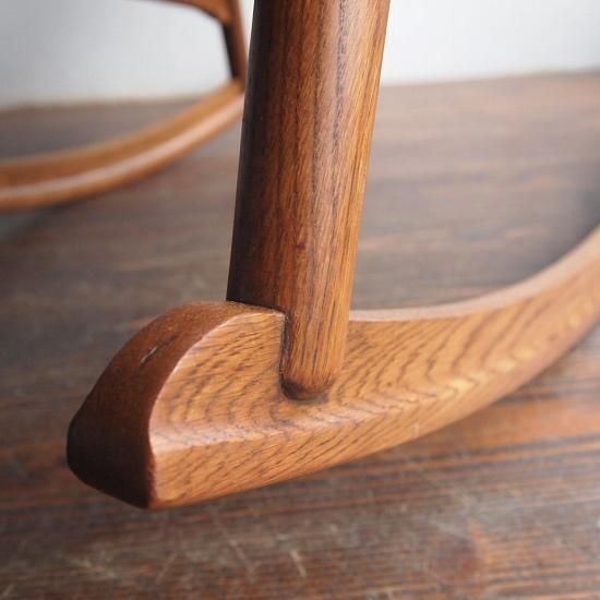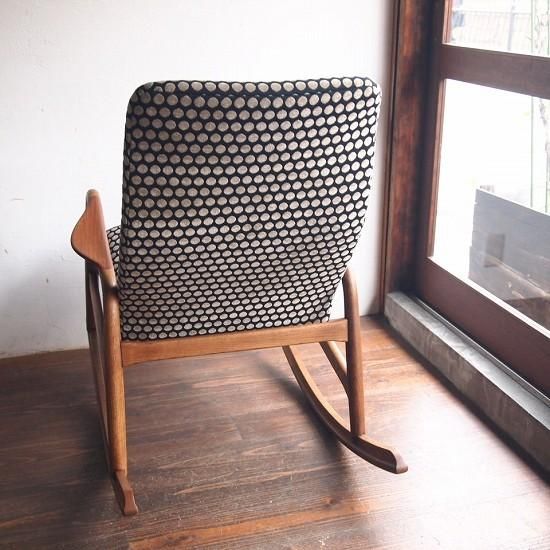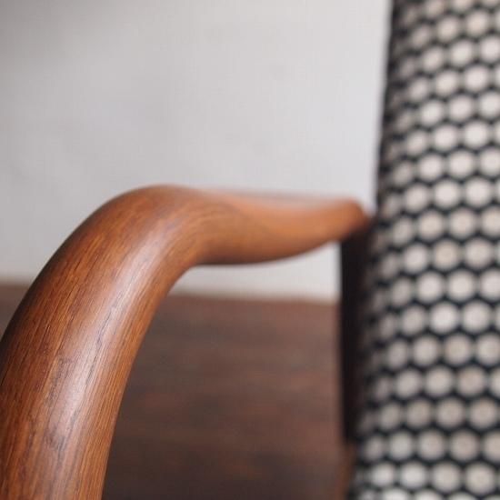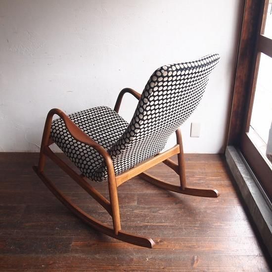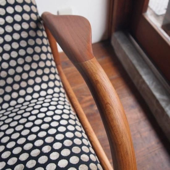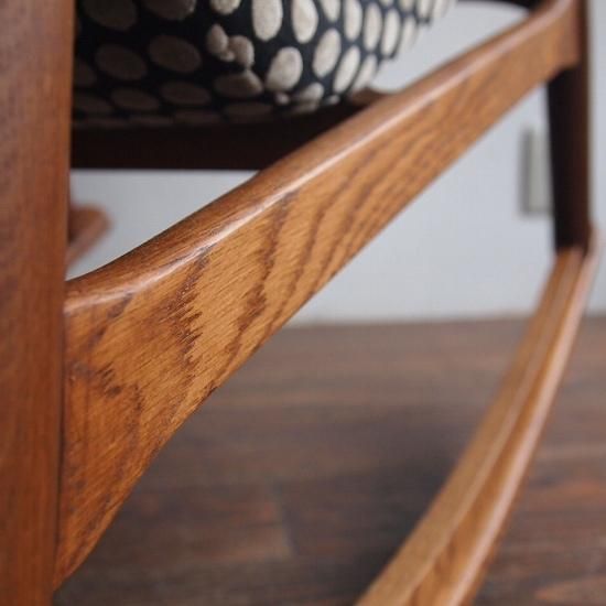 「楢」で造られた「ロッキングチェア」。肘掛や脚の柔らかなきれいなラインが、優雅な印象を与えてくれるデザイン。優しいブラウン色の木地とドットの布地が素敵な相性で、お部屋の雰囲気を変えてくれそうですね。