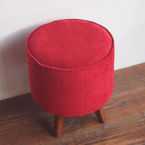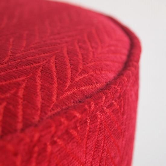 小さな「丸スツール」。ころんとして可愛らしく愛嬌のあるデザイン。布地は模様の入った赤の「スカーレット」、雰囲気があってすてきな印象です。お部屋に置いておくだけでも可愛らしいですね。