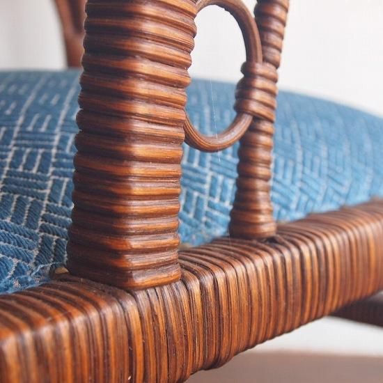 すてきなデザインの「籐の椅子」。丁寧に編み込まれており、サイドもバックもとても素敵な表情をしています。落ち着いたブラウン色の籐とセルリアンブルーの布地のバランスも良い仕上がりとなりました。ゆったりと座って本を読んだり、縁側で冷たいものを飲みたいですね。