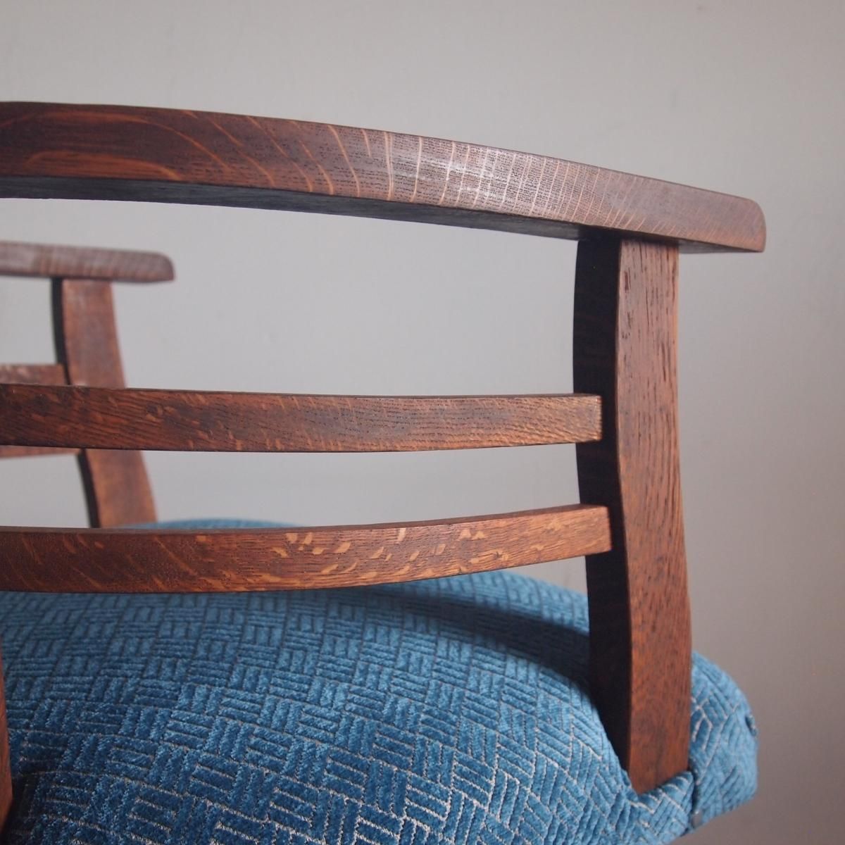 「楢」で造られた「回転いす」。脚やひじ掛け部分のやわらかなラインですっきりと綺麗なデザインです。どの角度からも素敵な表情をしています。ヨーロッパの織模様の入ったセルリアンブルーの布地と、落ち着きのある木地色のバランスが良く、とても良い雰囲気で、ゆったりと座って頂けるサイズです。上下5cmほど高さの調整できます。