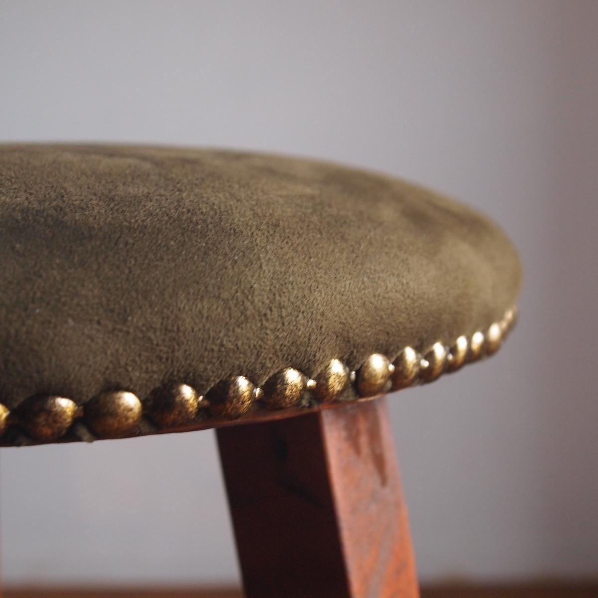 脚のデザインが良い「スツール」。艶のある深いブラウン色と、レザーのカーキ色の相性がよく素敵な印象。連続に打たれている鋲が、表情を豊かにしてくれています。