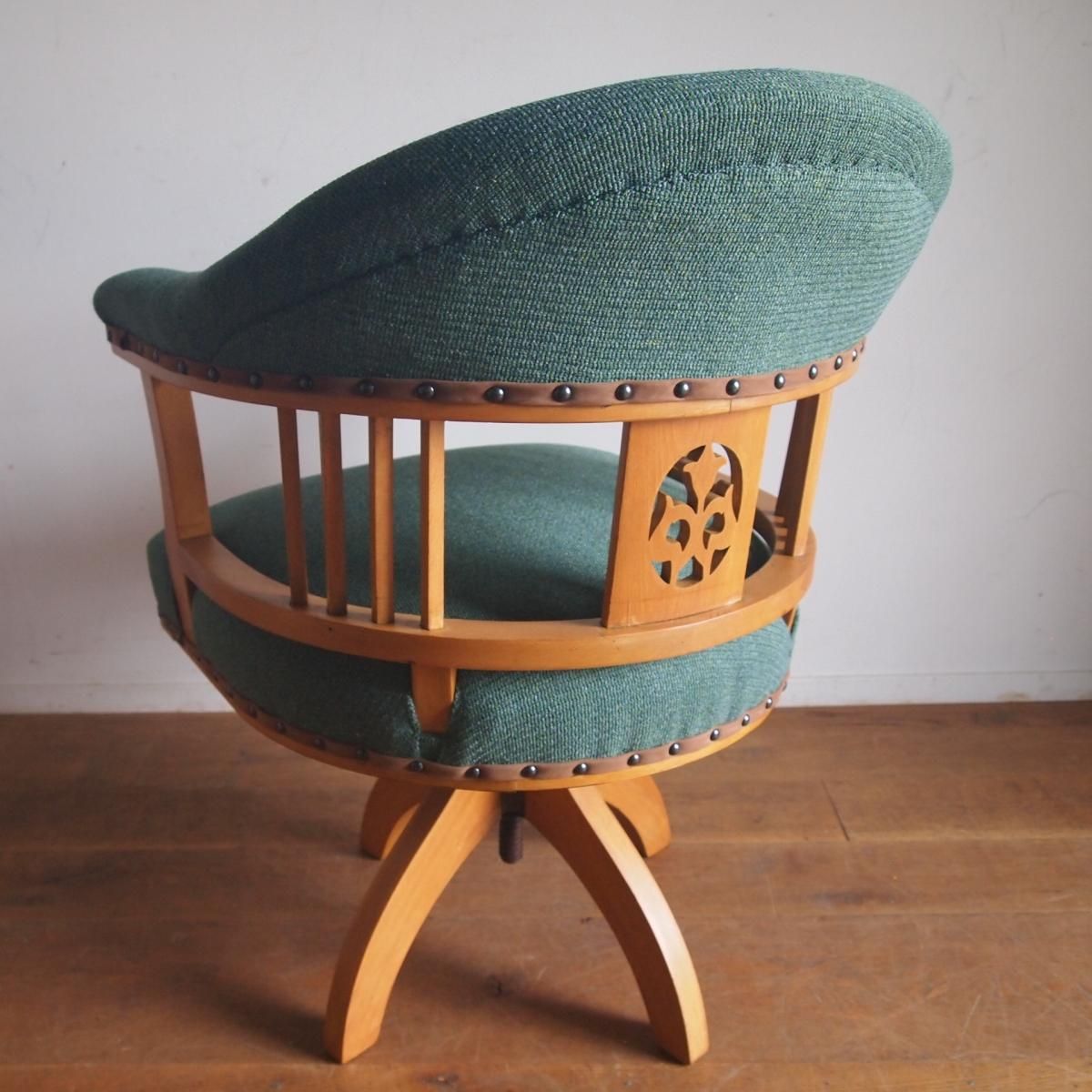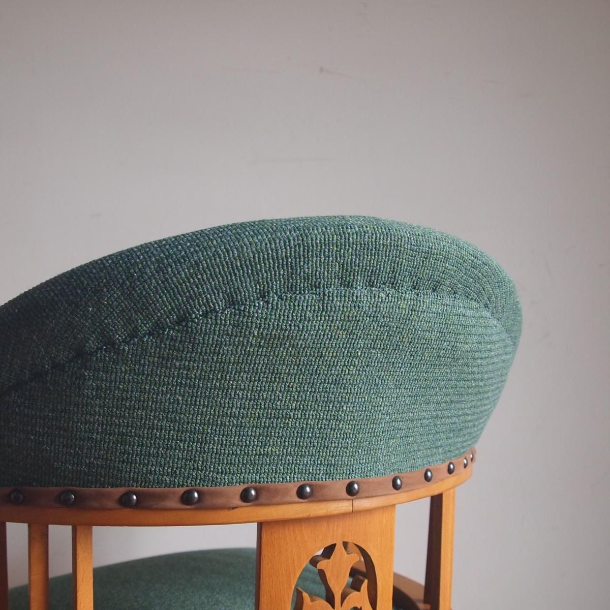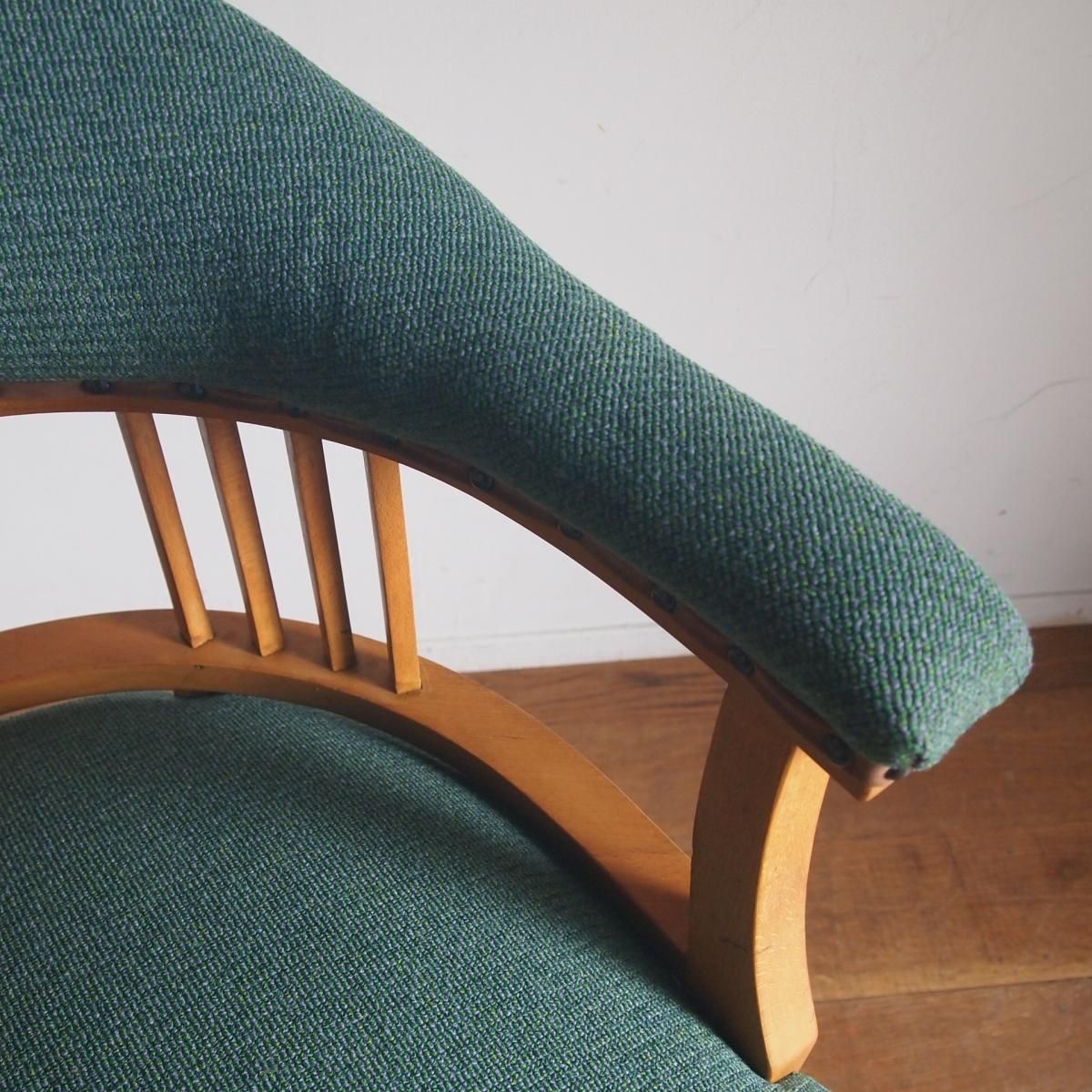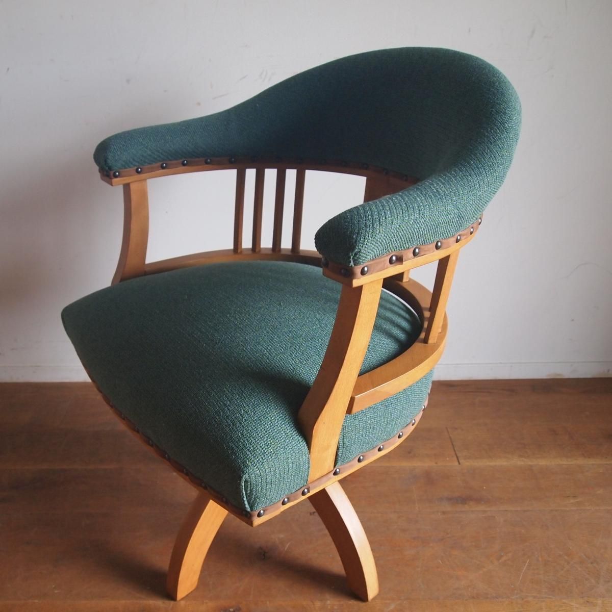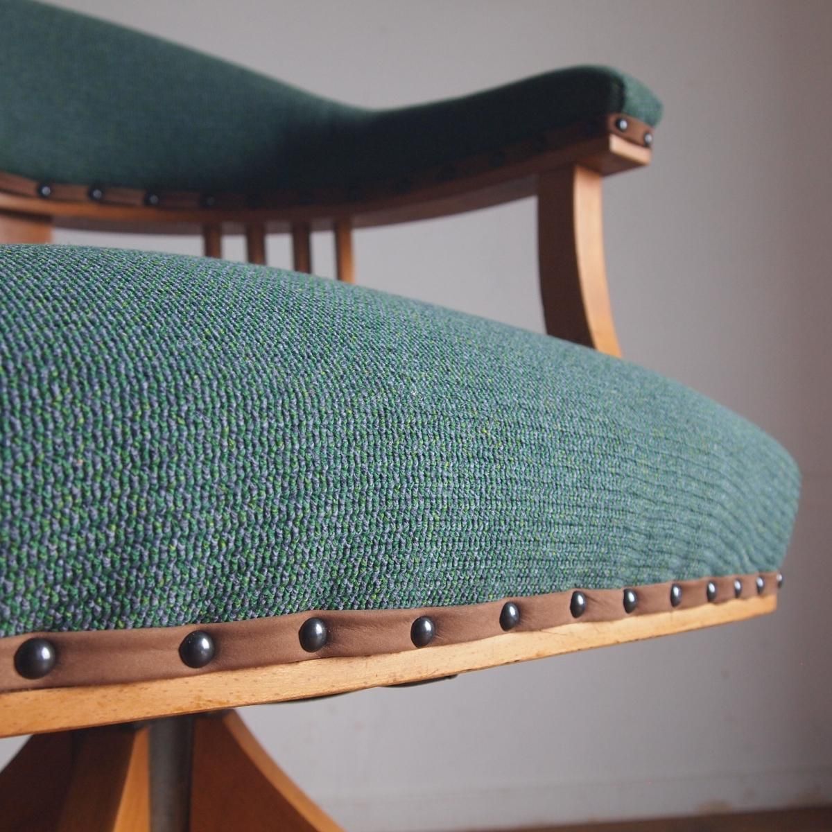 背付き部分のデザインがめずらしく、とても雰囲気のある印象的な「回転椅子」。材質は「ブナ」、ファブリックはヨーロッパのデットストックで、柔らかなグリーンの布地にグレーが織り込まれた物。縁取ったレザーとの相性も良く、素敵な印象が残ります。しっかりとした造りで座り心地もよく、年を重ねていくことに味わい深くなりそうです。