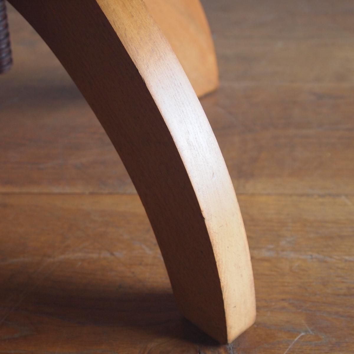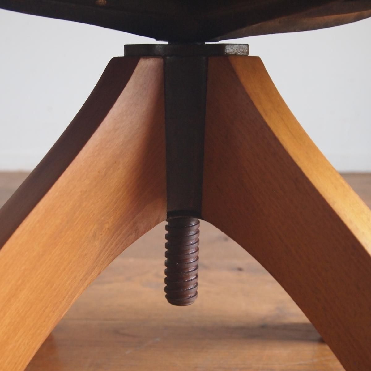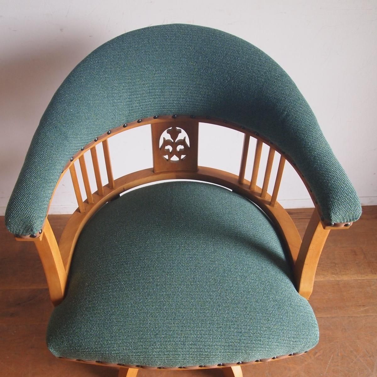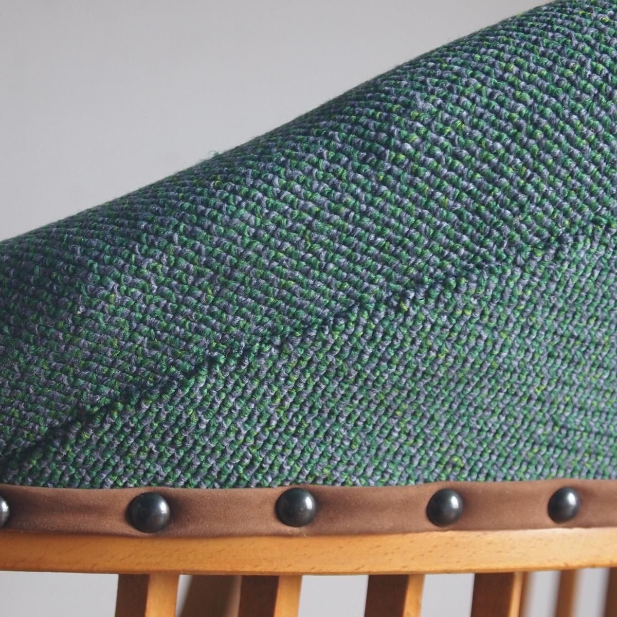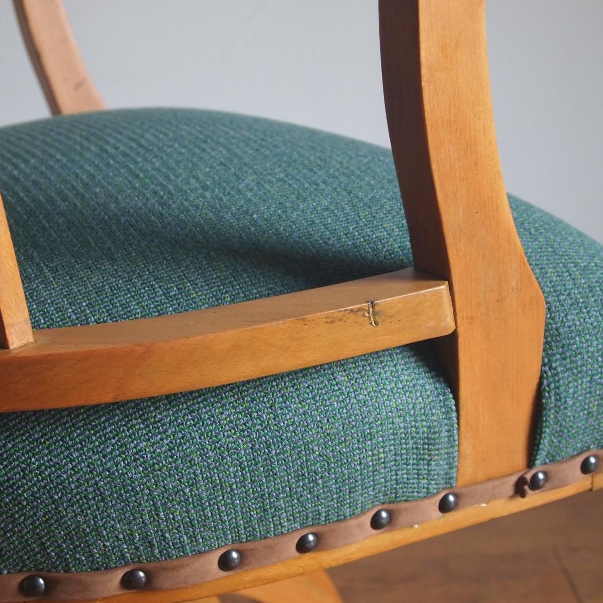 背付き部分のデザインがめずらしく、とても雰囲気のある印象的な「回転椅子」。材質は「ブナ」、ファブリックはヨーロッパのデットストックで、柔らかなグリーンの布地にグレーが織り込まれた物。縁取ったレザーとの相性も良く、素敵な印象が残ります。しっかりとした造りで座り心地もよく、年を重ねていくことに味わい深くなりそうです。