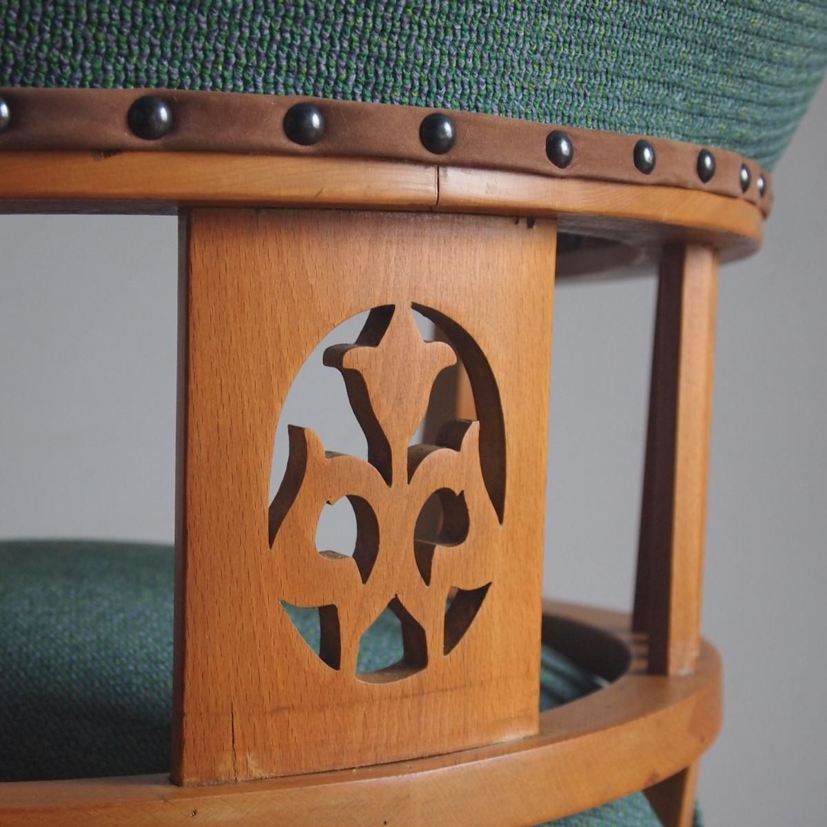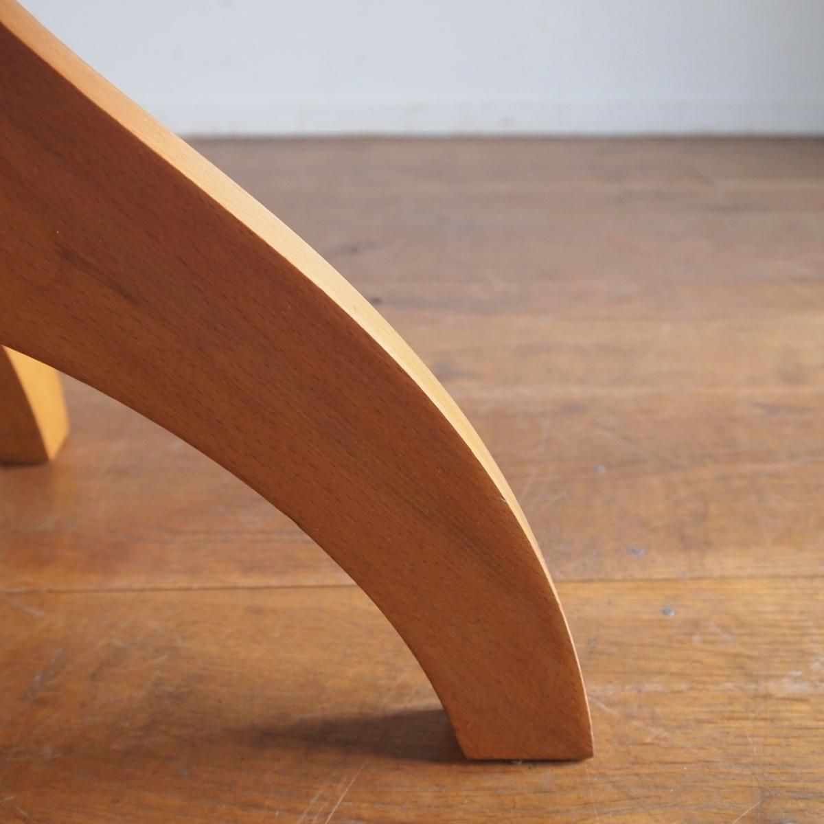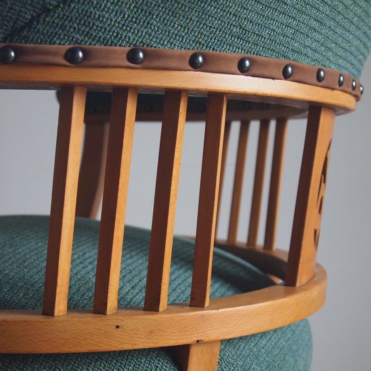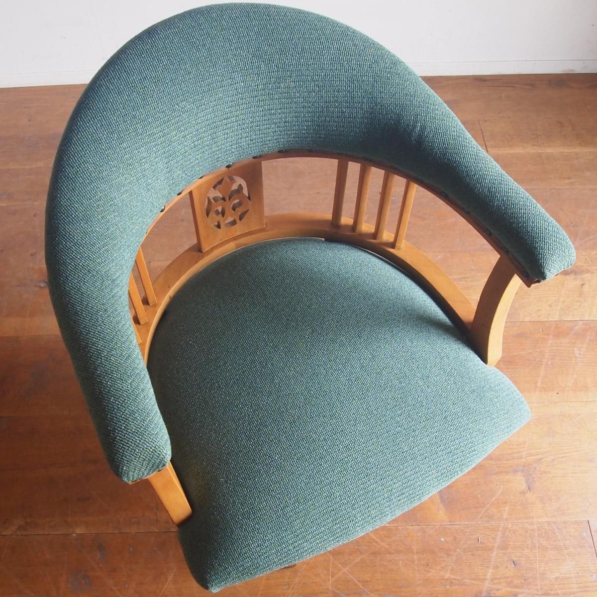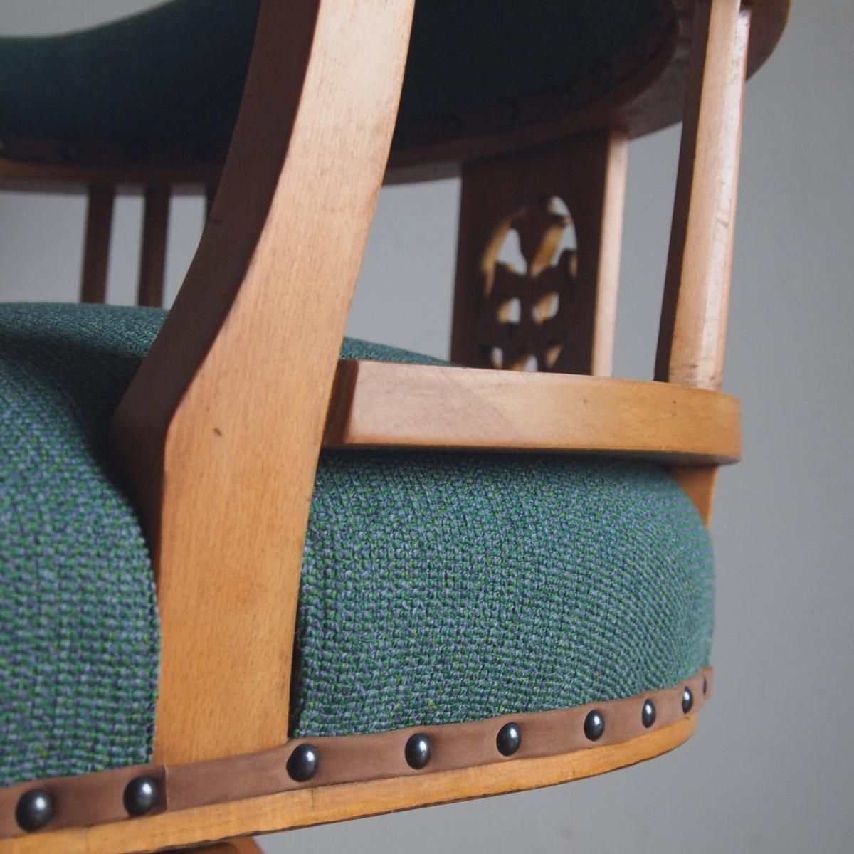 背付き部分のデザインがめずらしく、とても雰囲気のある印象的な「回転椅子」。材質は「ブナ」、ファブリックはヨーロッパのデットストックで、柔らかなグリーンの布地にグレーが織り込まれた物。縁取ったレザーとの相性も良く、素敵な印象が残ります。しっかりとした造りで座り心地もよく、年を重ねていくことに味わい深くなりそうです。