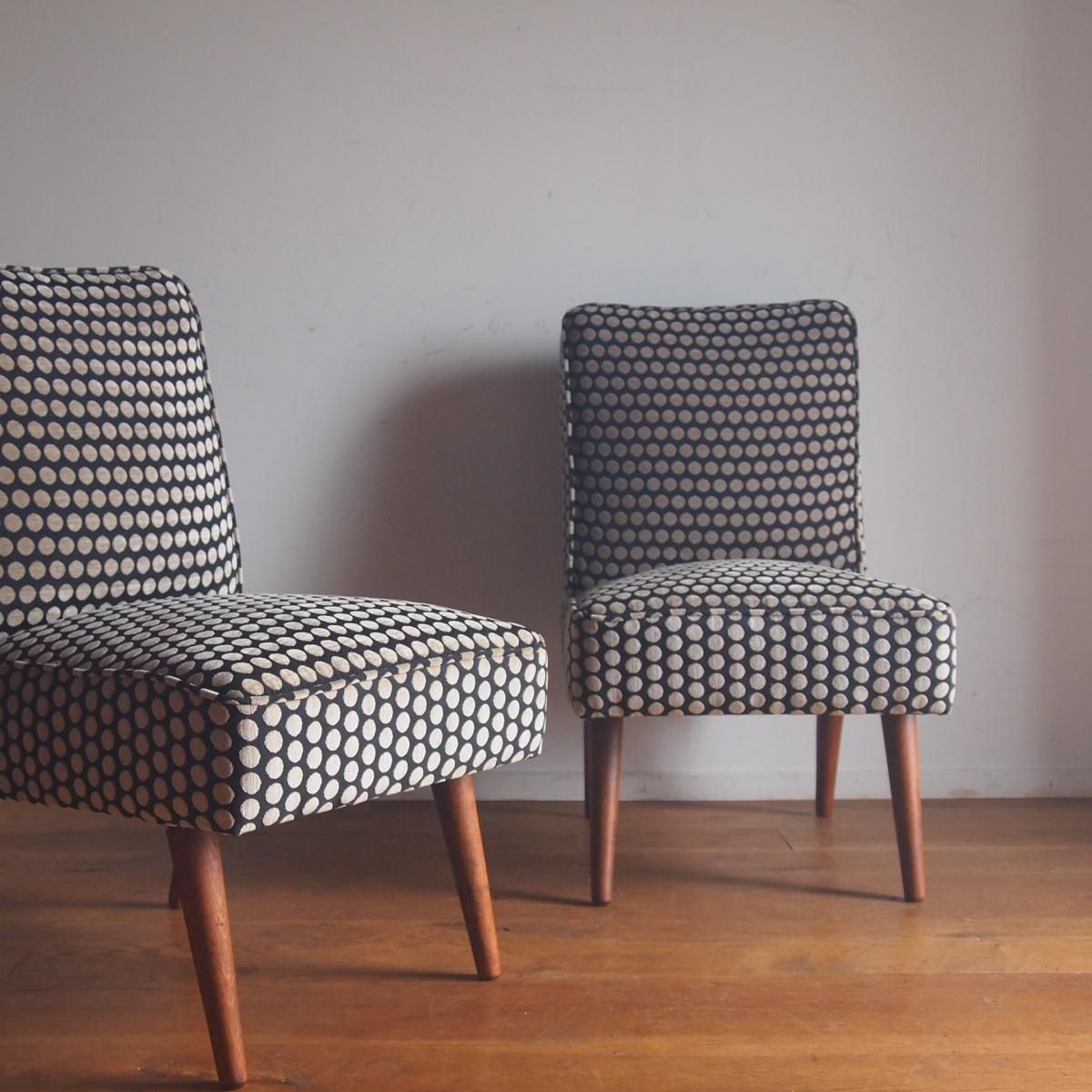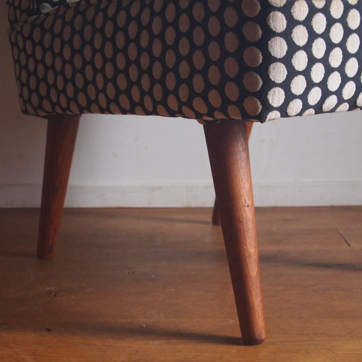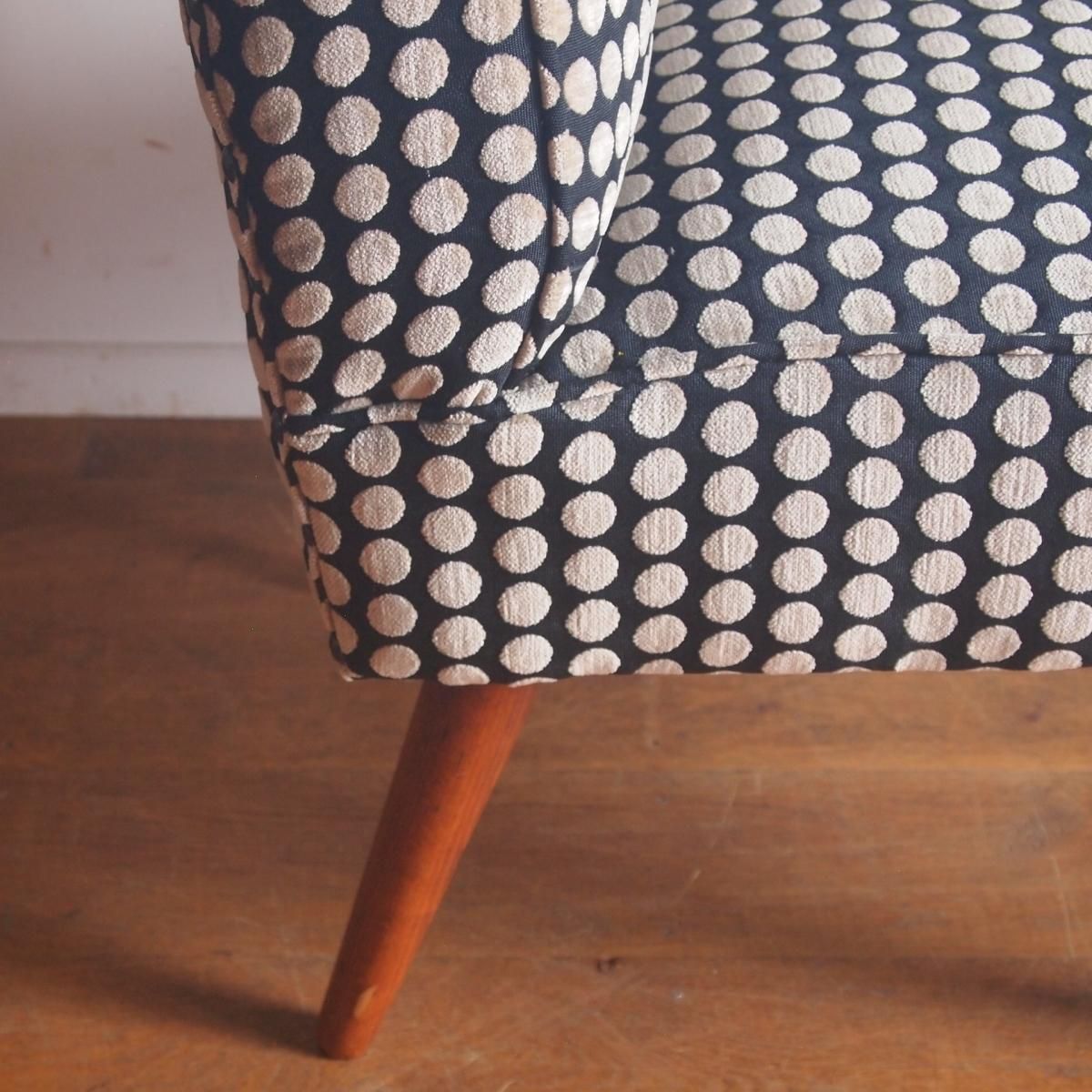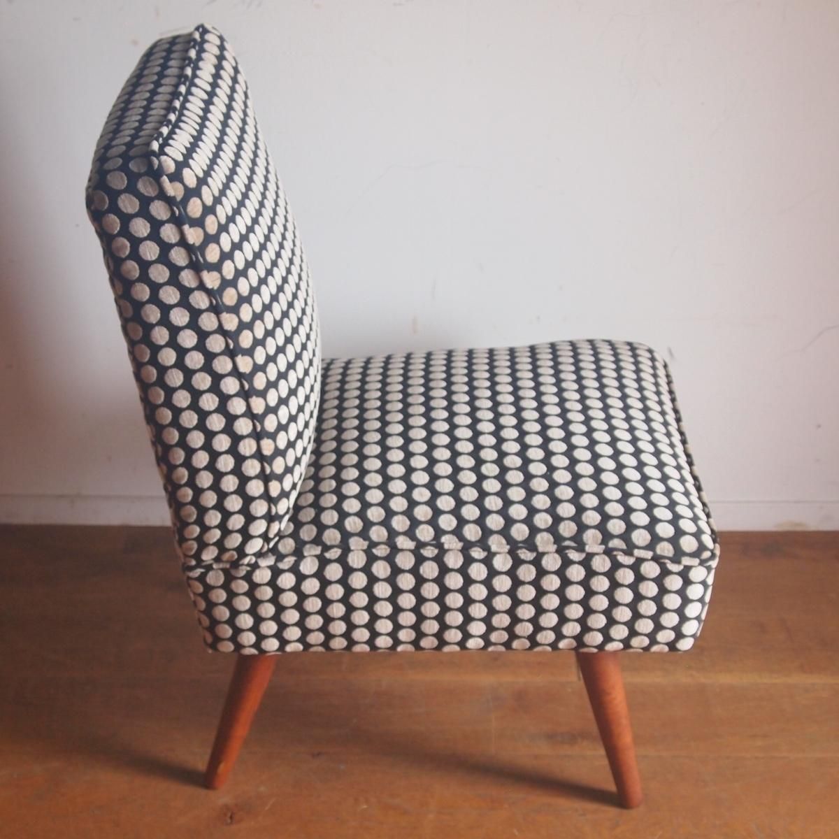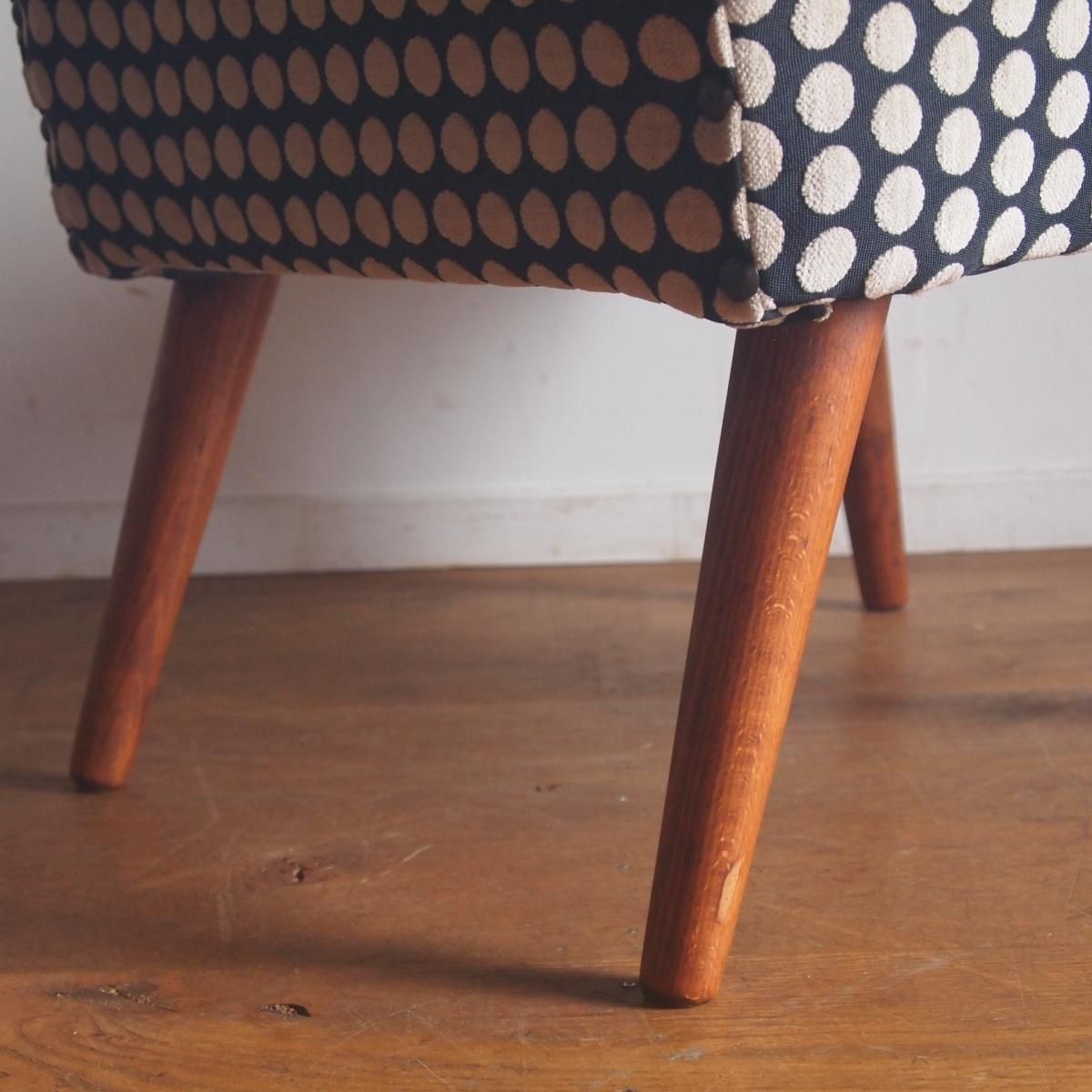 "ひじ掛けの無い、ミニマムな印象の一人掛け「ソファ」。脚のラインも、すっきりと綺麗なライン、座面、背面は全てドットのファブリックを張り直し、パイピングをすることで、表情が豊かになりました。軽やかな印象で、座り心地はゆったりとしていて、素敵なバランスです。