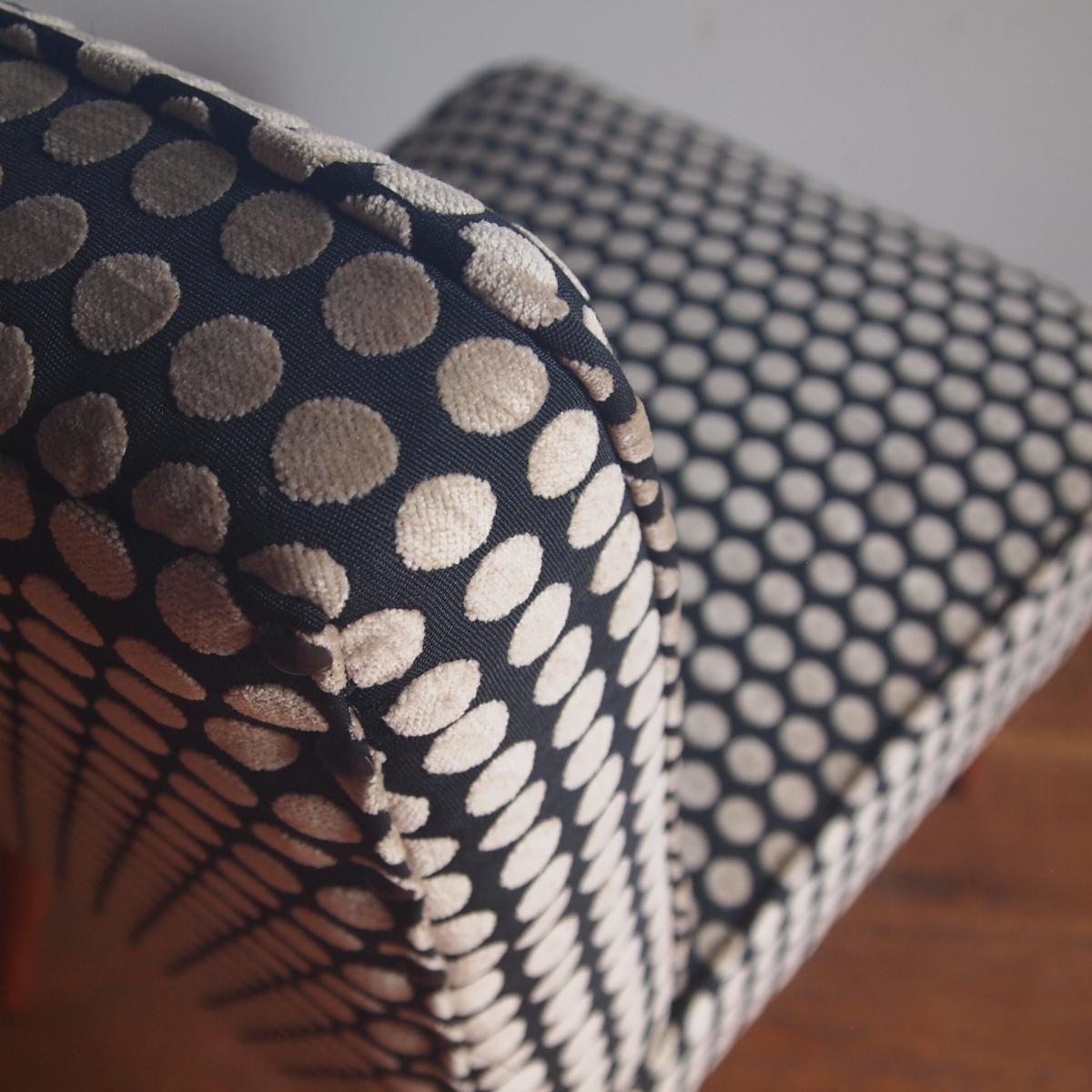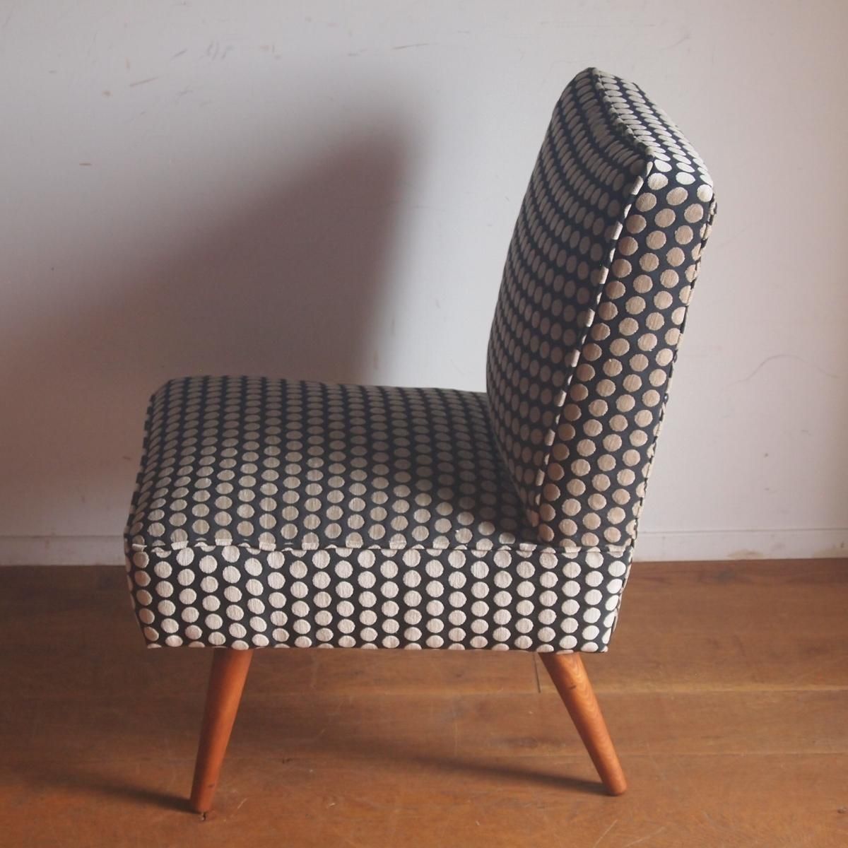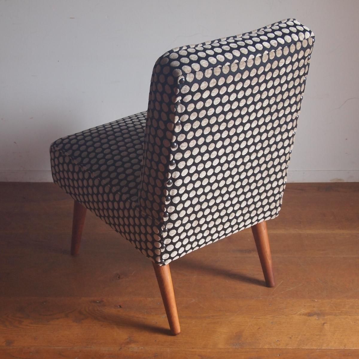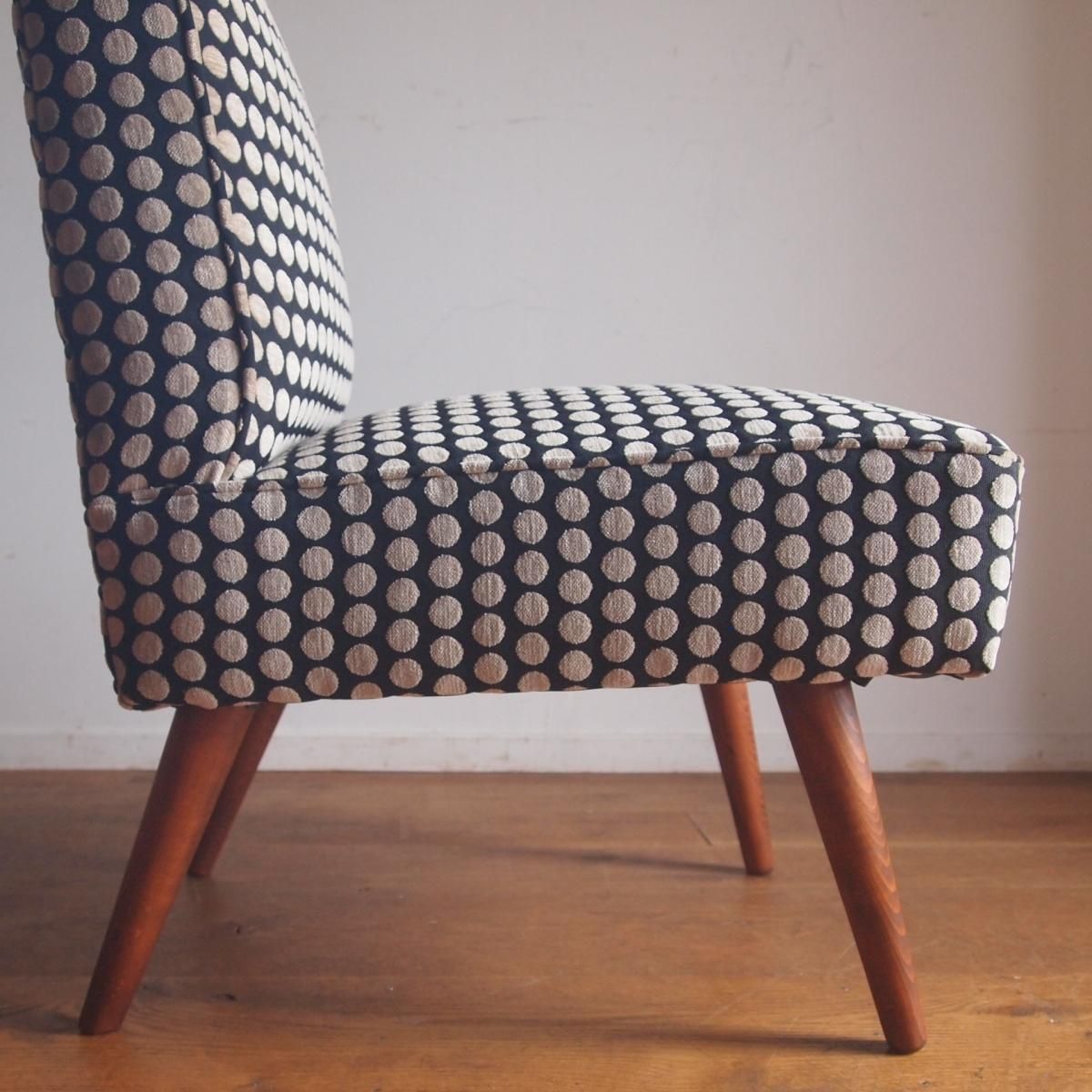 "ひじ掛けの無い、ミニマムな印象の一人掛け「ソファ」。脚のラインも、すっきりと綺麗なライン、座面、背面は全てドットのファブリックを張り直し、パイピングをすることで、表情が豊かになりました。軽やかな印象で、座り心地はゆったりとしていて、素敵なバランスです。