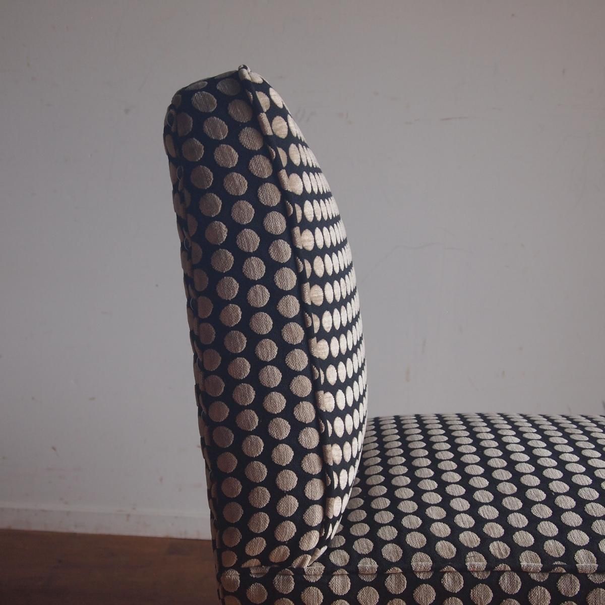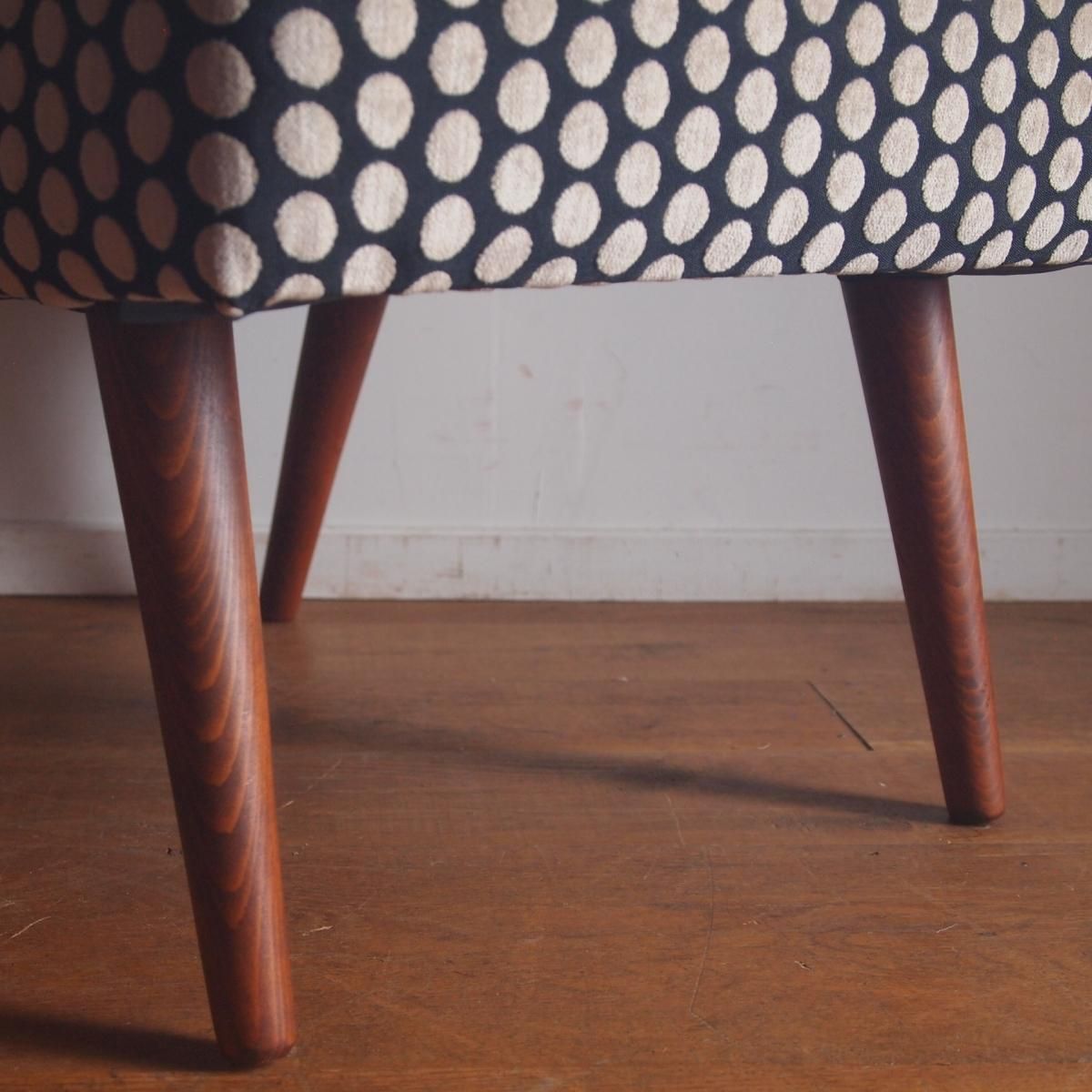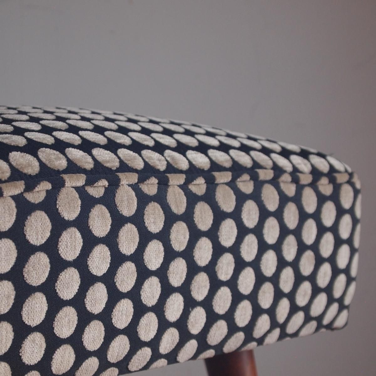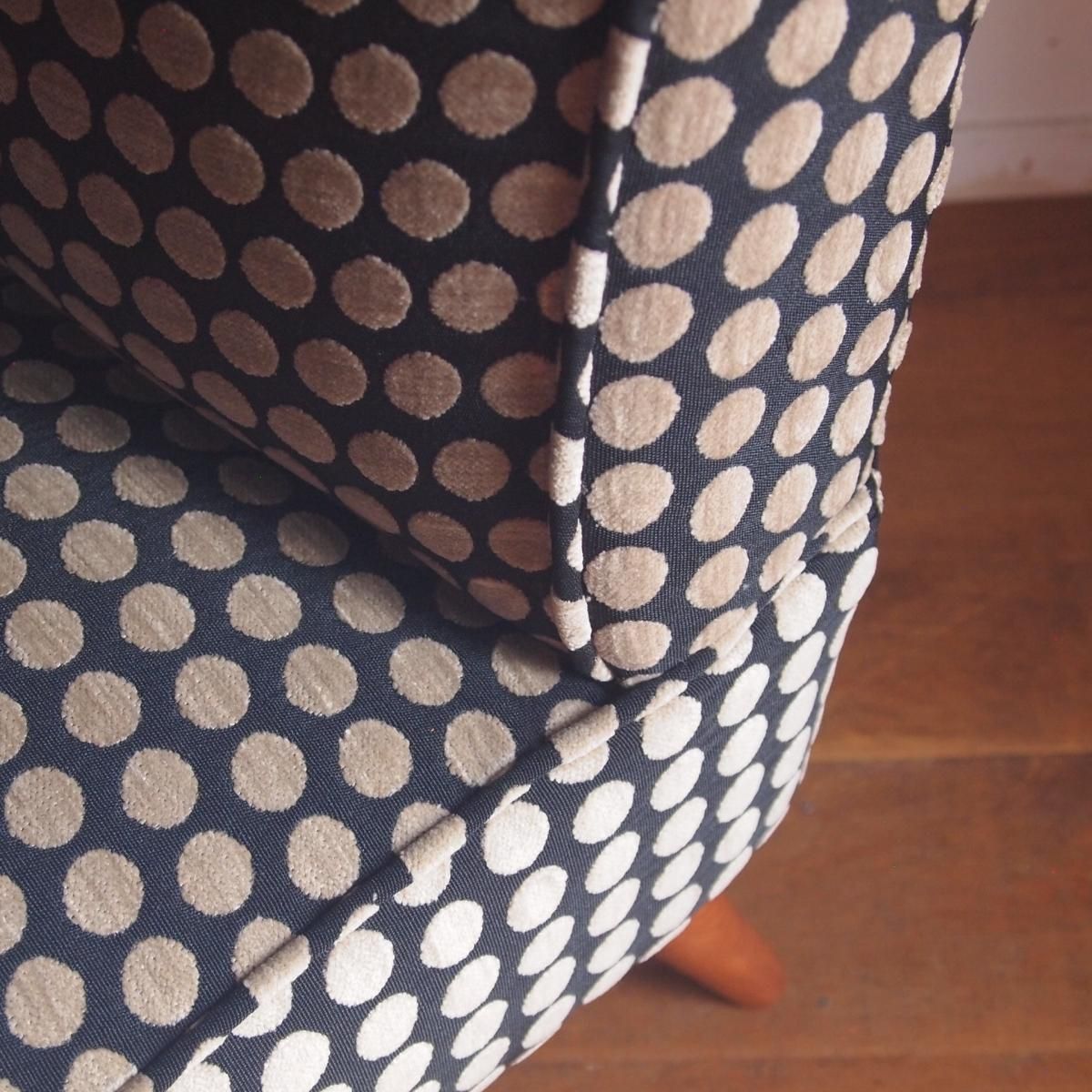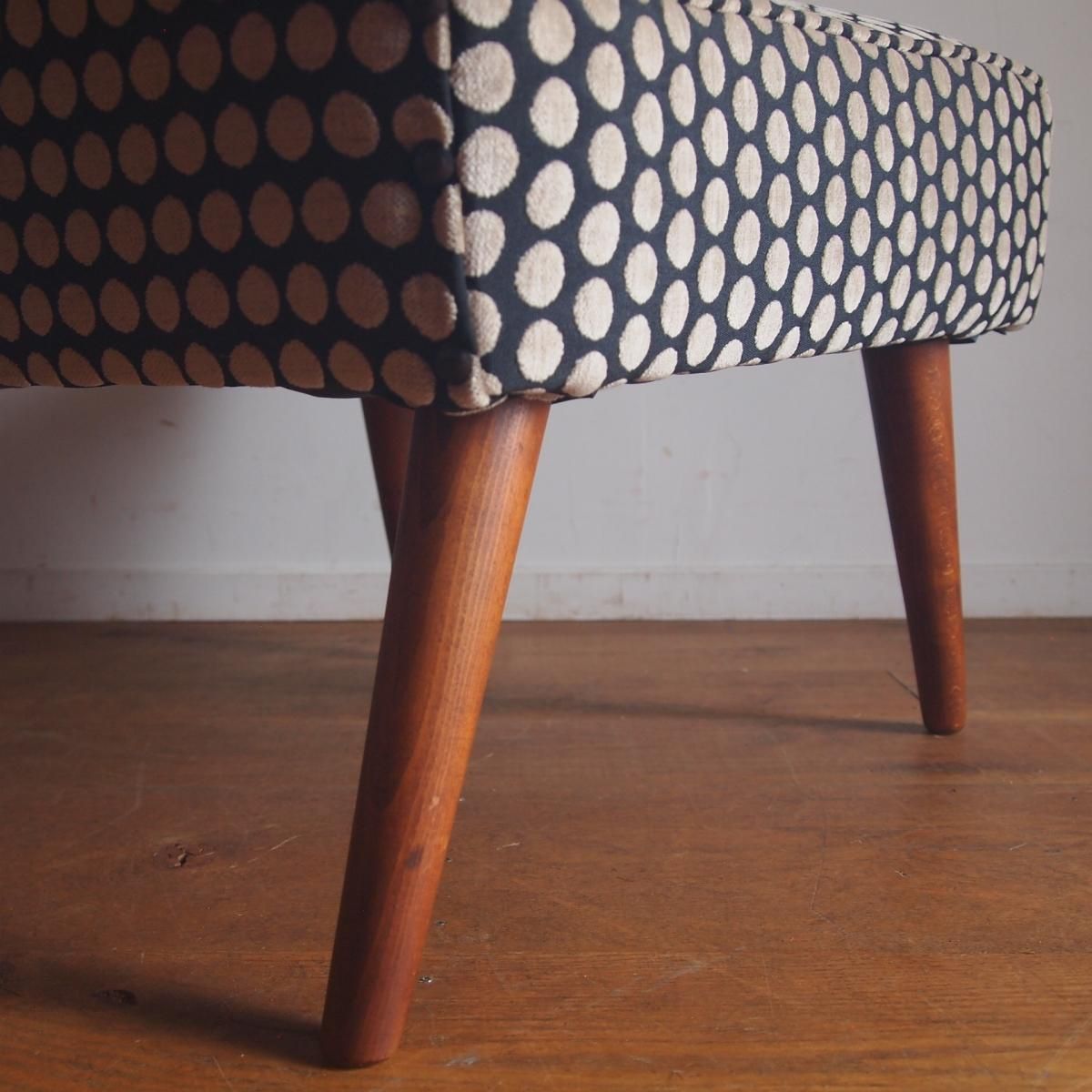 "ひじ掛けの無い、ミニマムな印象の一人掛け「ソファ」。脚のラインも、すっきりと綺麗なライン、座面、背面は全てドットのファブリックを張り直し、パイピングをすることで、表情が豊かになりました。軽やかな印象で、座り心地はゆったりとしていて、素敵なバランスです。