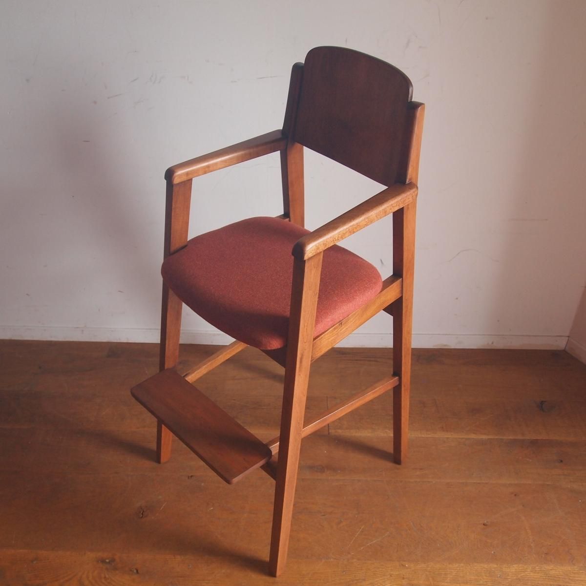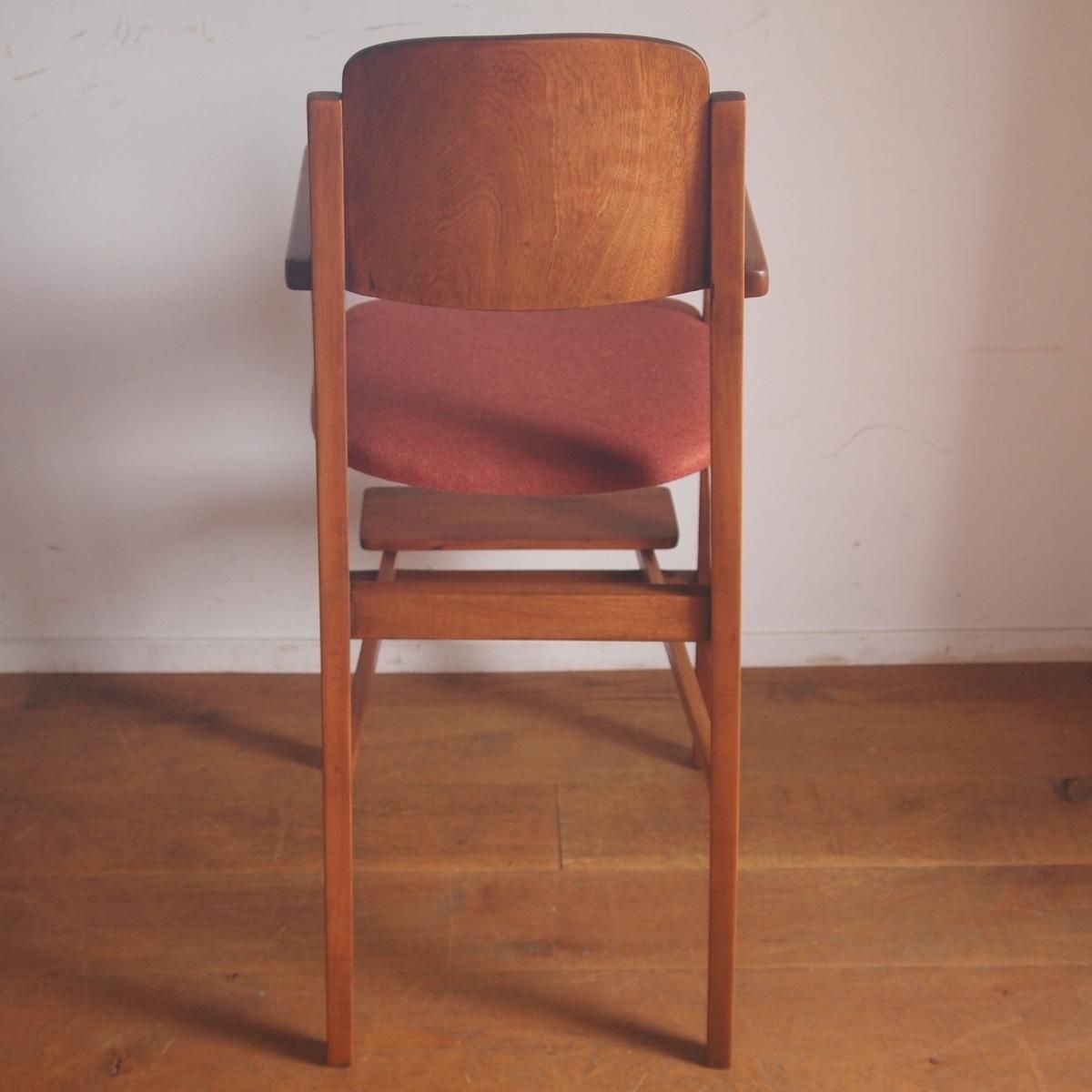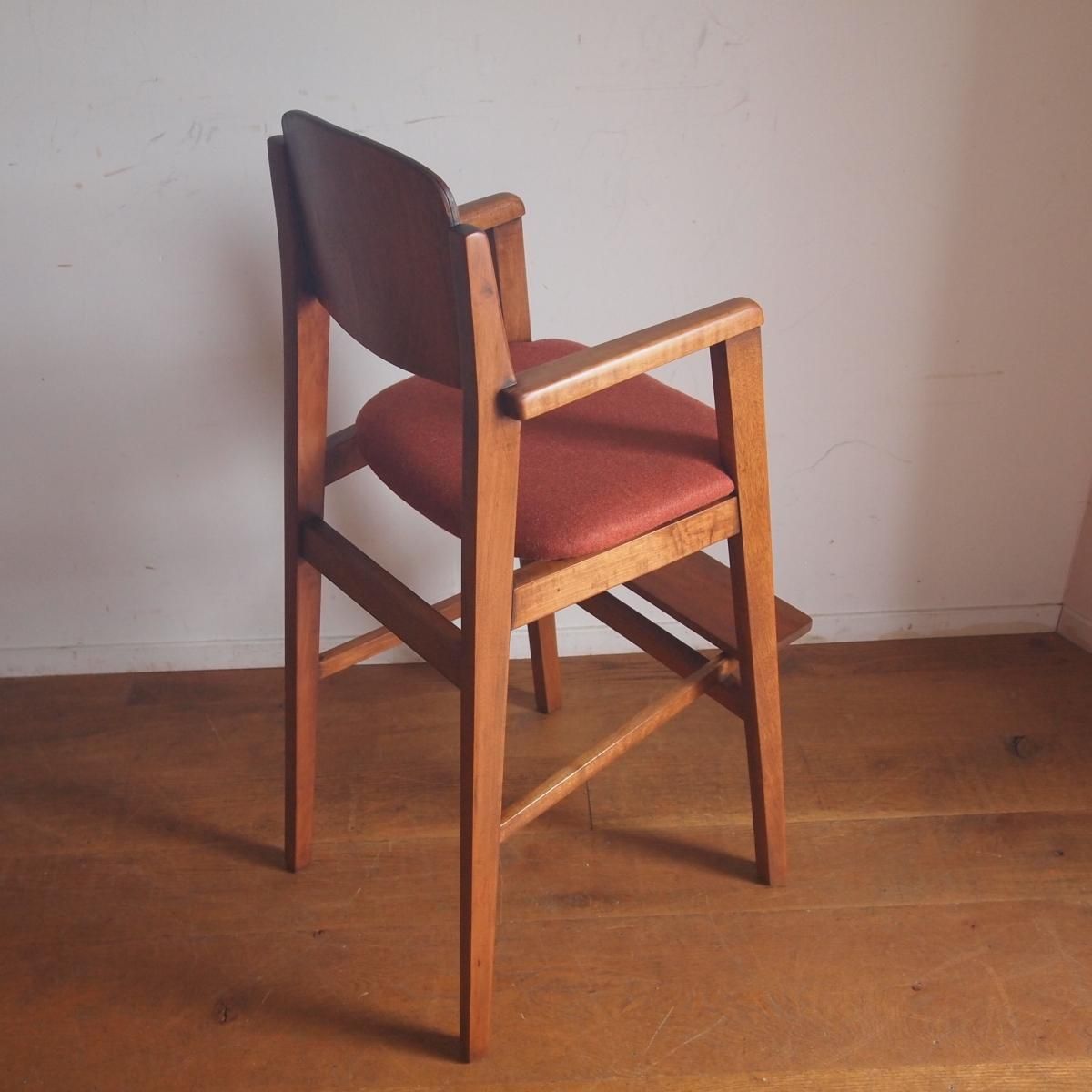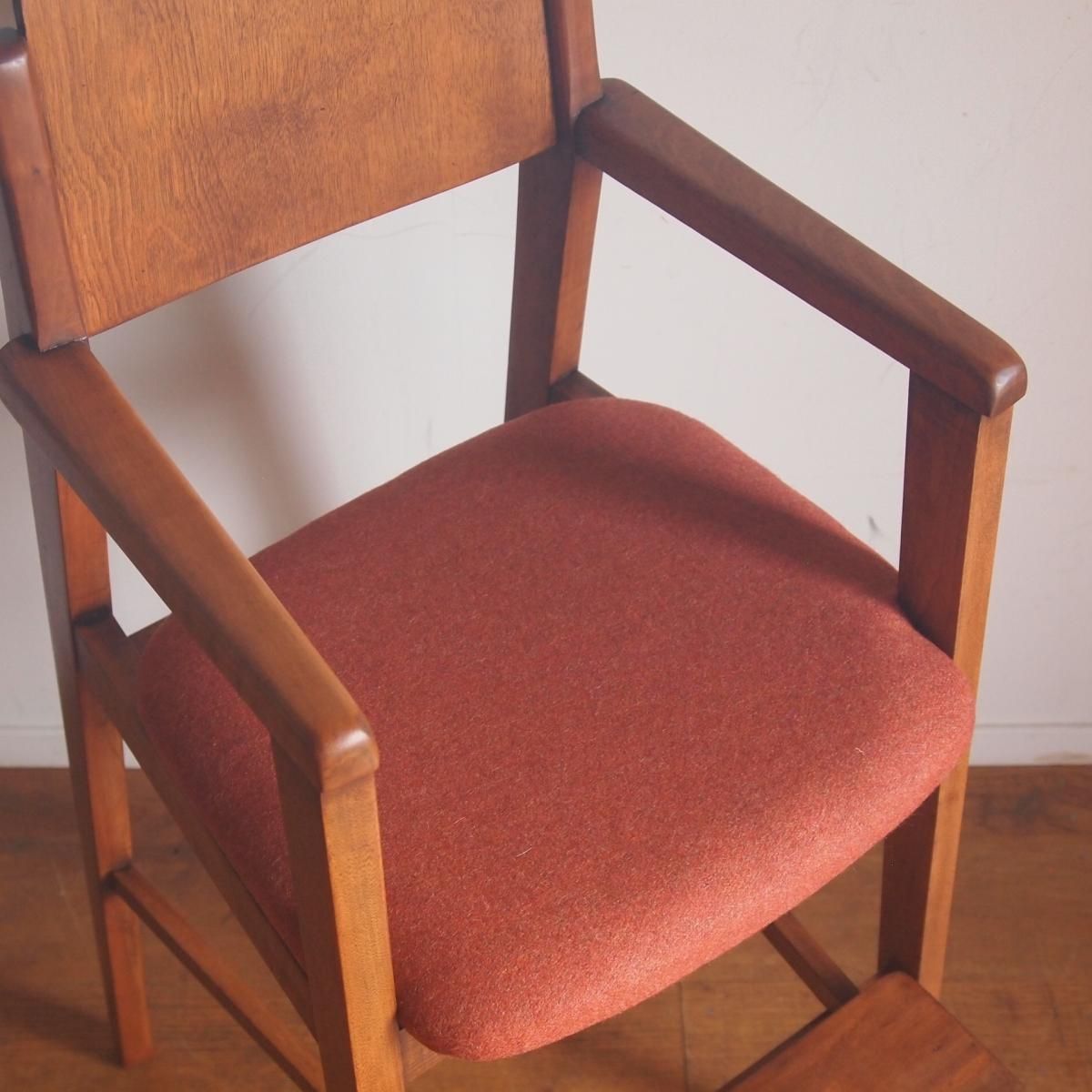 "すっきりと綺麗な印象の「ベビーチェア」。無駄のないデザインで、柔らかなラインが魅力的。ファブリックは、温もりを感じるウール混のファブリック。イタリア製で、柔らかな発色がとても綺麗です。お部屋のどんなシーンでも馴染みやすい、コーラルオレンジのファブリックを張り直しました。