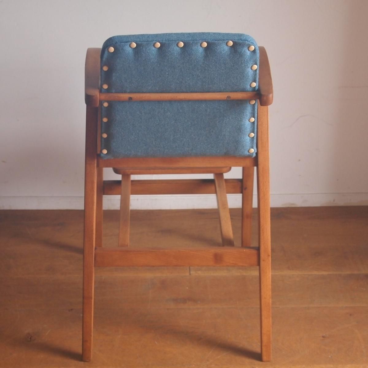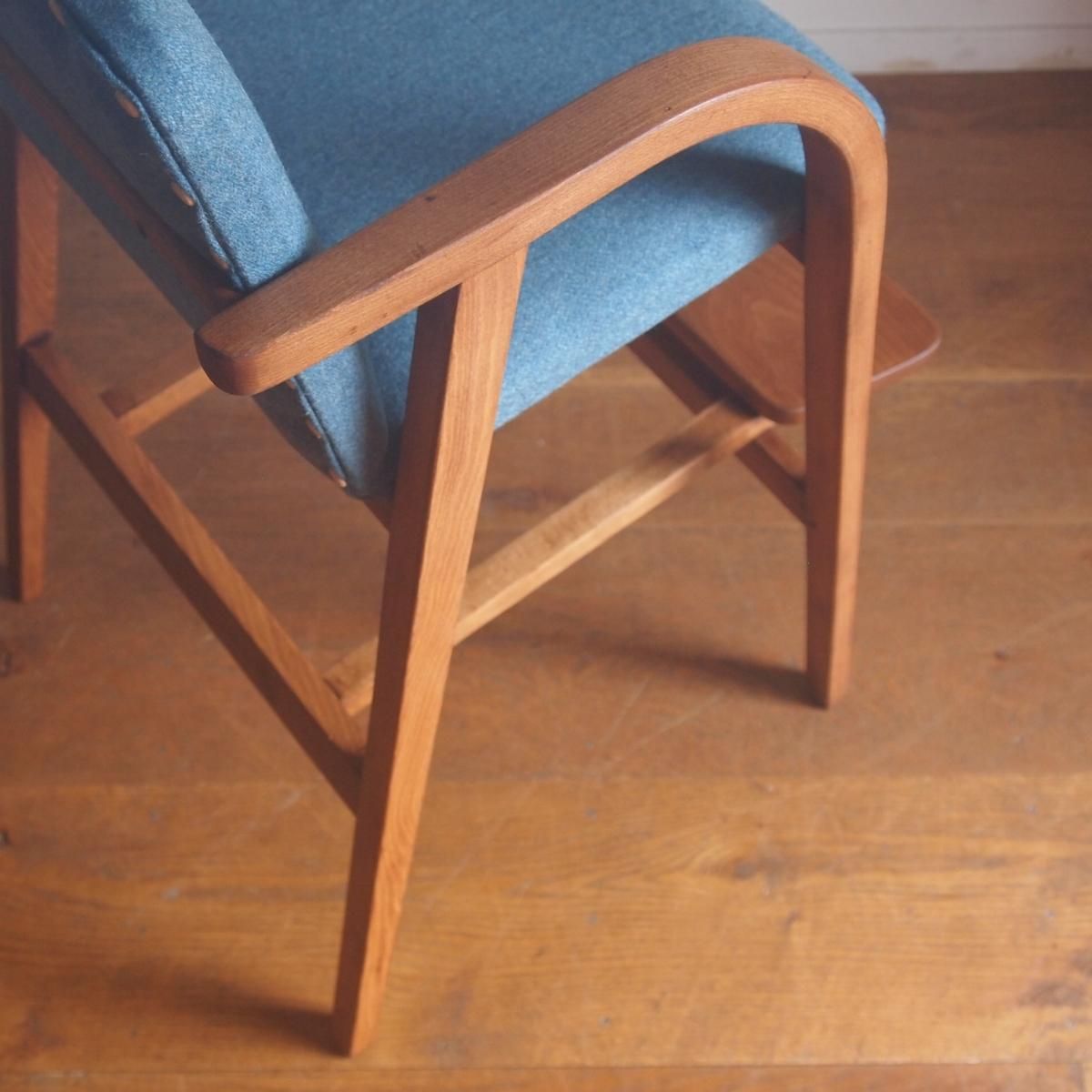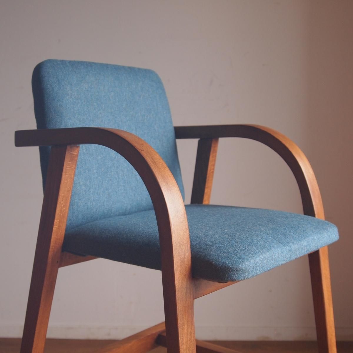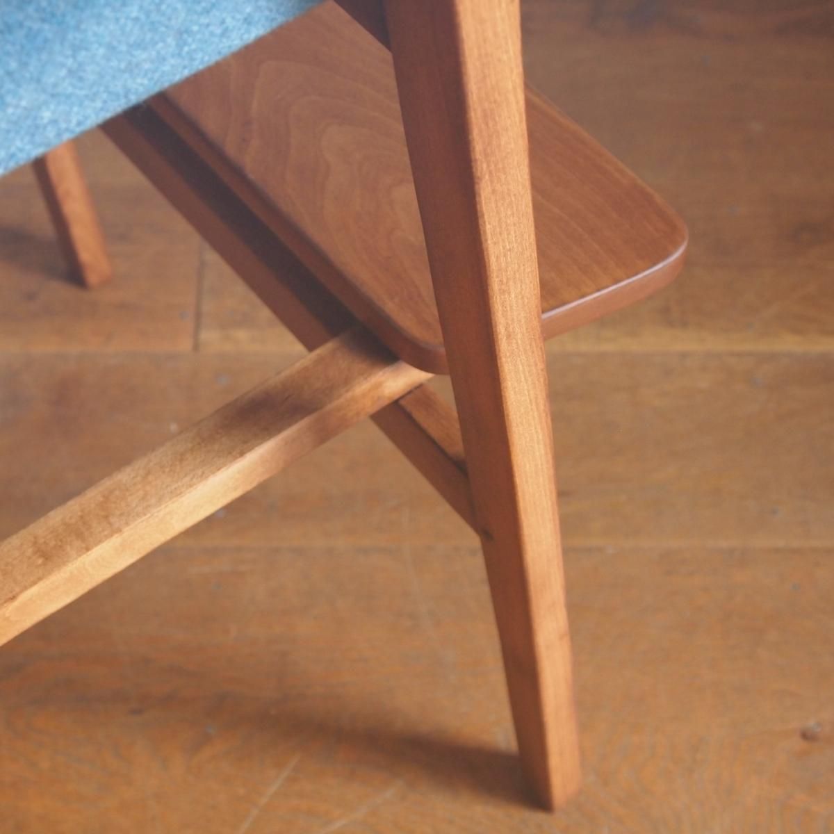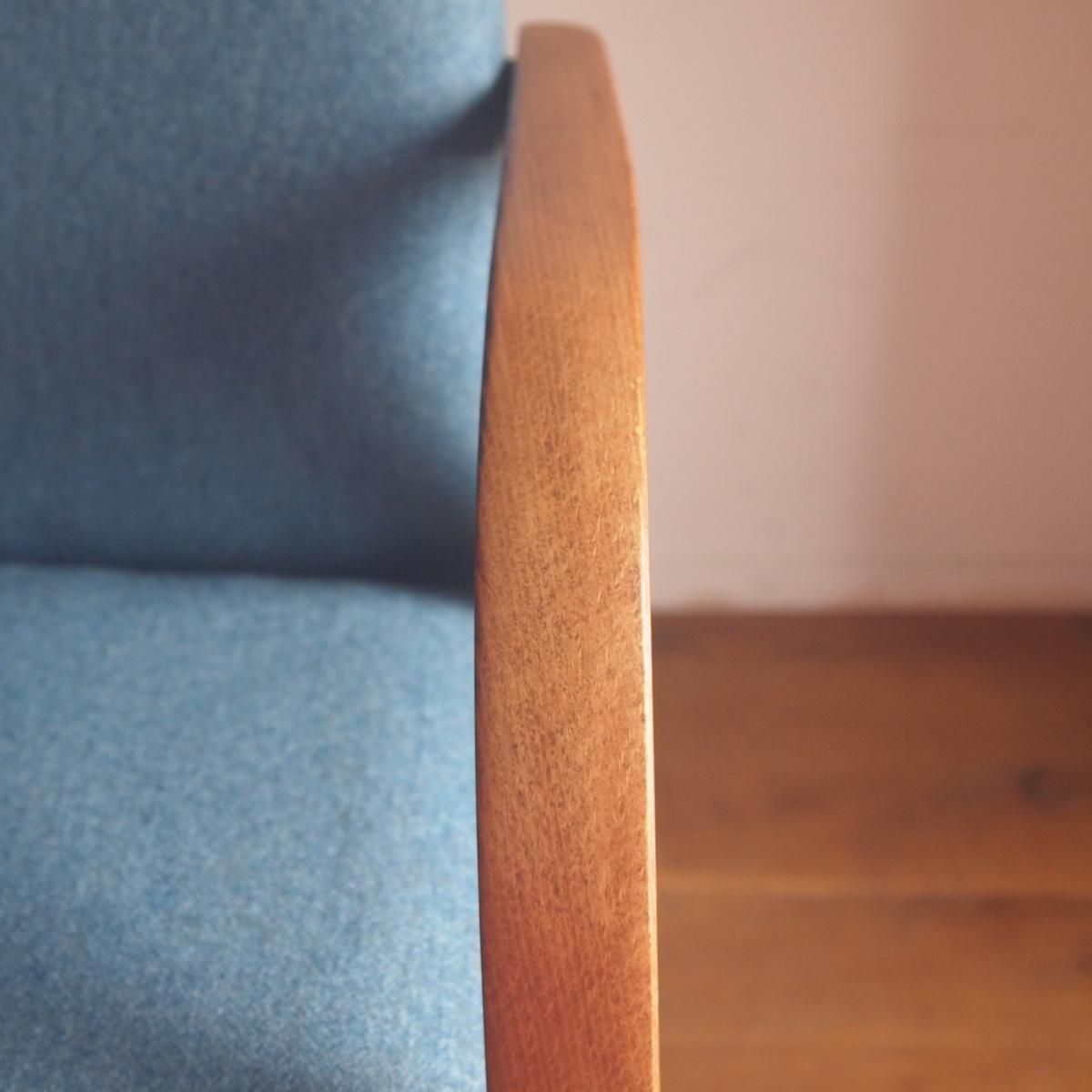 "すっきりと綺麗な印象の「ベビーチェア」。無駄のないデザインで、柔らかなラインが魅力的。ファブリックは、温もりを感じるウール混のファブリック。イタリア製で、柔らかな発色がとても綺麗です。お部屋のどんなシーンでも馴染みやすい、モスブルーのファブリックを張り直しました。