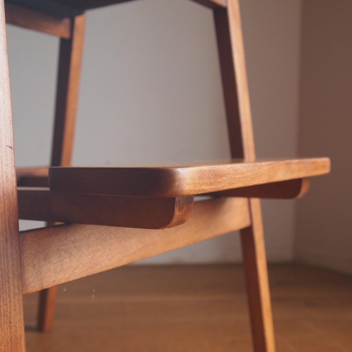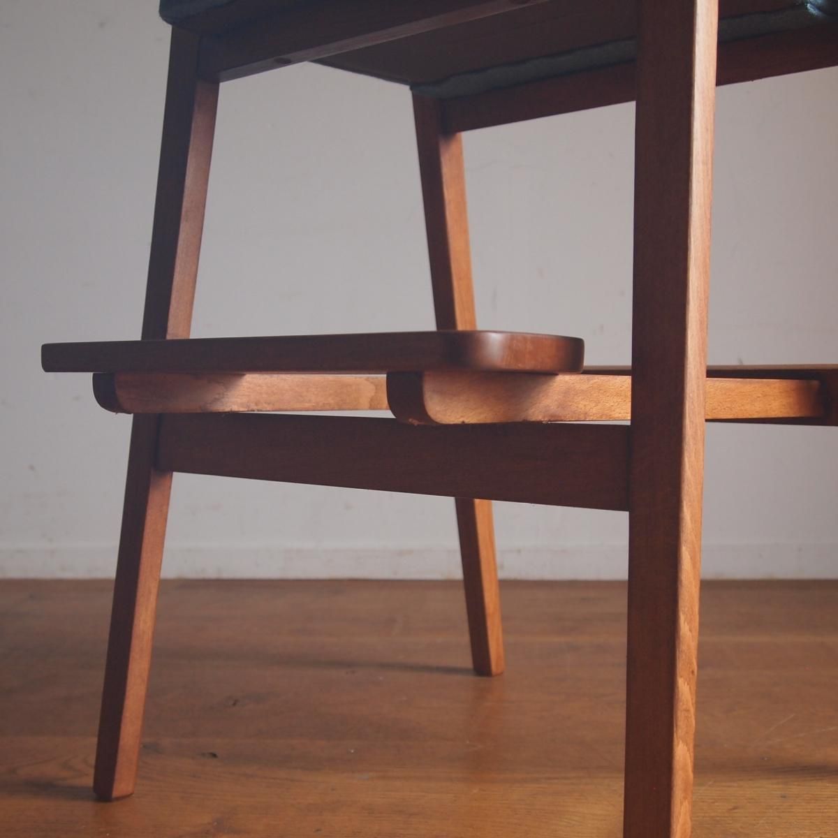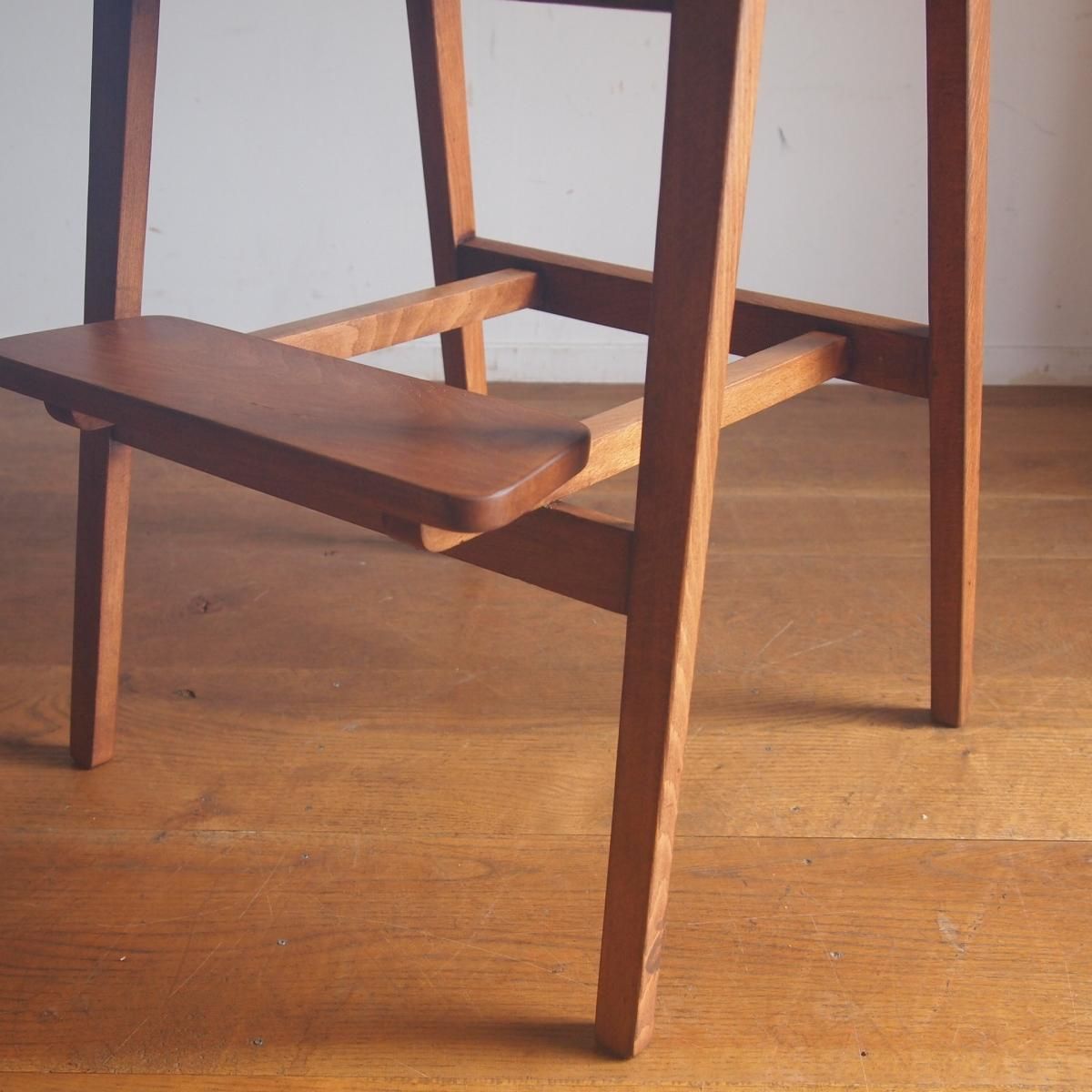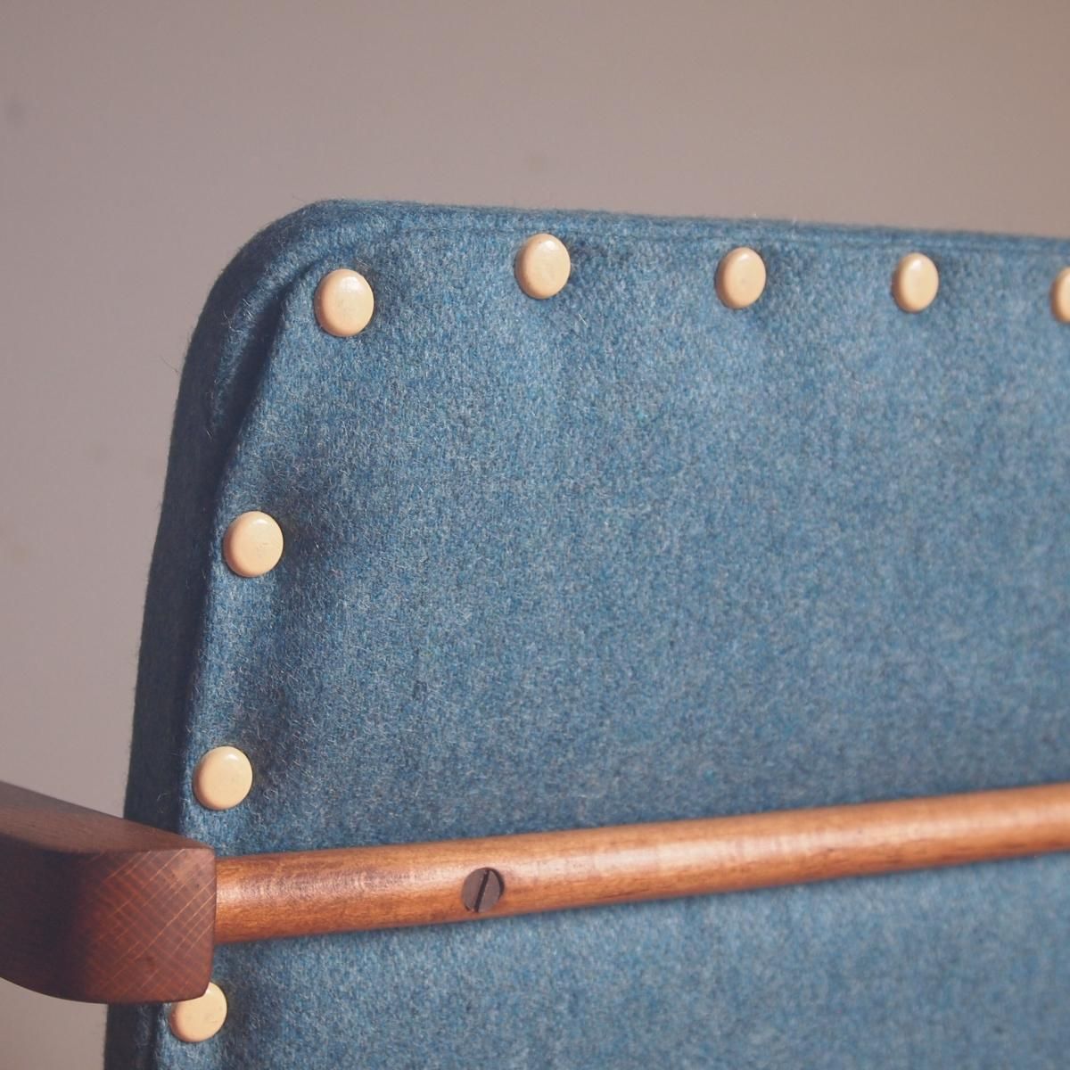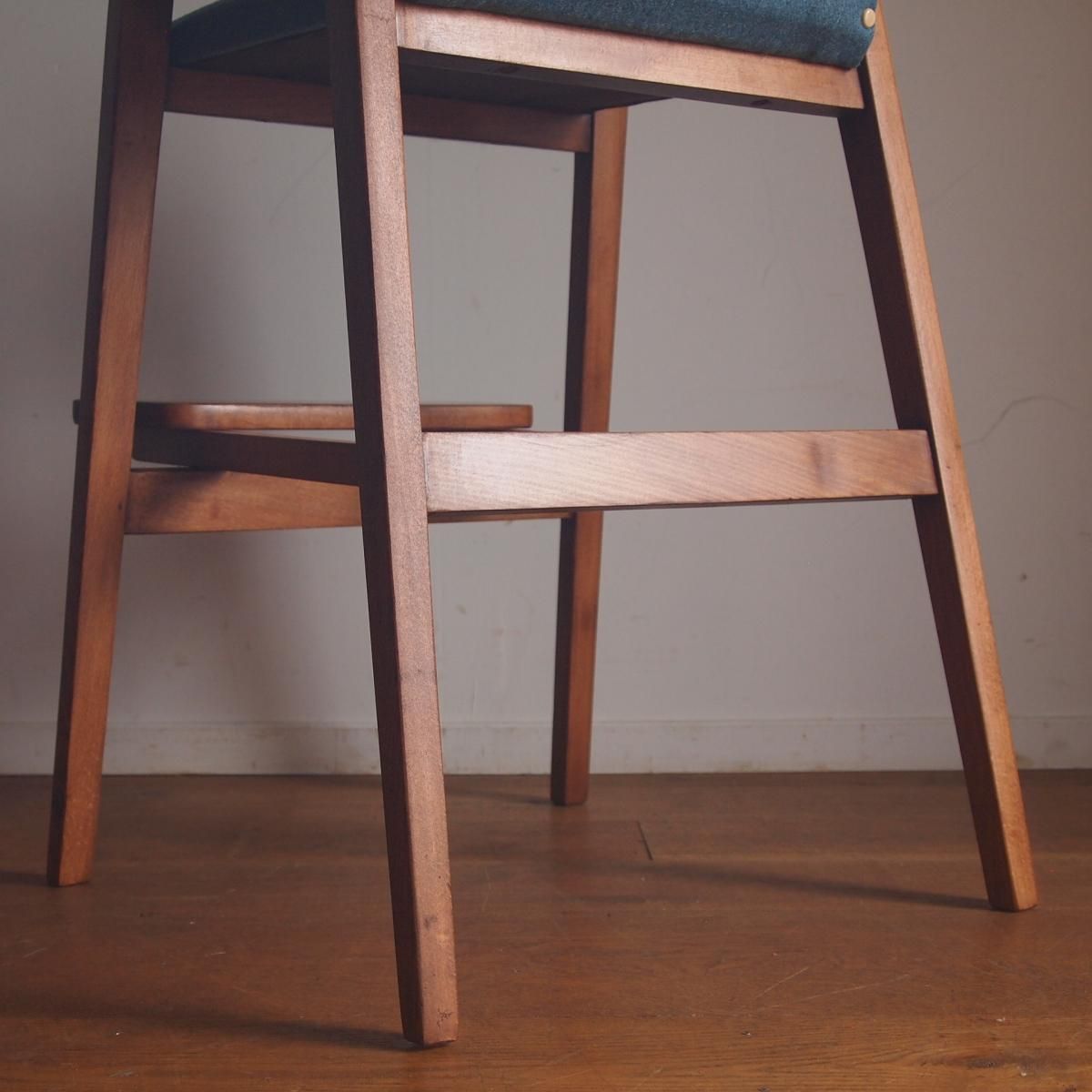 "すっきりと綺麗な印象の「ベビーチェア」。無駄のないデザインで、柔らかなラインが魅力的。ファブリックは、温もりを感じるウール混のファブリック。イタリア製で、柔らかな発色がとても綺麗です。お部屋のどんなシーンでも馴染みやすい、モスブルーのファブリックを張り直しました。