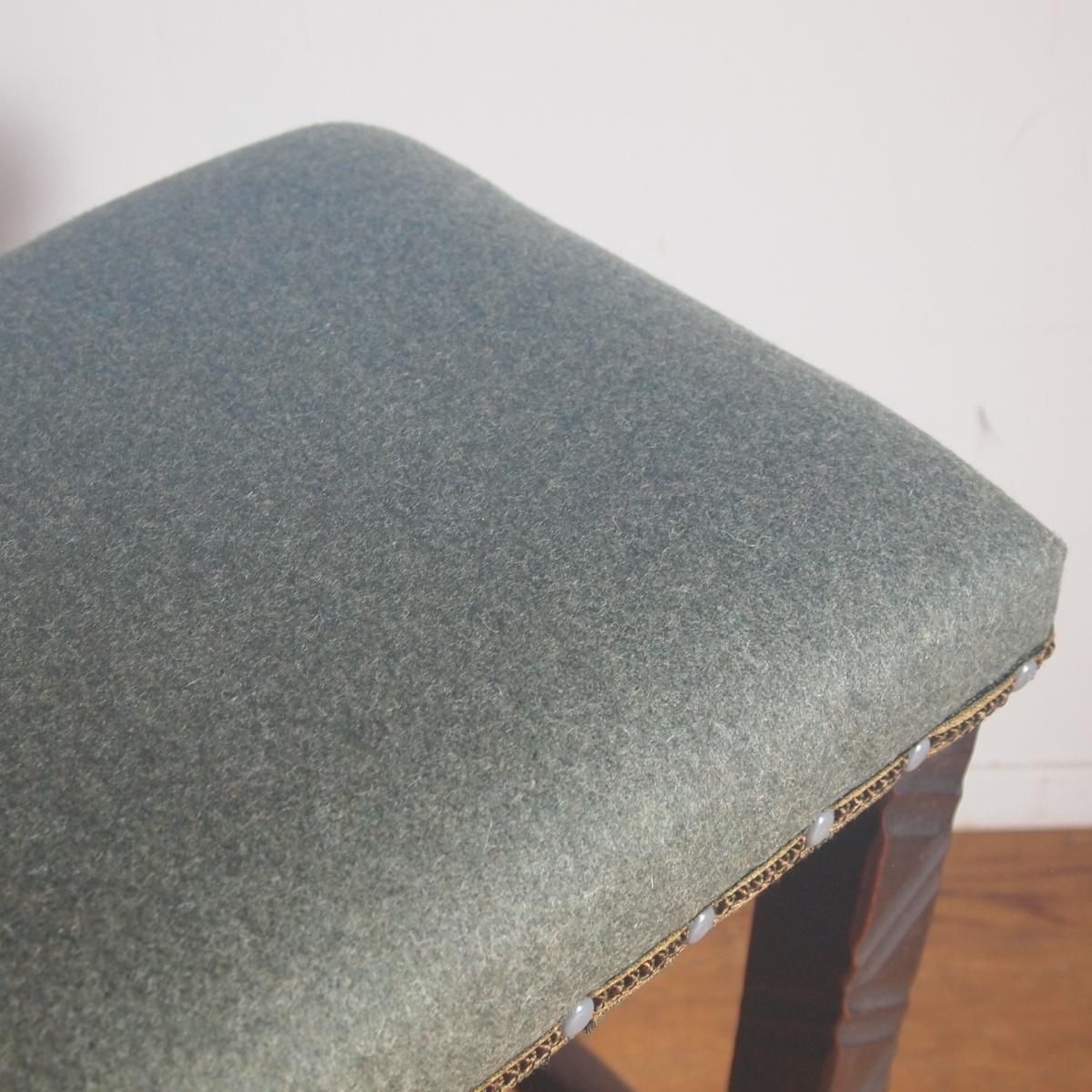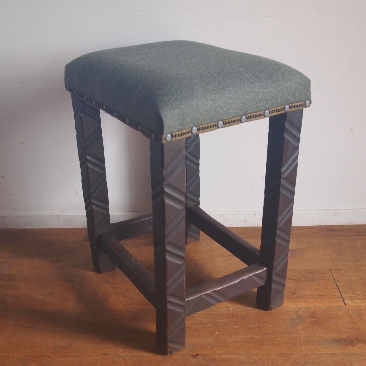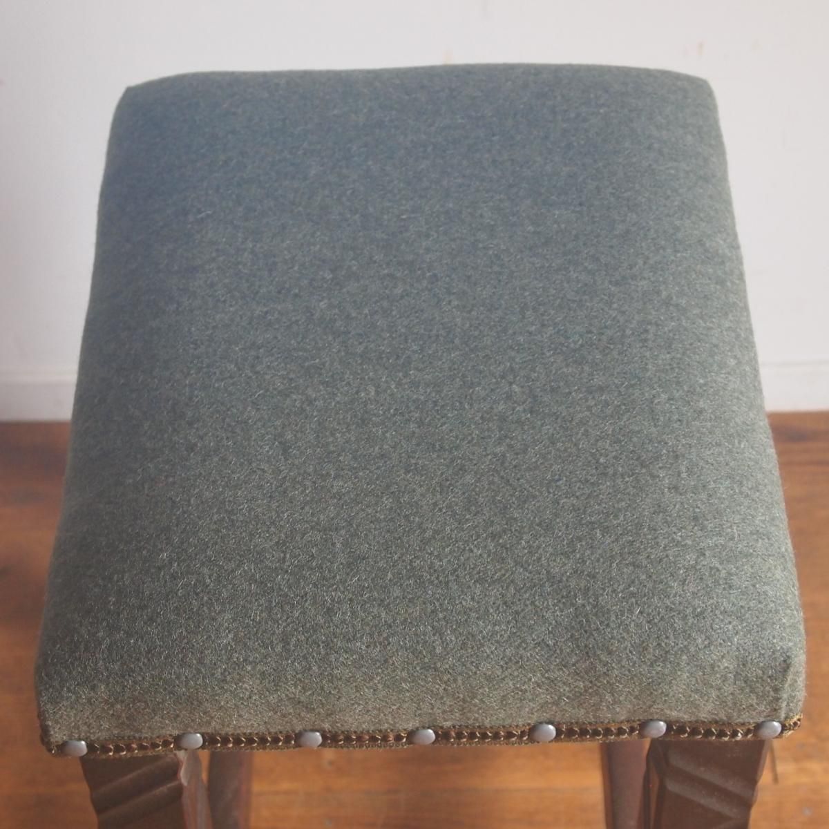 脚に飾り彫りが施され、民芸家具のような雰囲気の「スツール」。木地は深いブラウン色で、味わい深く、しっかりとした印象。使っていくうちに、また味わいが楽しめそうです。面は広く、安定感のある座り心地。男性の方でも大丈夫です。色は、カーキ色。ファブリックは、温もりを感じるウール混のファブリック。イタリア製で、柔らかな発色がとても綺麗です。お部屋のどんなシーンでも馴染みやすく合わせやすいです。