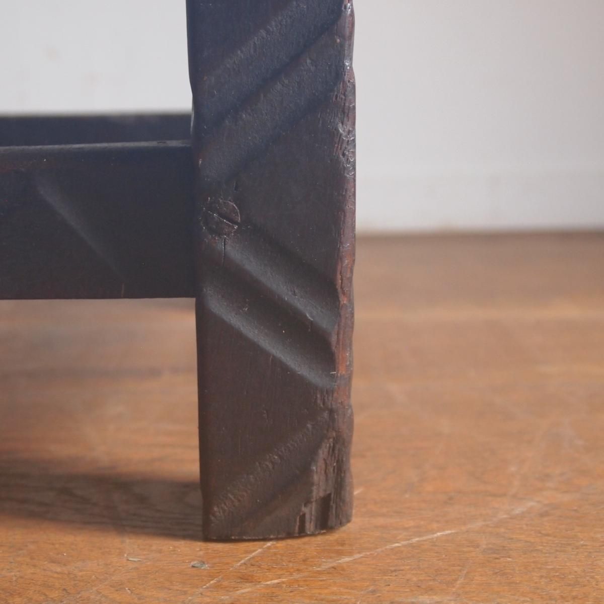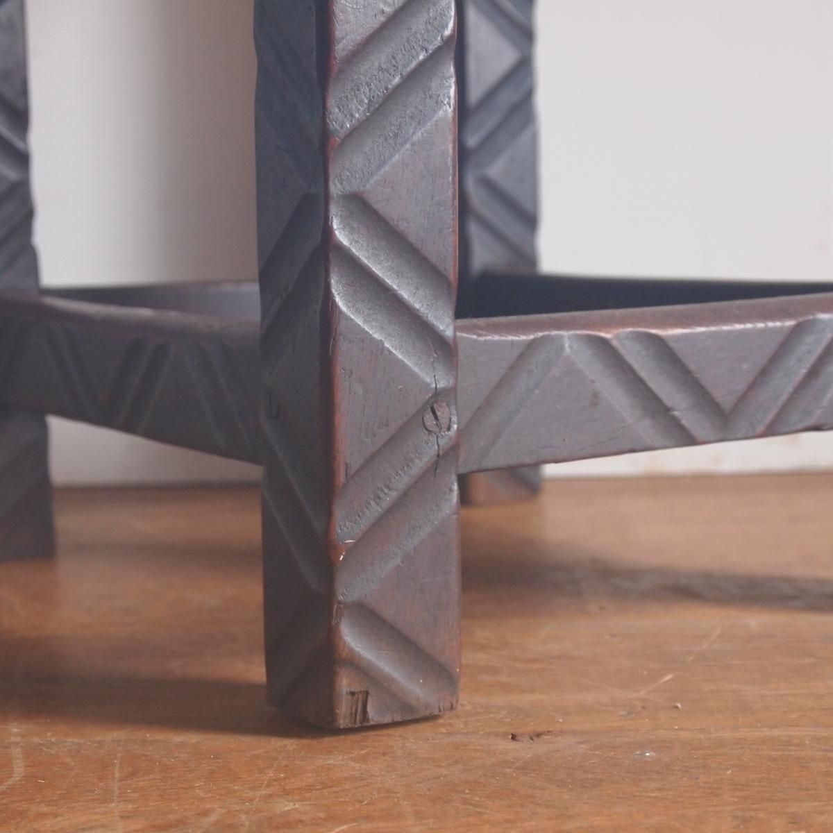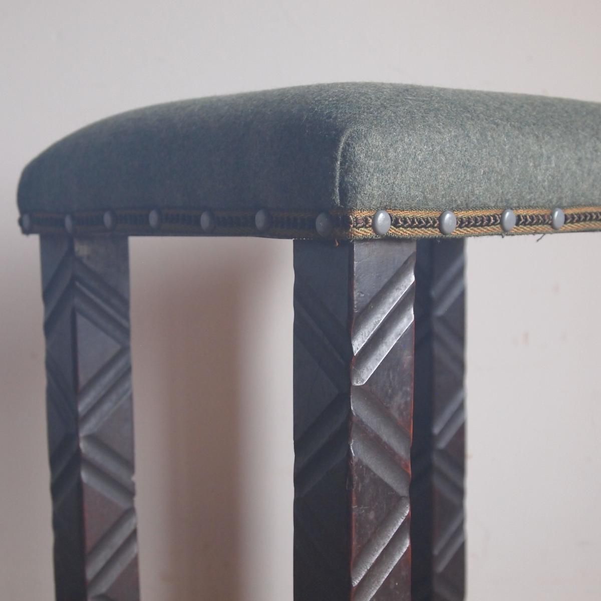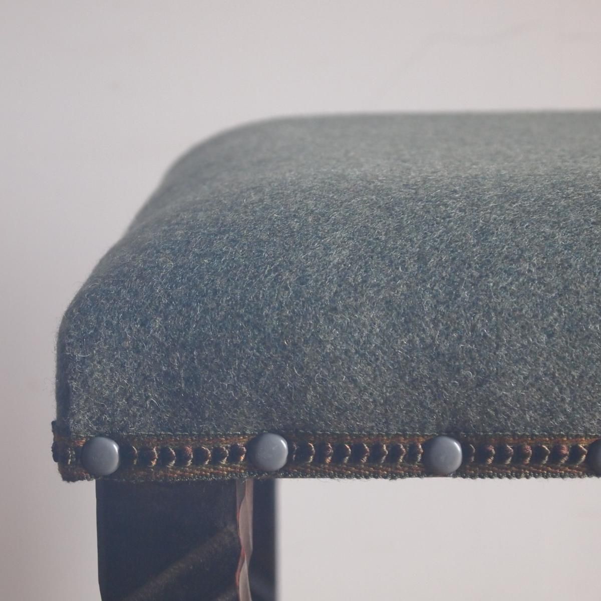 脚に飾り彫りが施され、民芸家具のような雰囲気の「スツール」。木地は深いブラウン色で、味わい深く、しっかりとした印象。使っていくうちに、また味わいが楽しめそうです。面は広く、安定感のある座り心地。男性の方でも大丈夫です。色は、カーキ色。ファブリックは、温もりを感じるウール混のファブリック。イタリア製で、柔らかな発色がとても綺麗です。お部屋のどんなシーンでも馴染みやすく合わせやすいです。