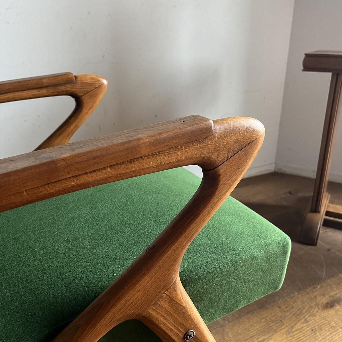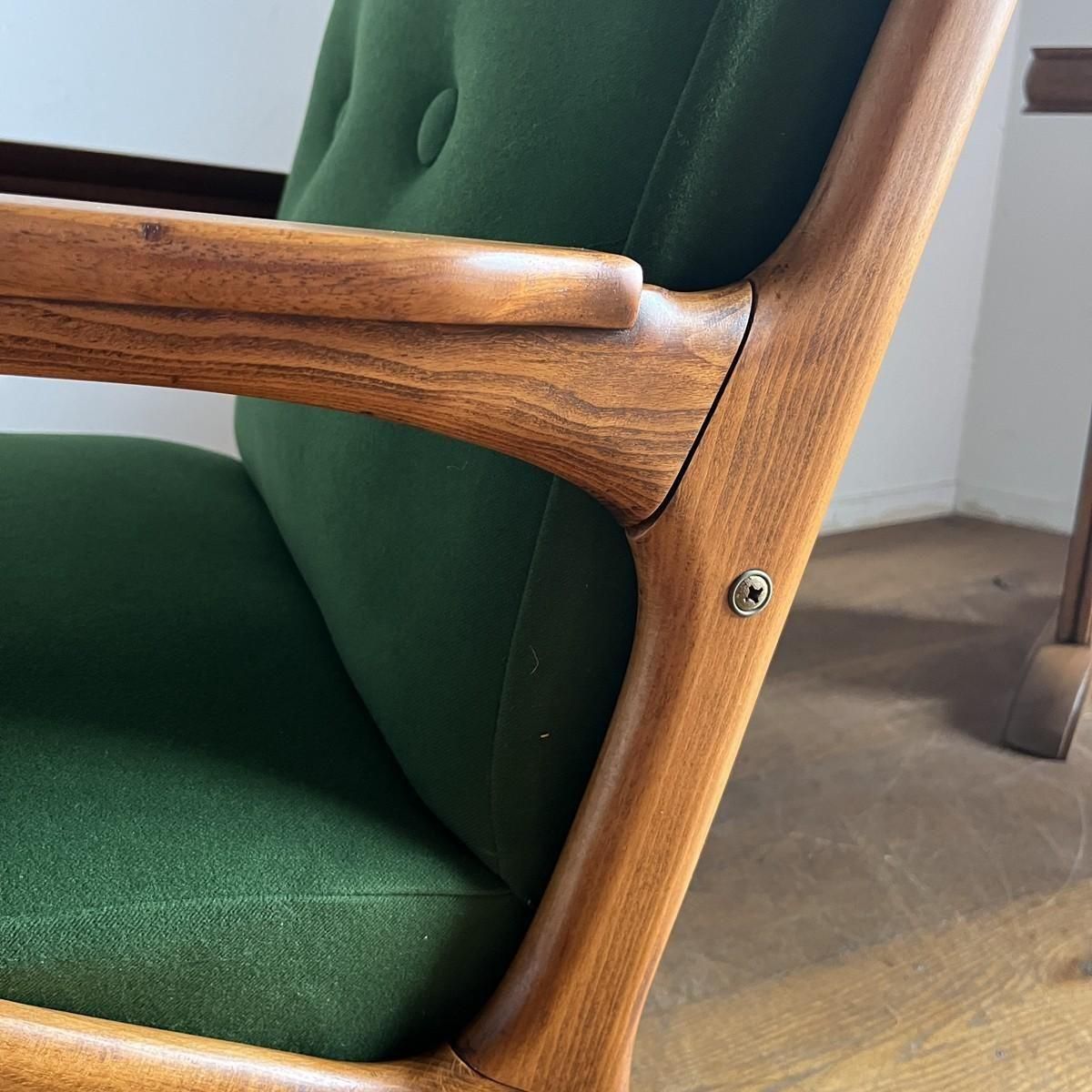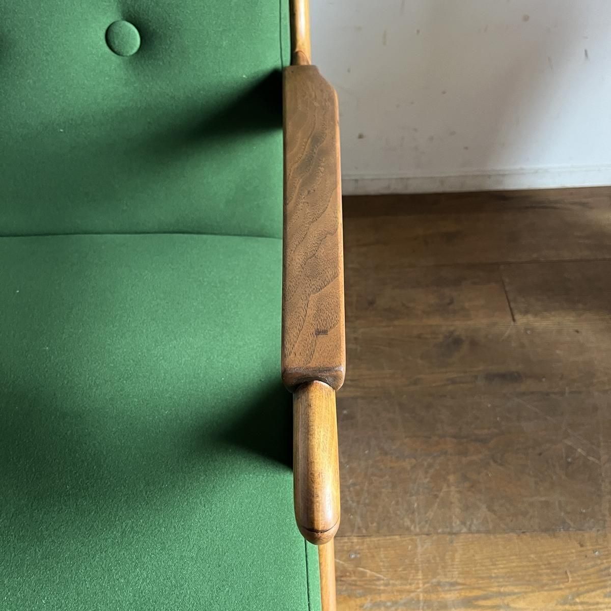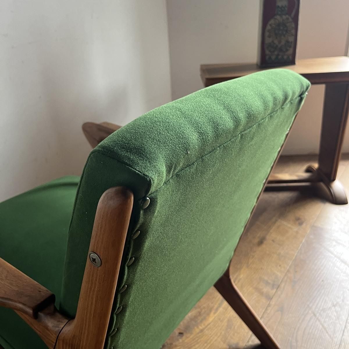 個性的なフレームラインが印象的な、古い1人掛けソファ。ファブリックは、mina perhonen、dop布地のグリーン