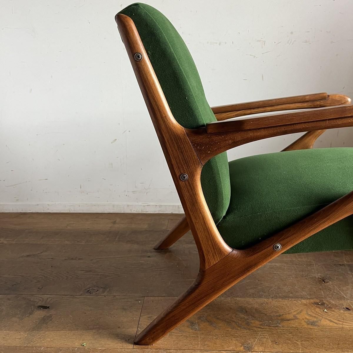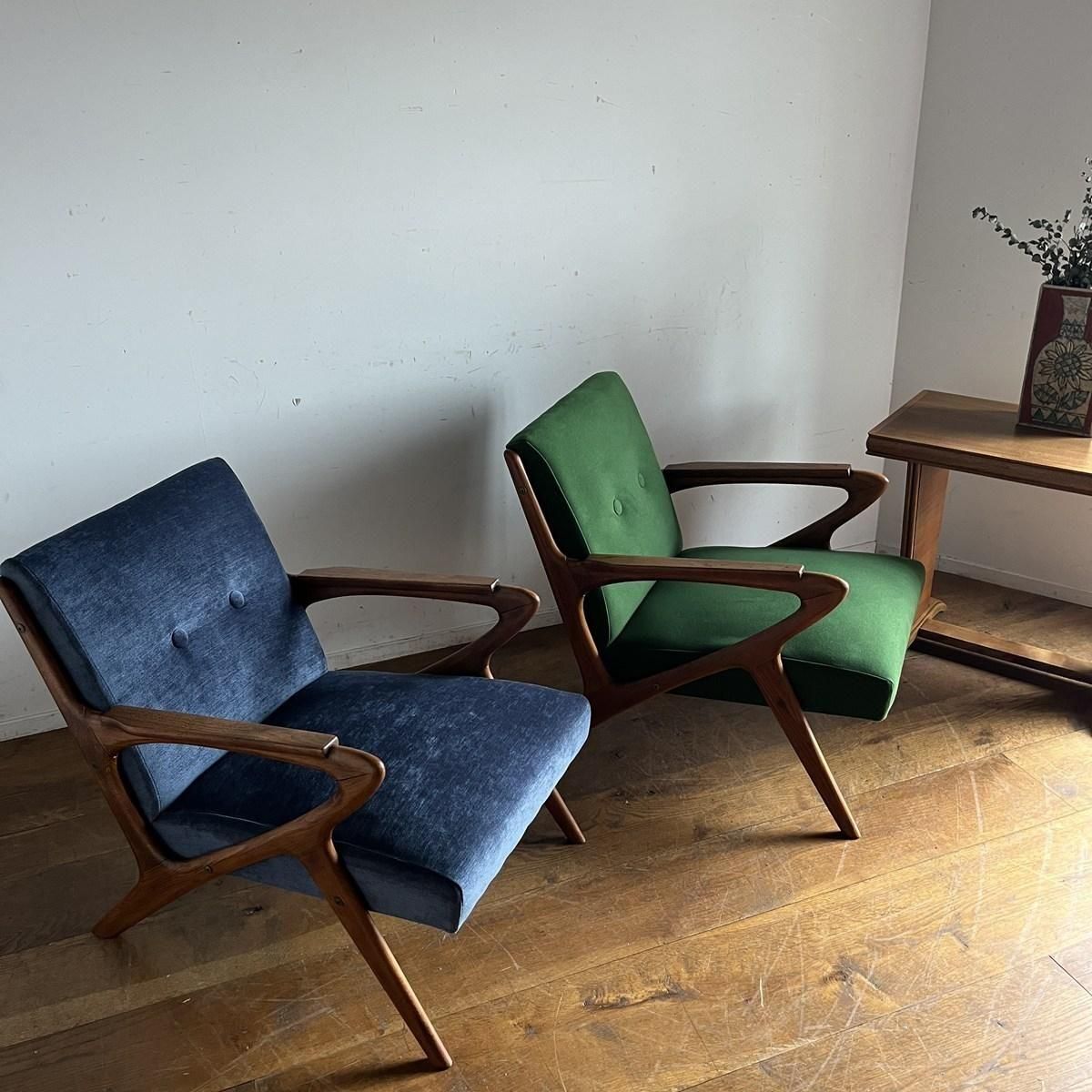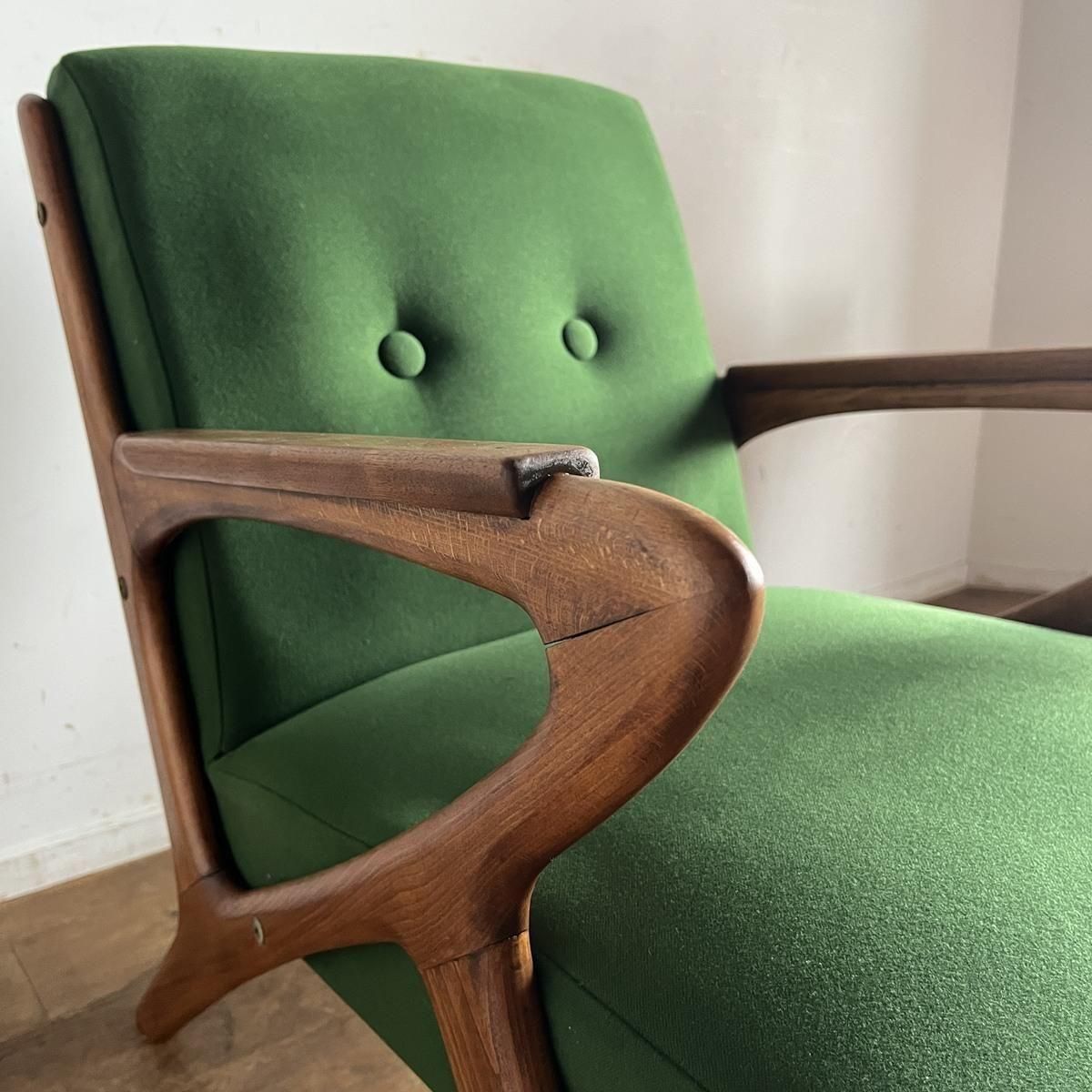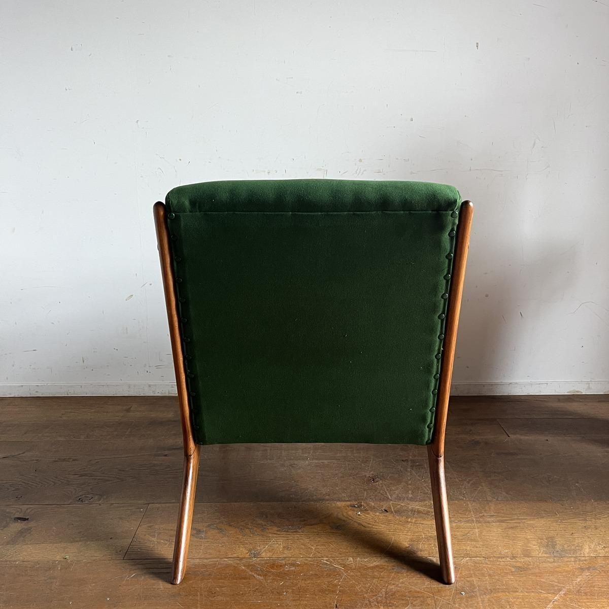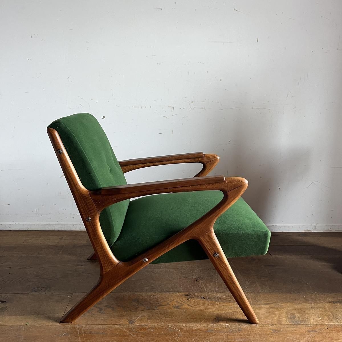 個性的なフレームラインが印象的な、古い1人掛けソファ。ファブリックは、mina perhonen、dop布地のグリーン