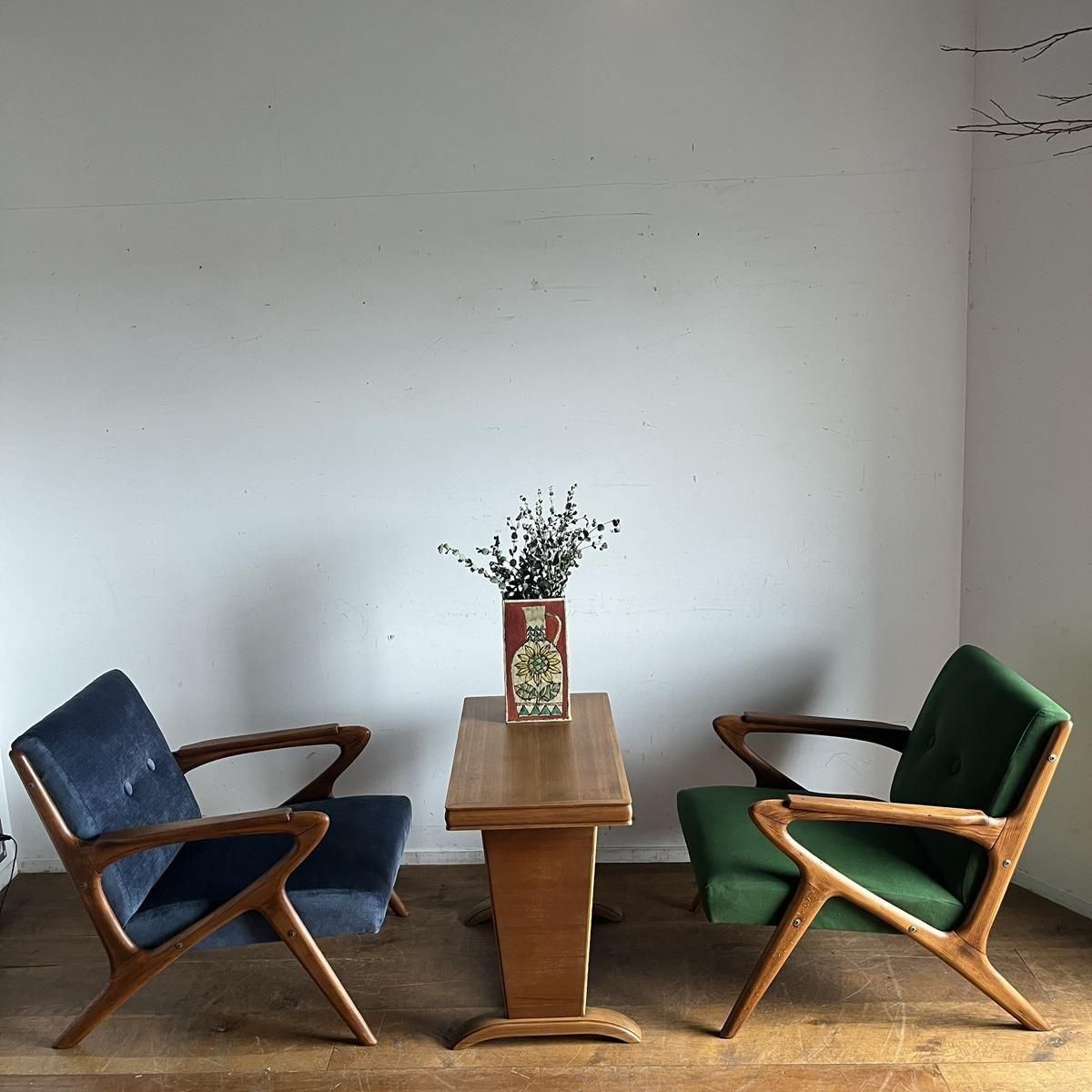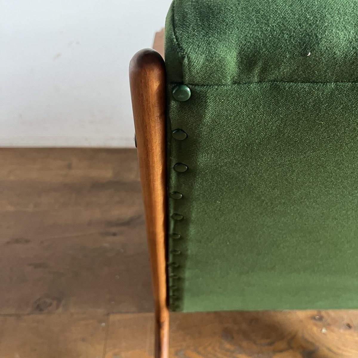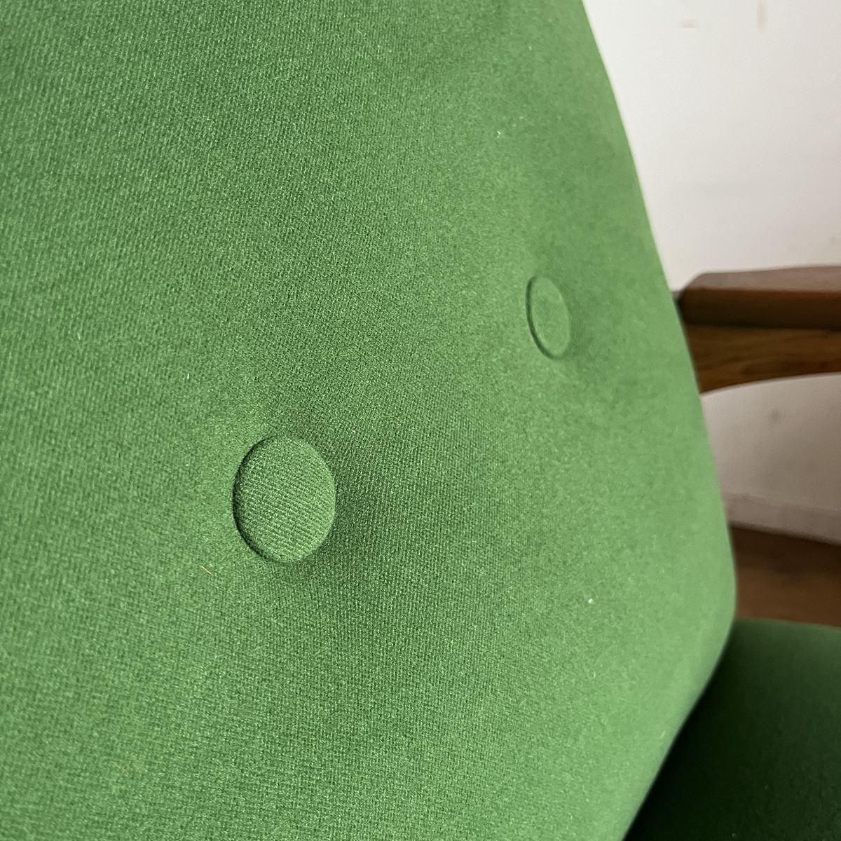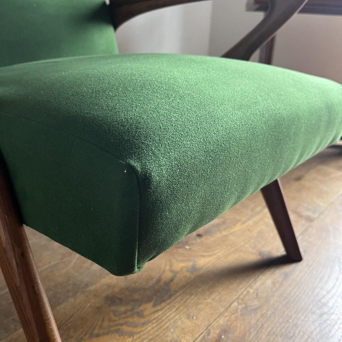 個性的なフレームラインが印象的な、古い1人掛けソファ。ファブリックは、mina perhonen、dop布地のグリーン