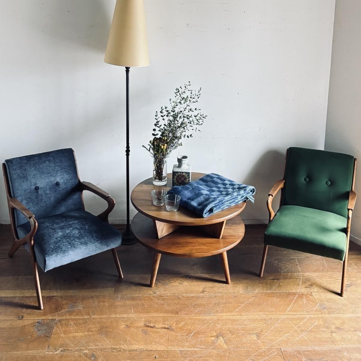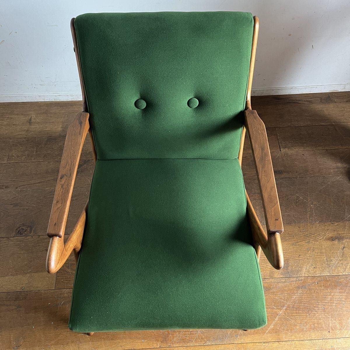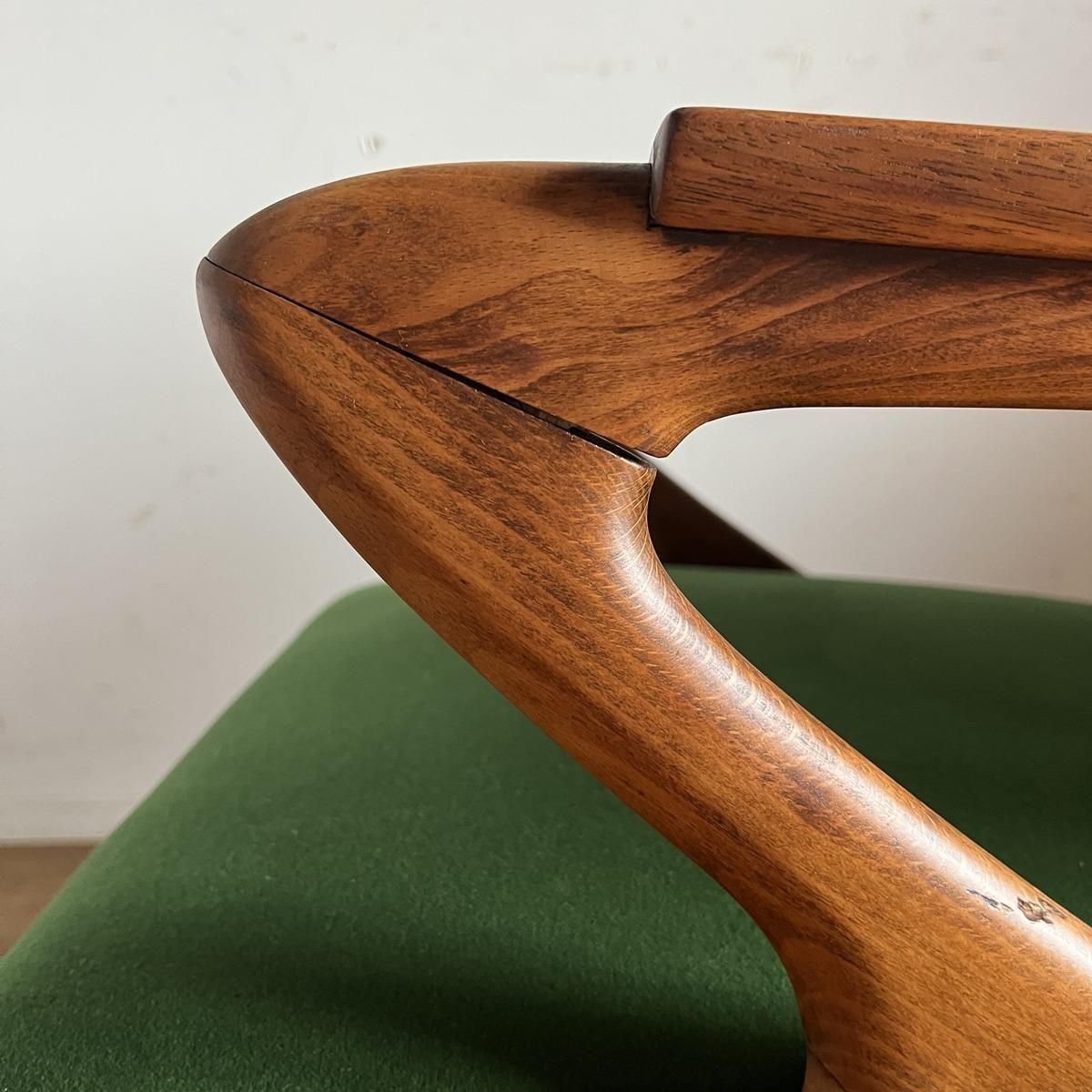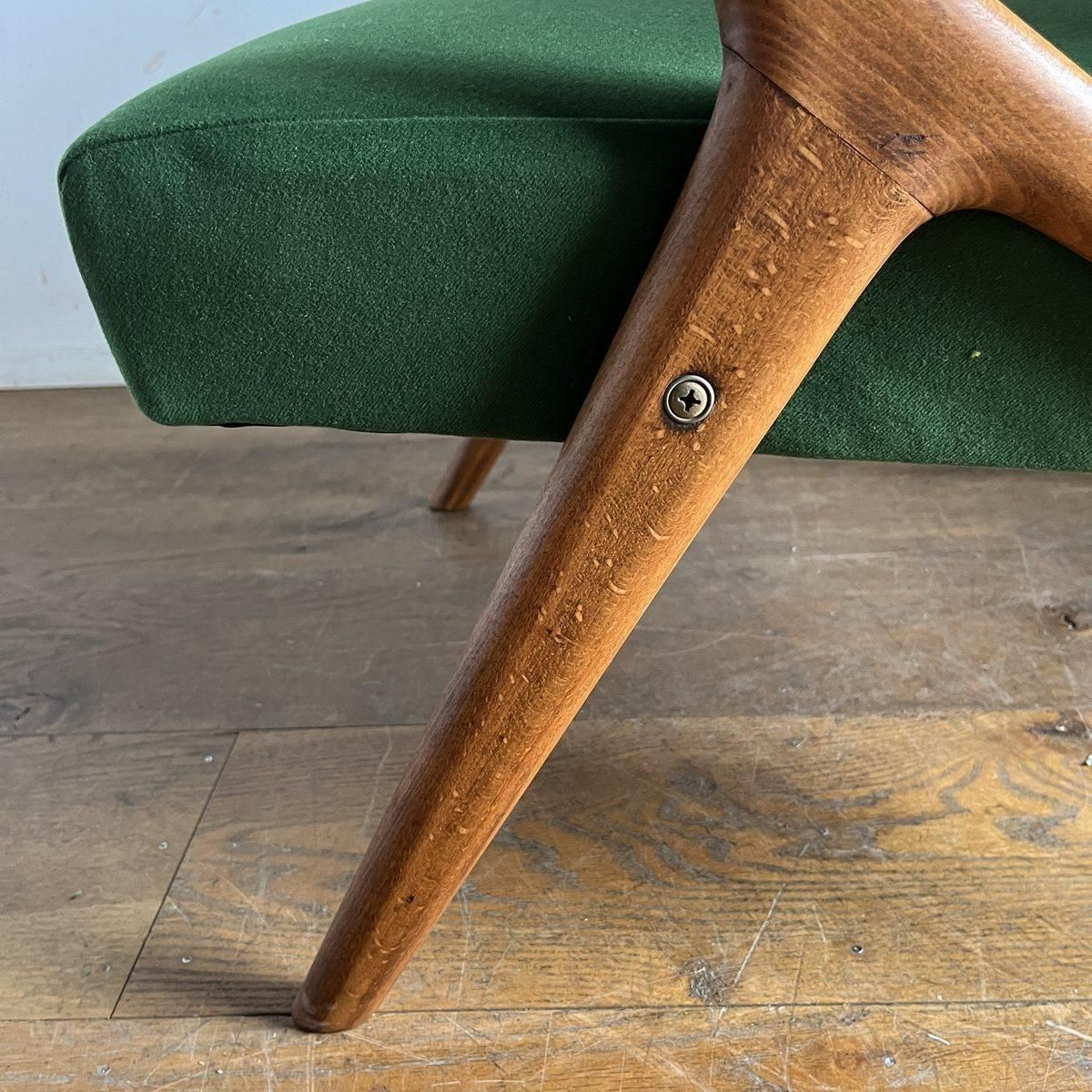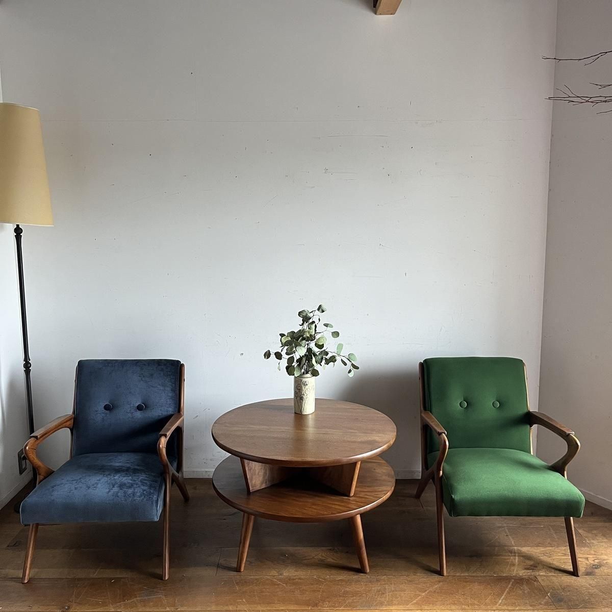 個性的なフレームラインが印象的な、古い1人掛けソファ。ファブリックは、mina perhonen、dop布地のグリーン