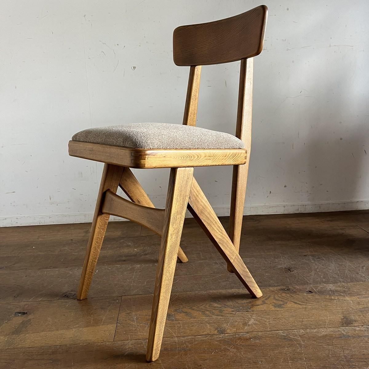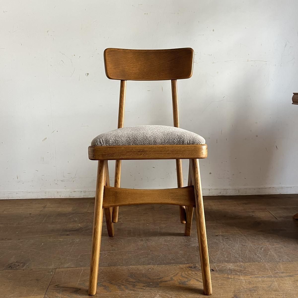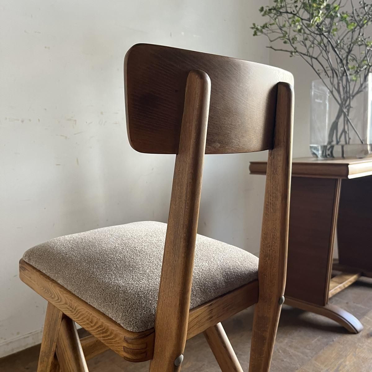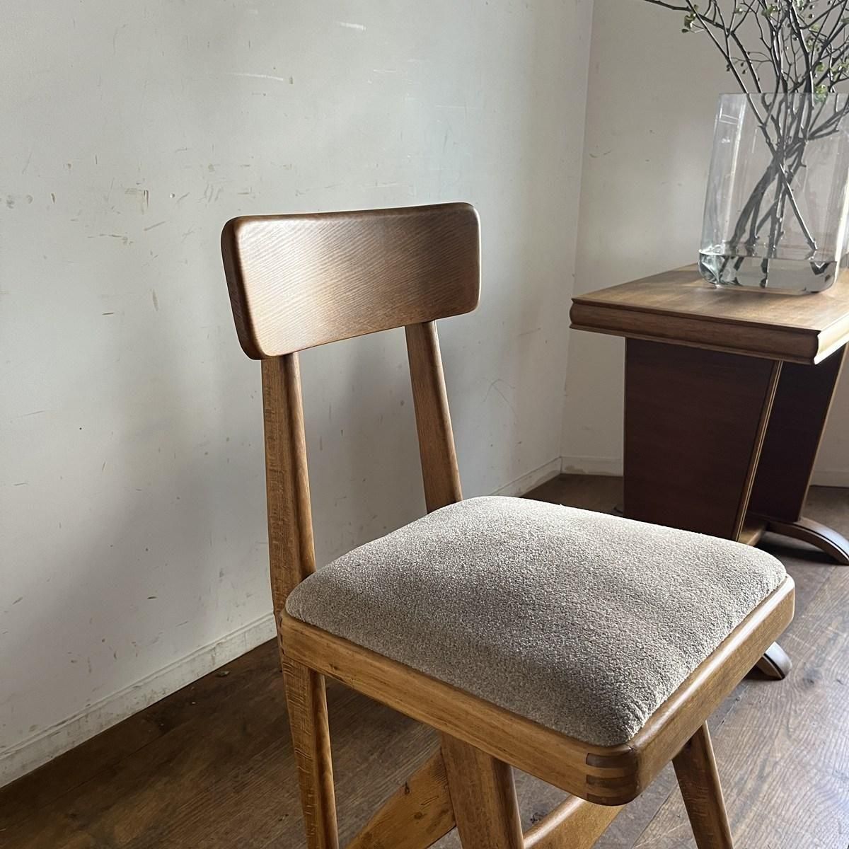 座面は、落ち着いたトーンのファブリックに張り替え済みで、ダイニングチェアとしてはもちろん、デスク用や来客用にも。