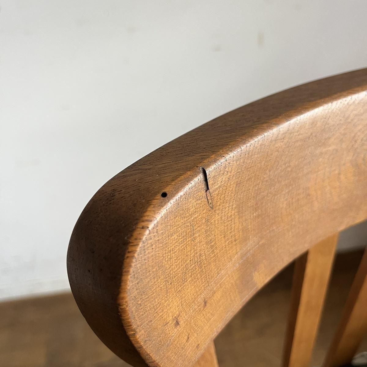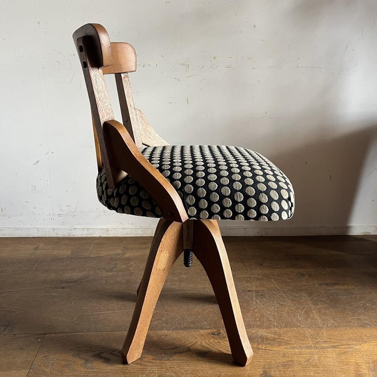 ゆるやかなカーブを描く背もたれと、アームのないデザインの古い回転椅子。
