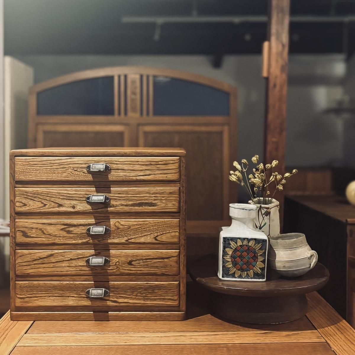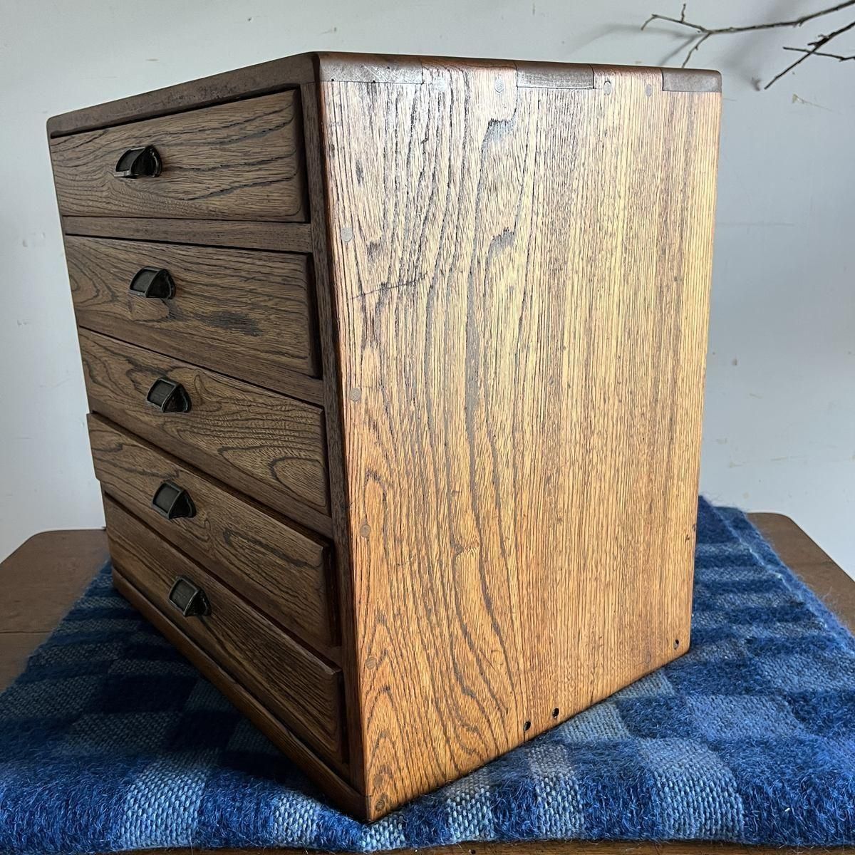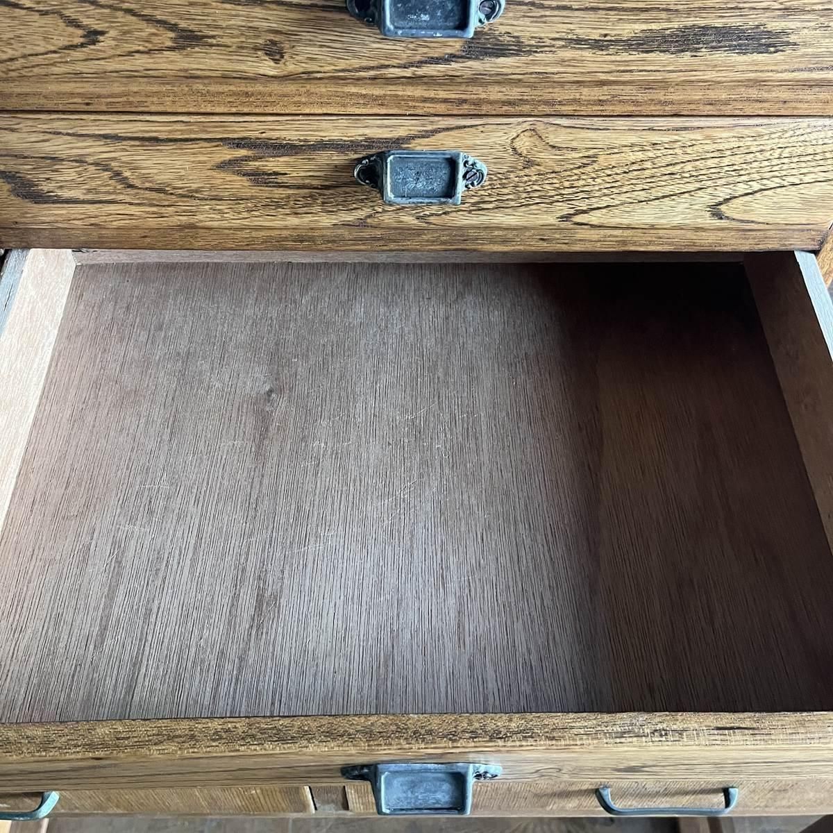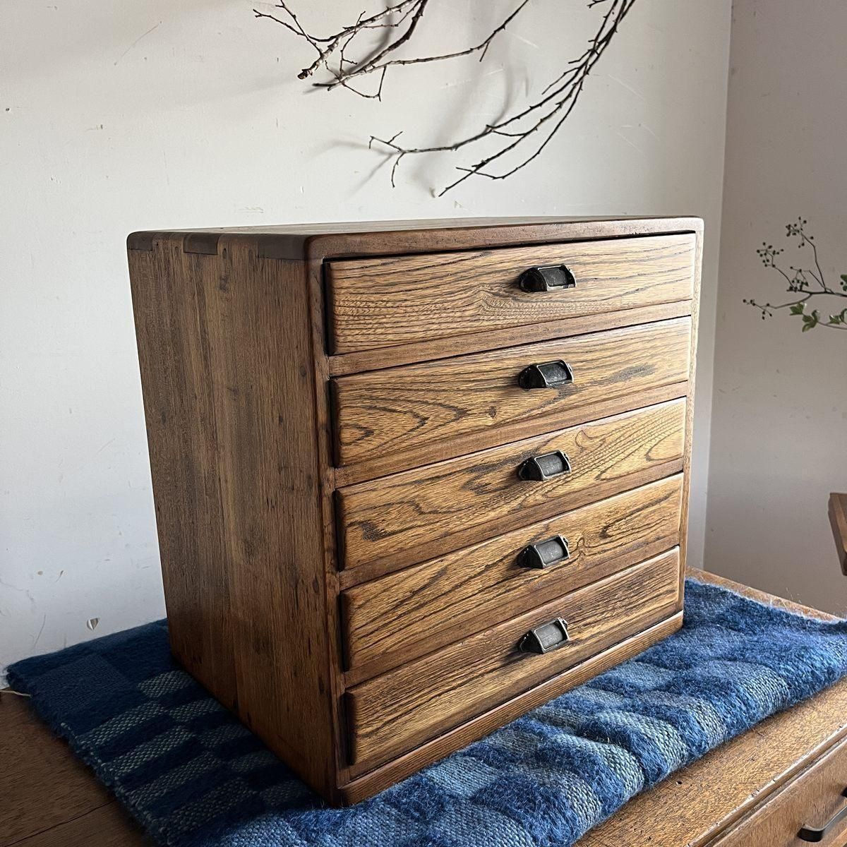 五段の引き出しで、真鍮の小さな取っ手が程よいアクセントになっています。全体のラインもすっきりと整い、和洋どちらの空間にも自然と馴染んでくれそうです。細かな文具や裁縫道具、手紙などの整理にぴったりのサイズ感。引き出しの開閉もスムーズで、状態も良好です。