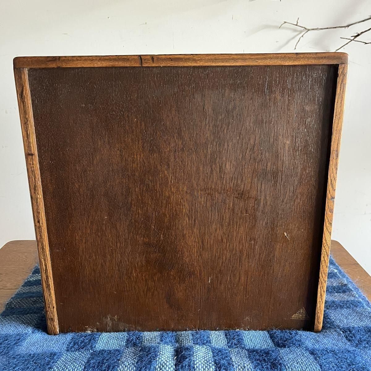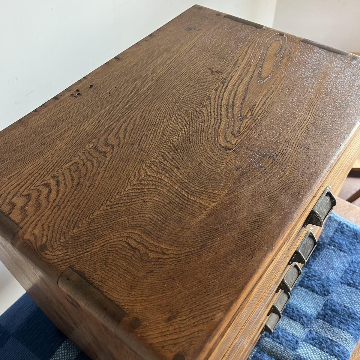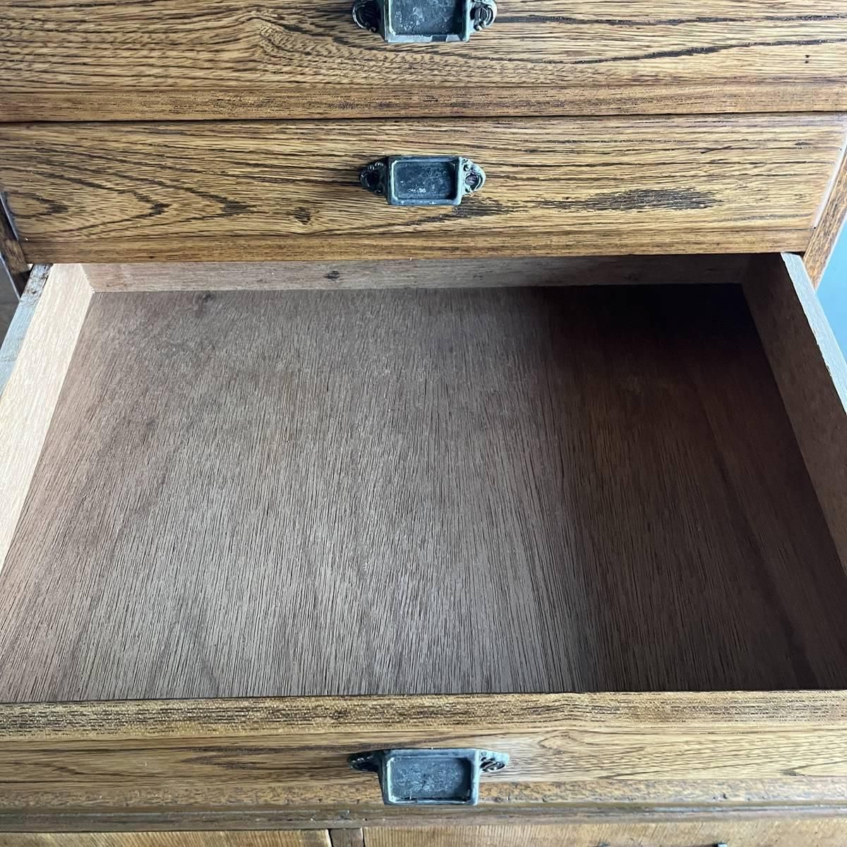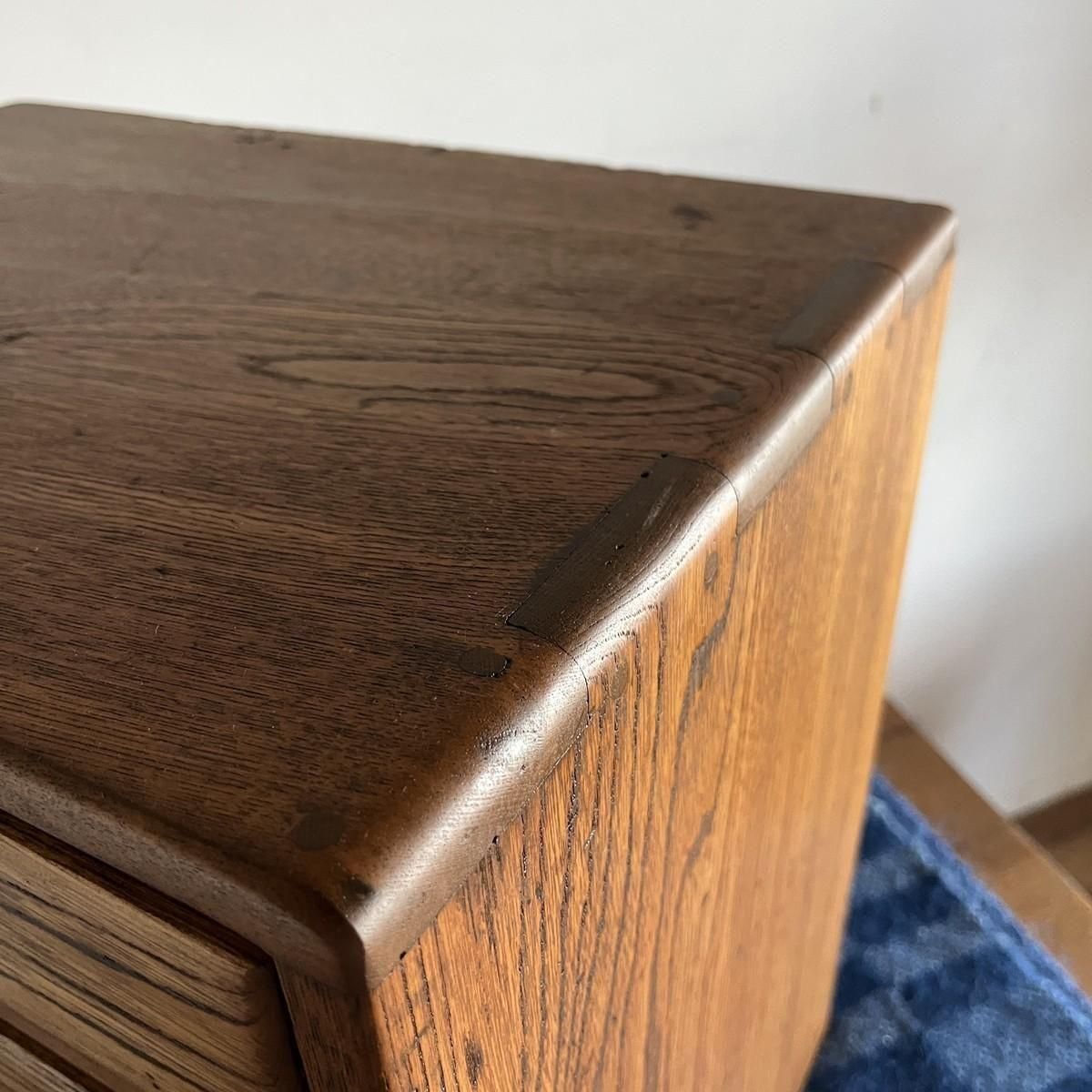 五段の引き出しで、真鍮の小さな取っ手が程よいアクセントになっています。全体のラインもすっきりと整い、和洋どちらの空間にも自然と馴染んでくれそうです。細かな文具や裁縫道具、手紙などの整理にぴったりのサイズ感。引き出しの開閉もスムーズで、状態も良好です。