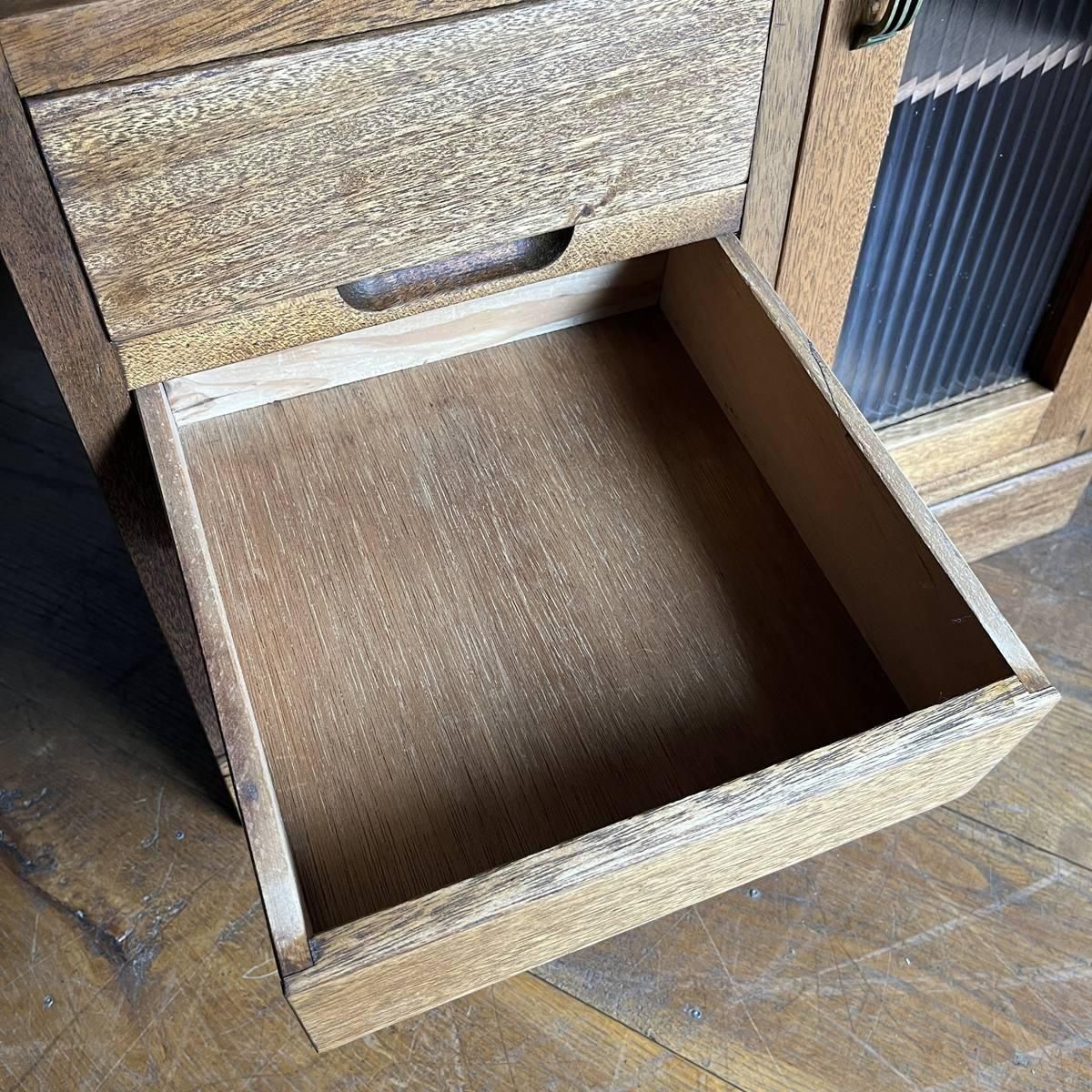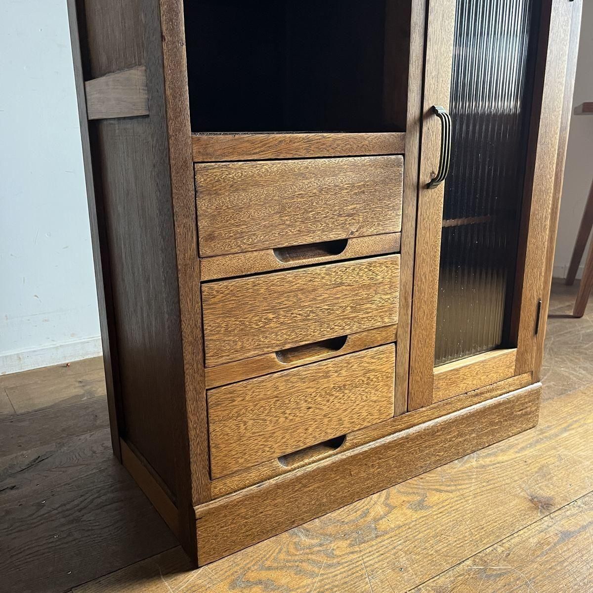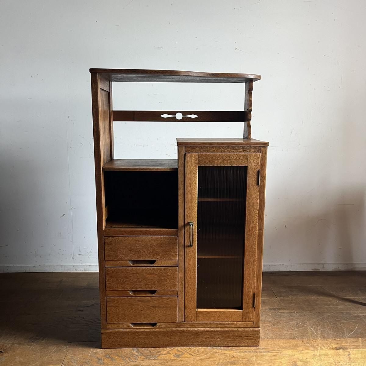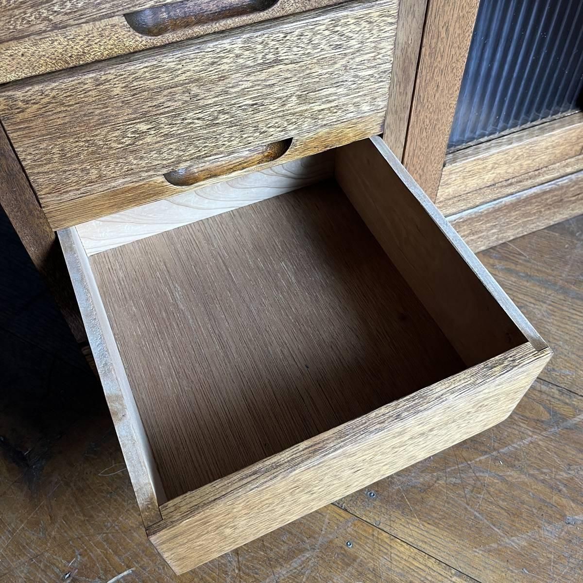 引き出し、オープン棚、ガラス扉の収納と、使い勝手のよい機能がひとつにまとまっていて、
