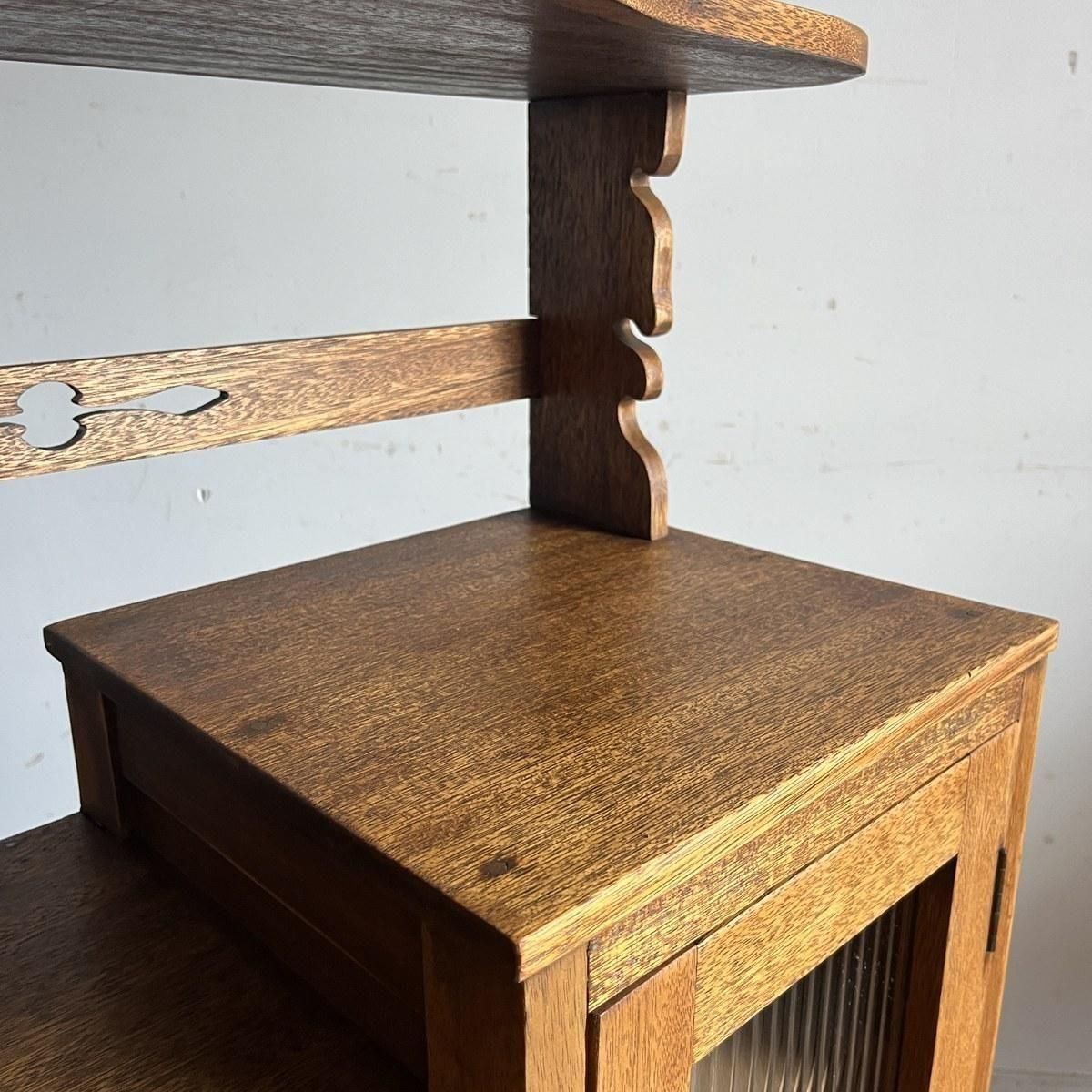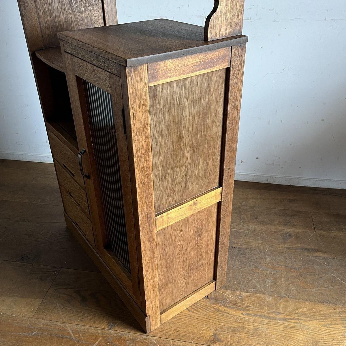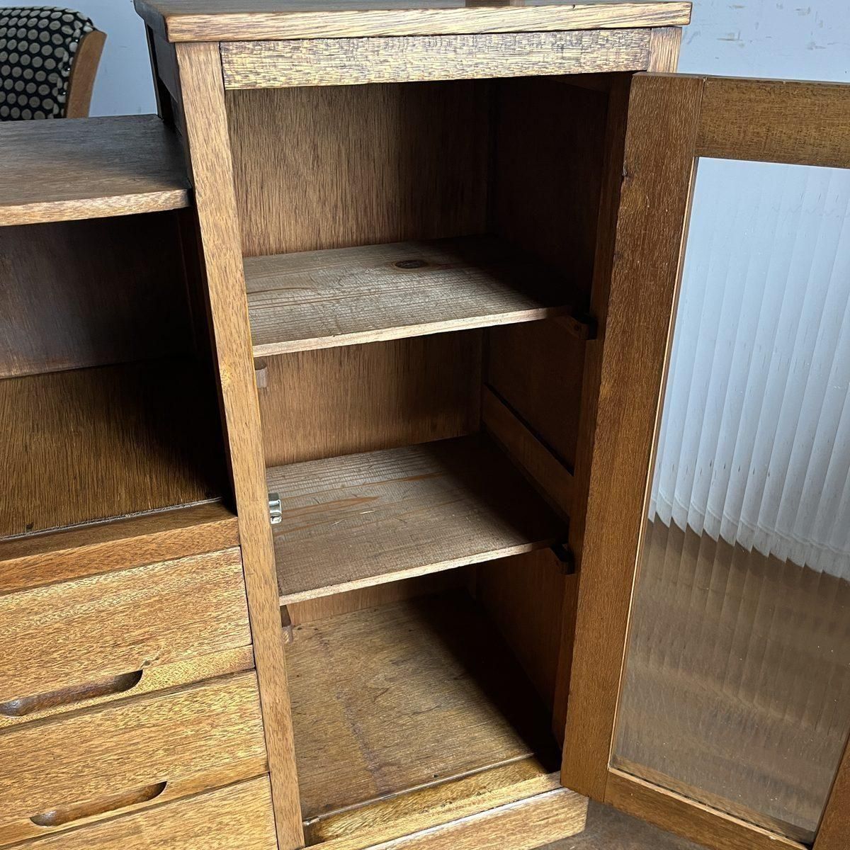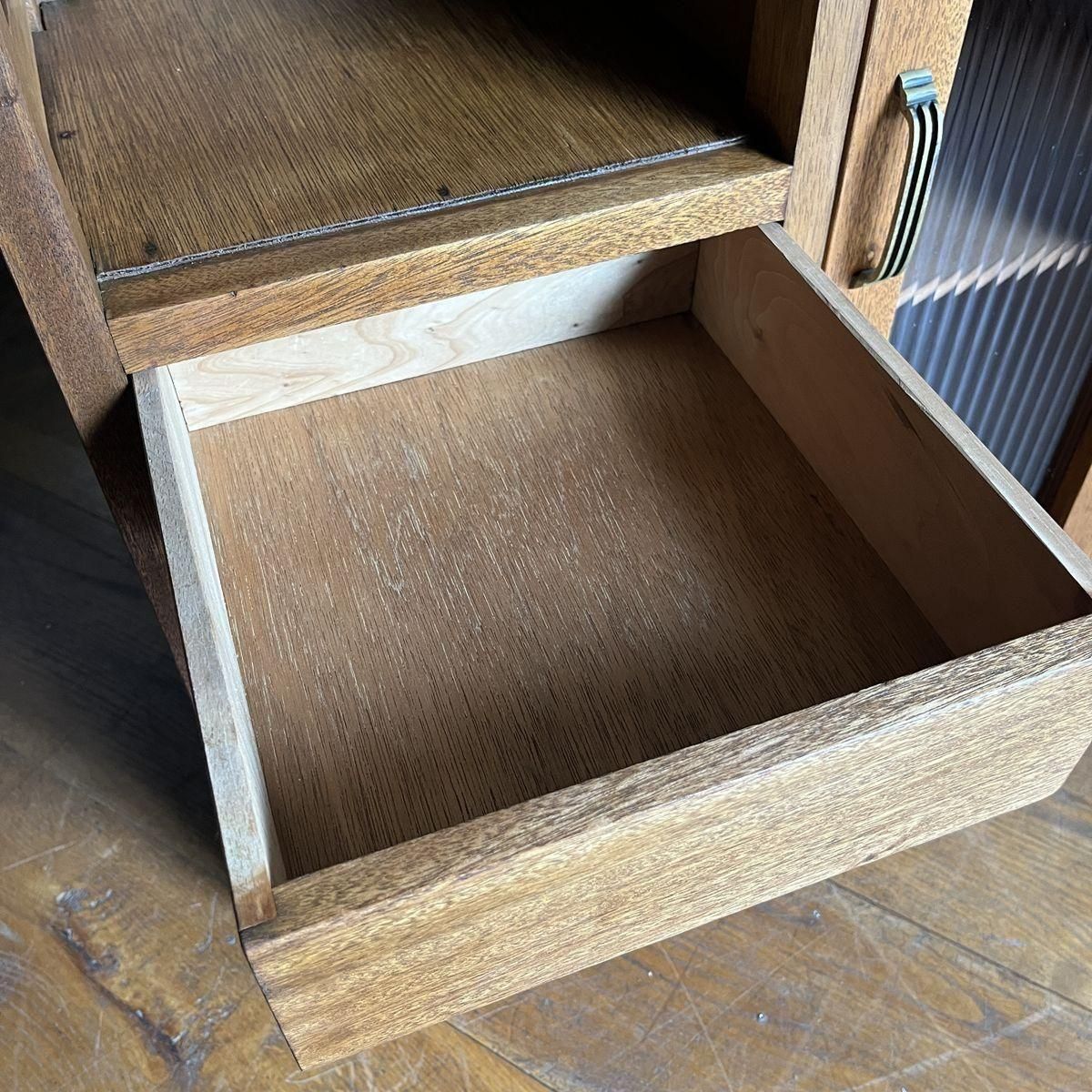 引き出し、オープン棚、ガラス扉の収納と、使い勝手のよい機能がひとつにまとまっていて、