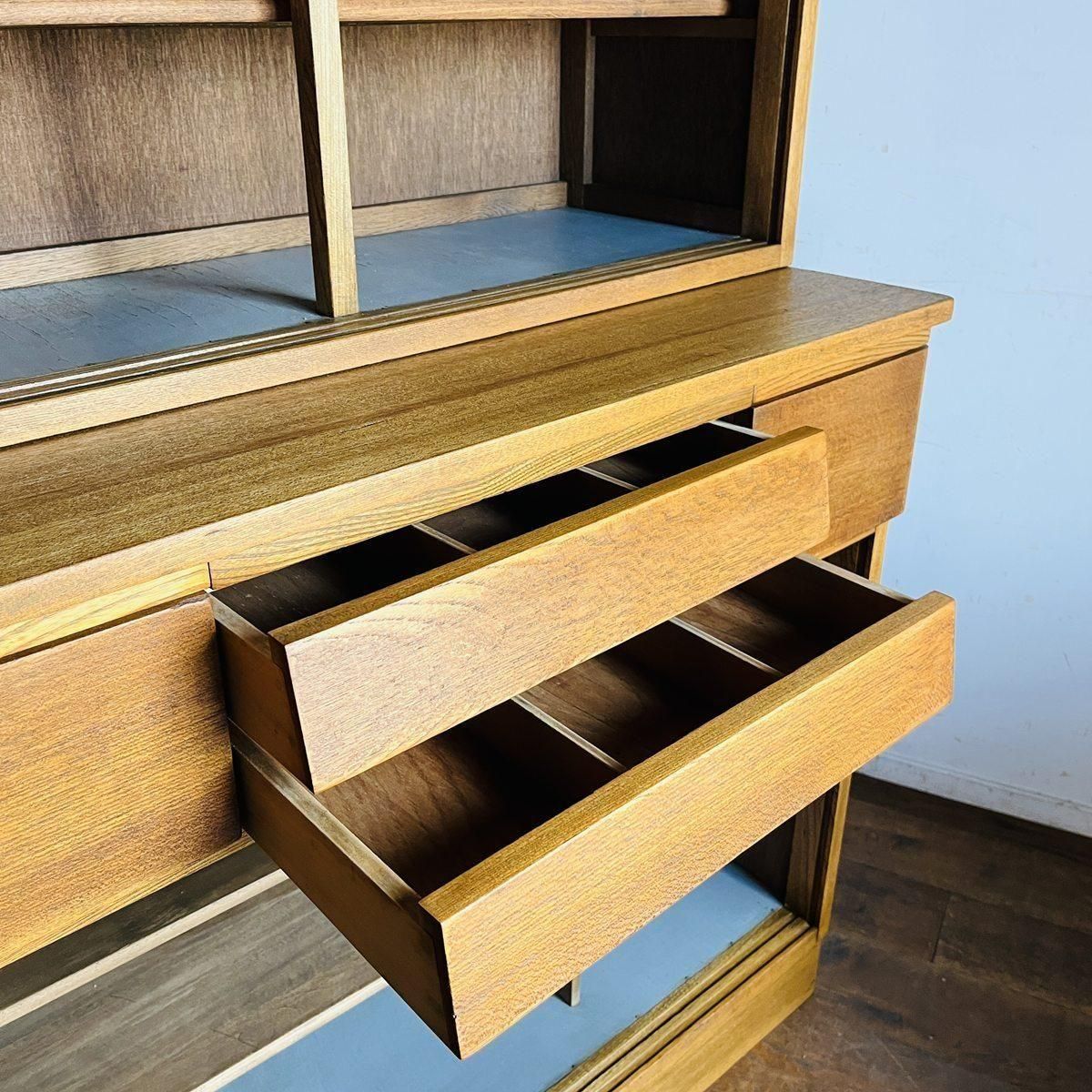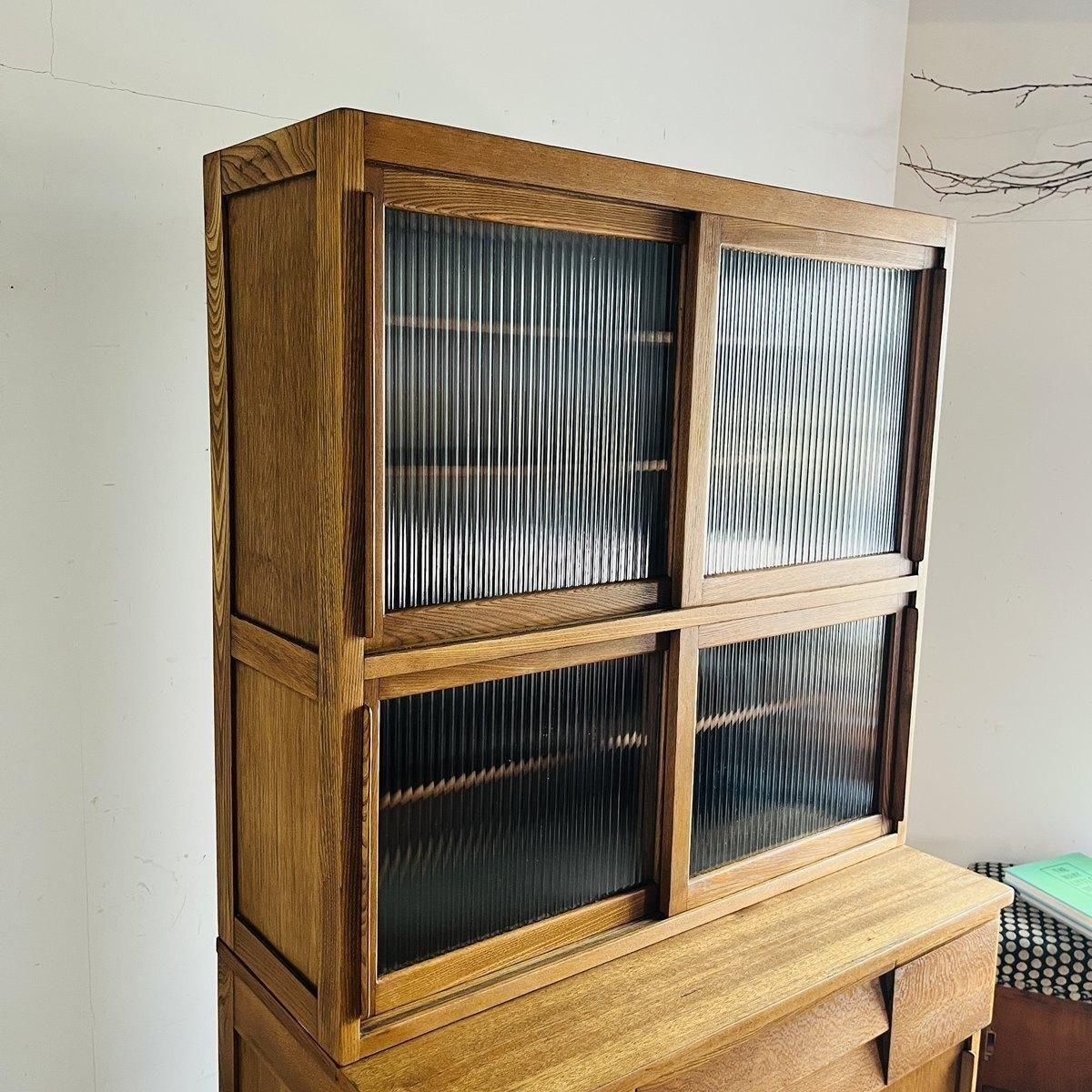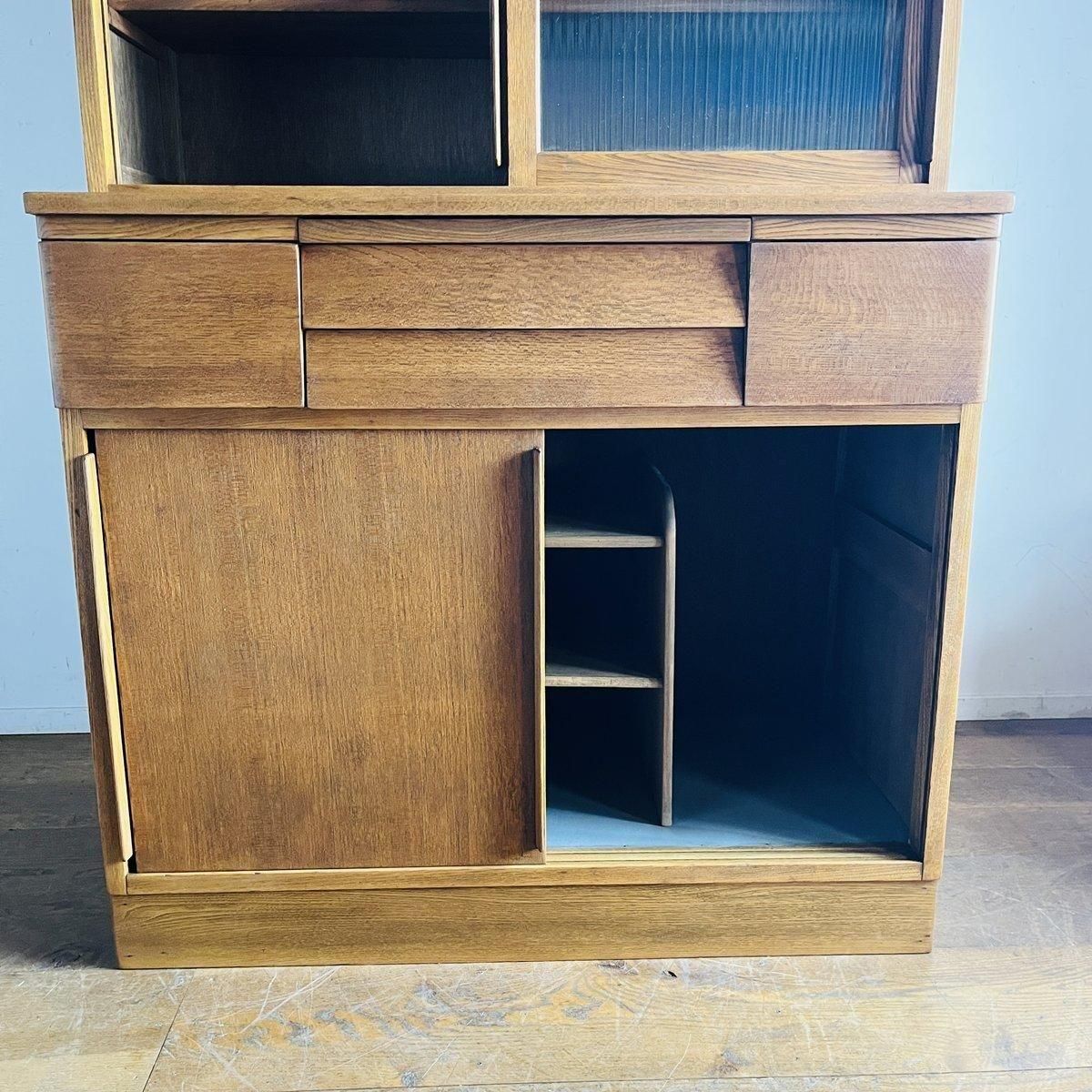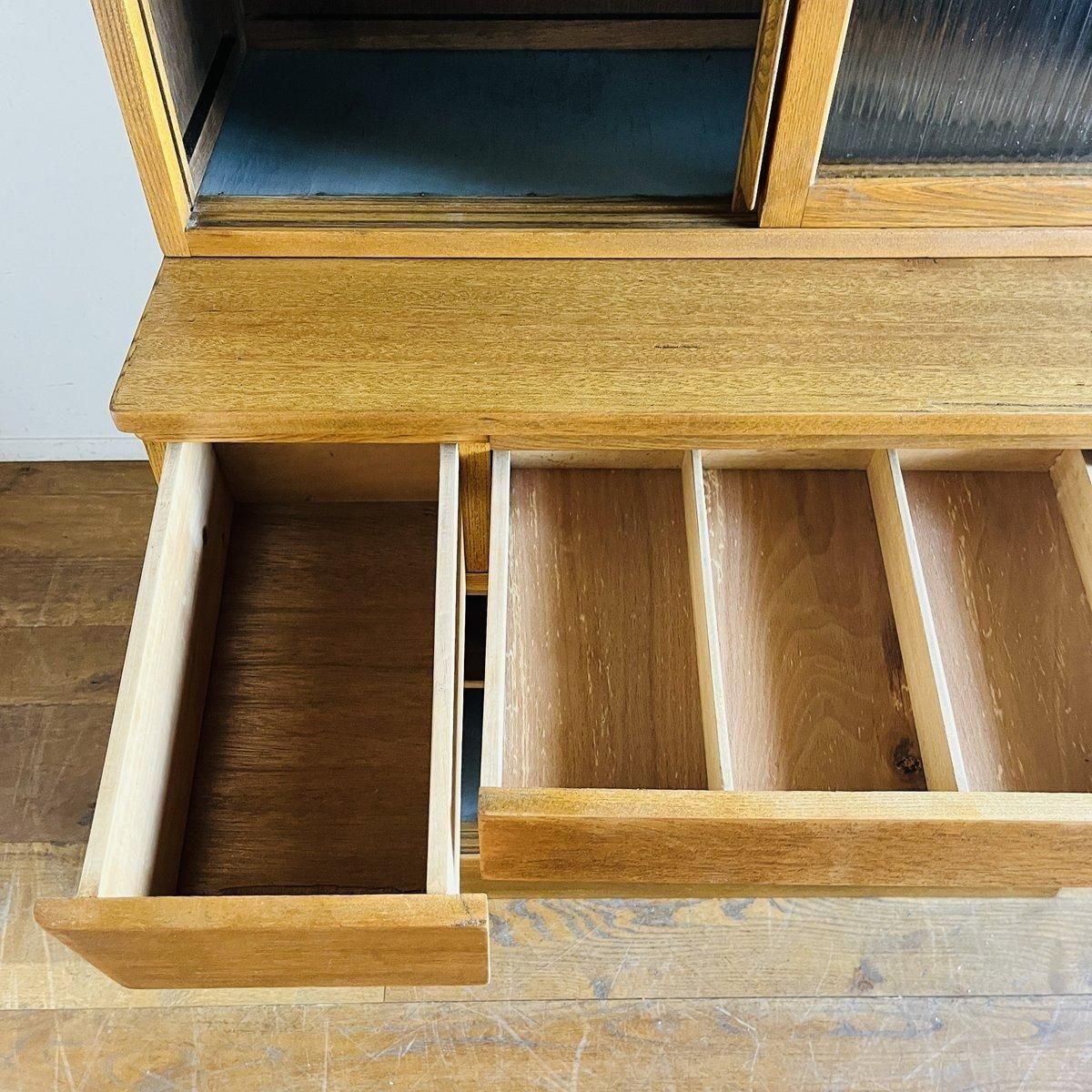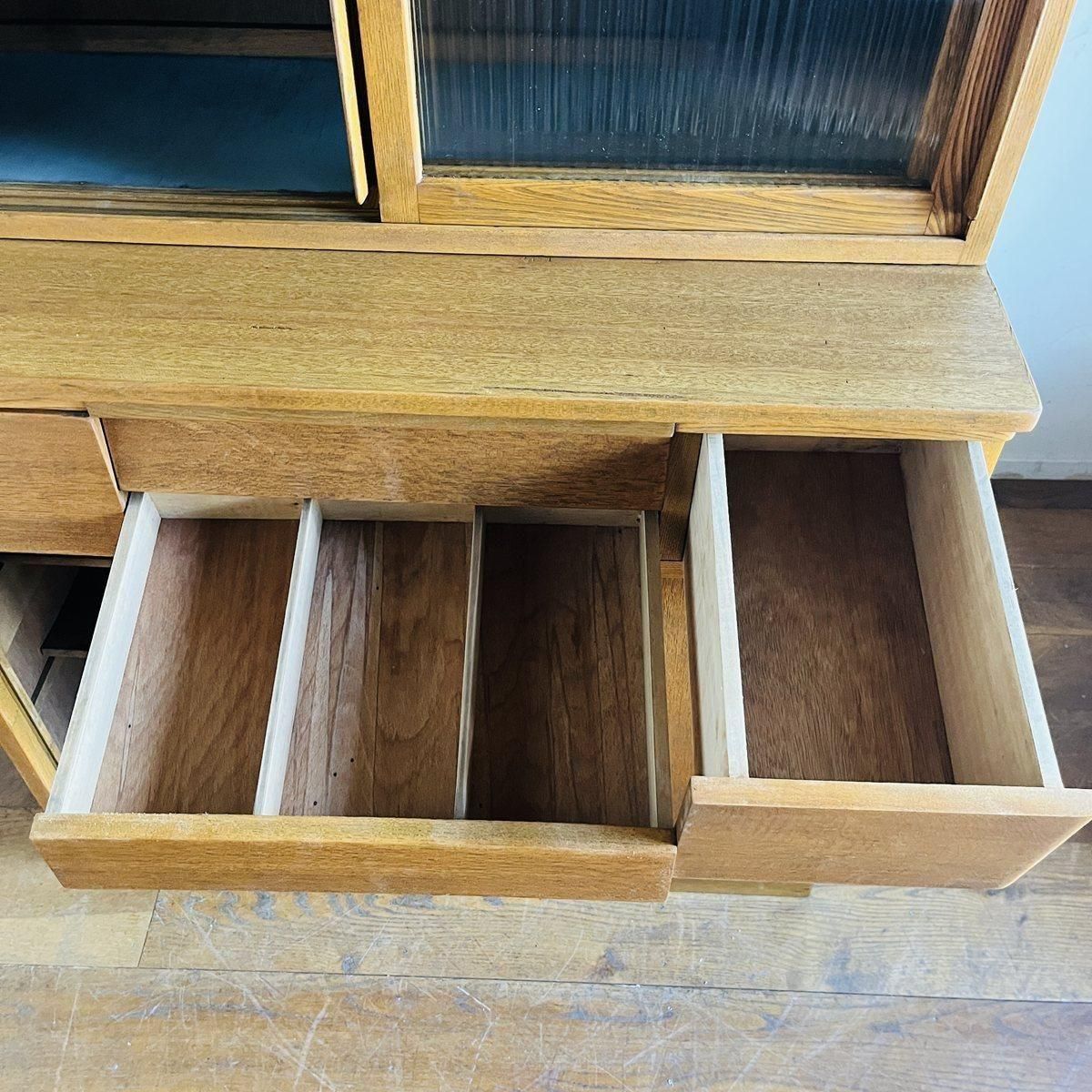 上段のガラス戸や引き出し、下段の収納スペースも実用的で、器や台所まわりの物の収納にぴったりです。