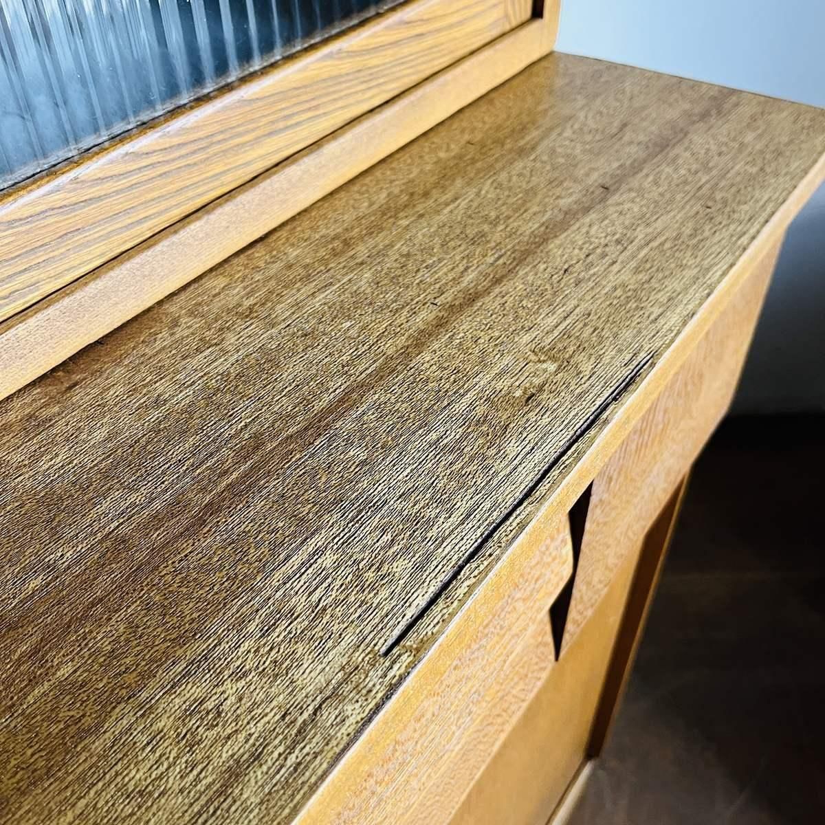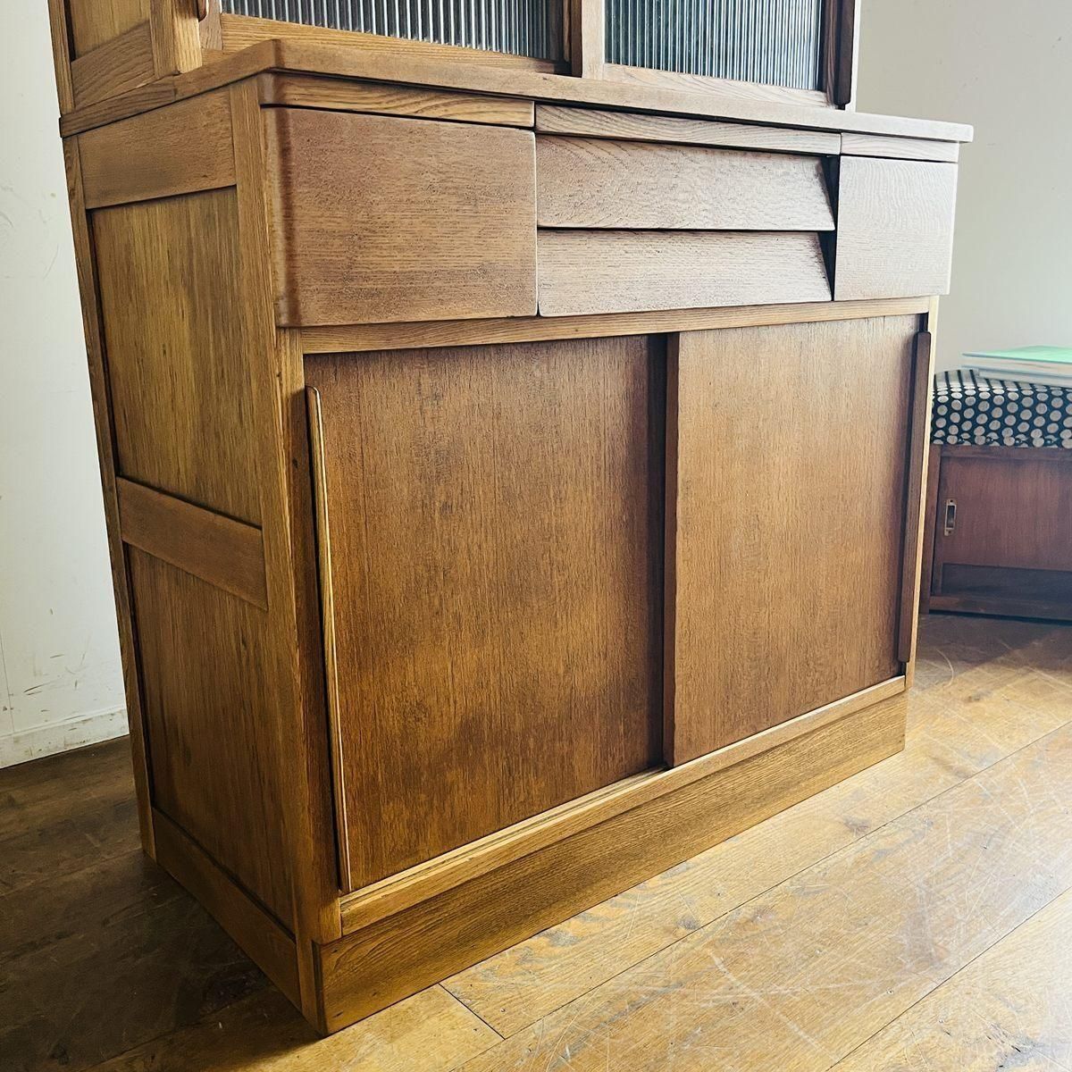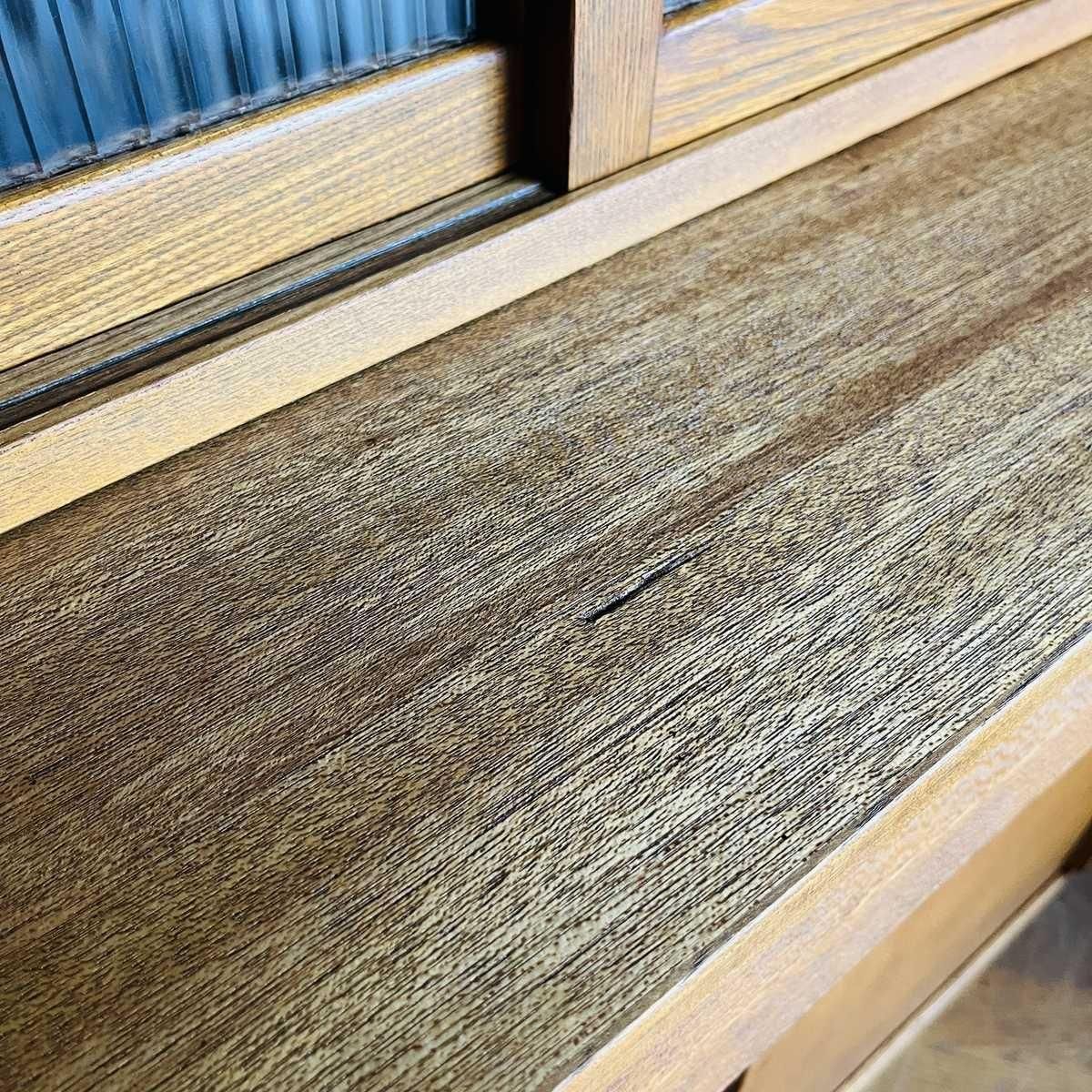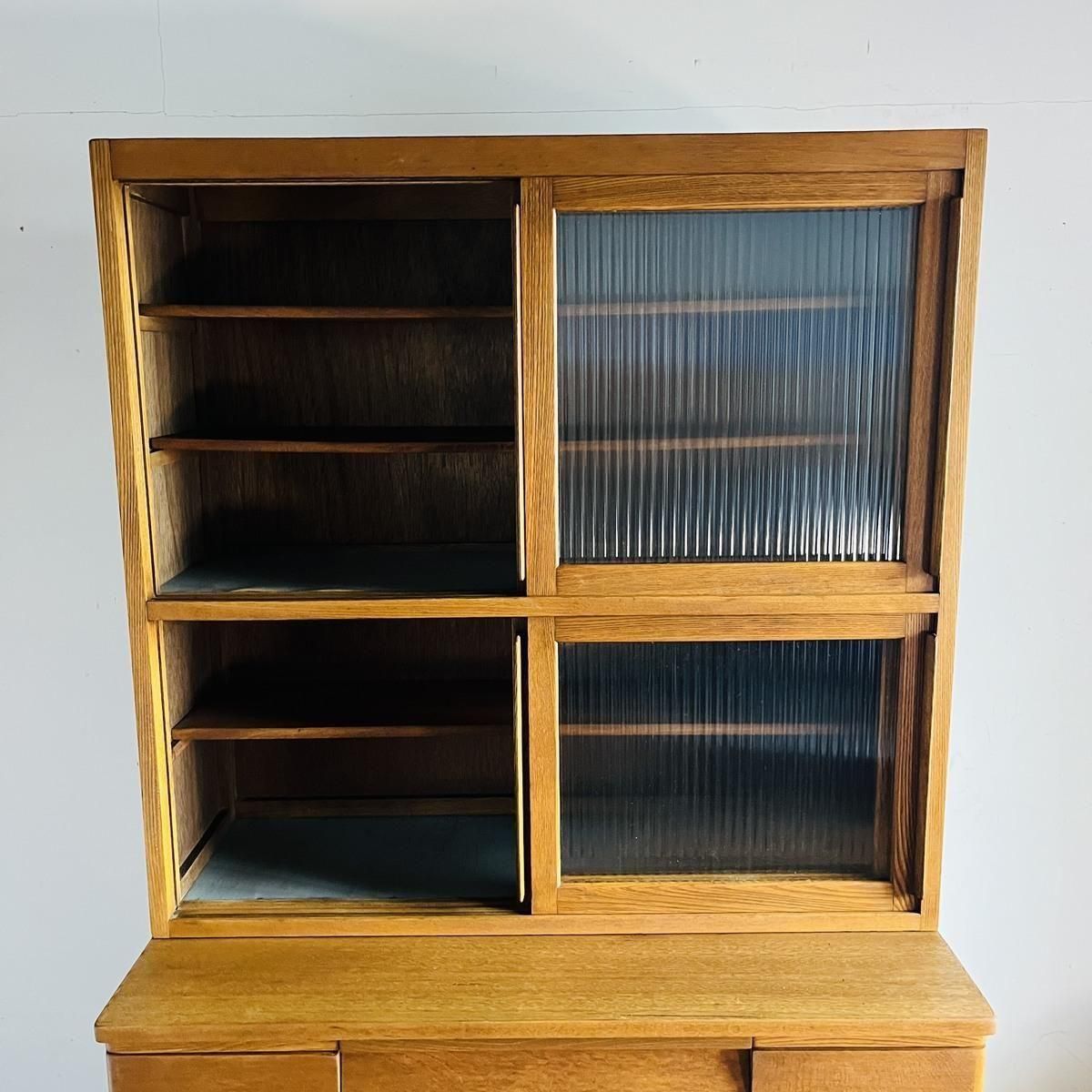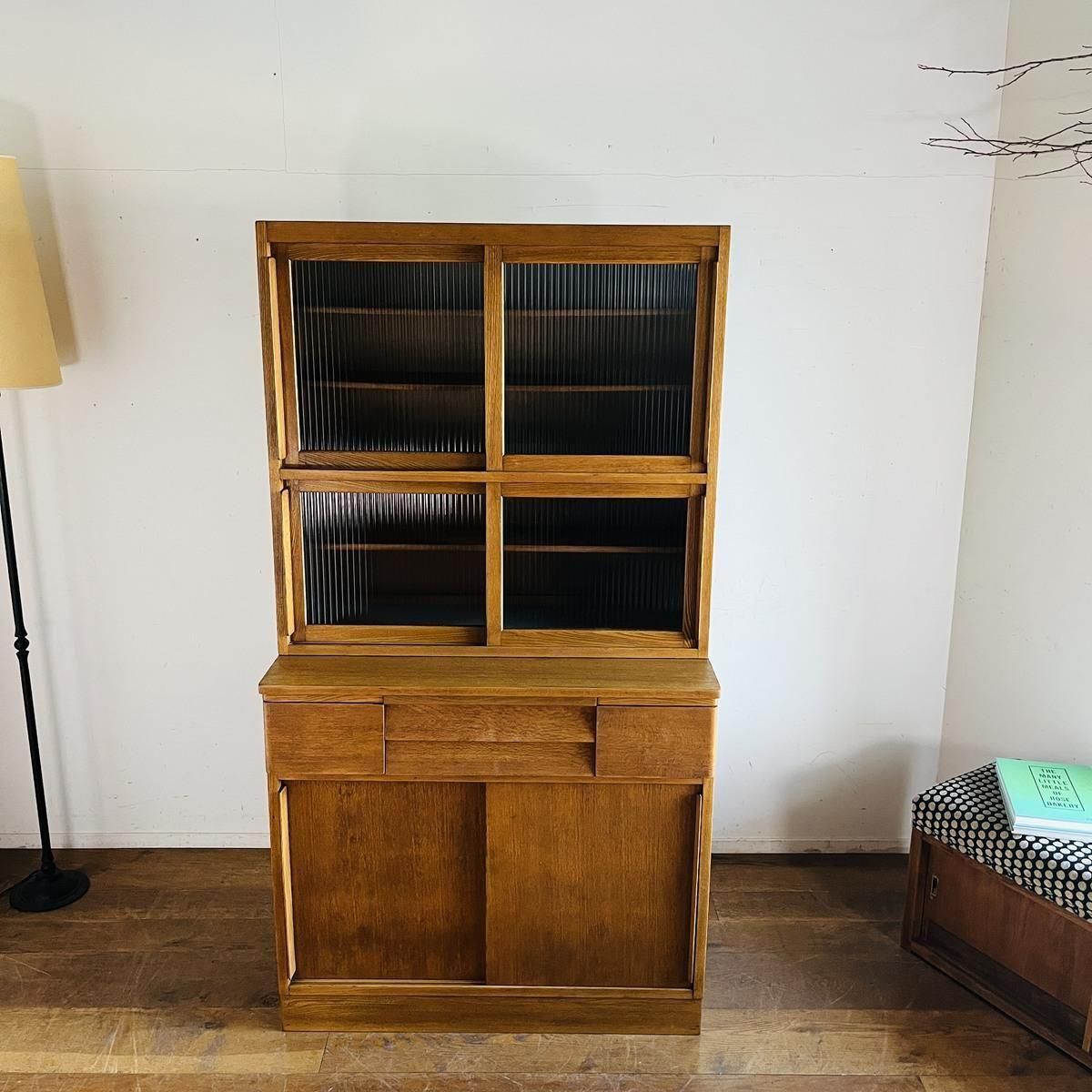 上段のガラス戸や引き出し、下段の収納スペースも実用的で、器や台所まわりの物の収納にぴったりです。