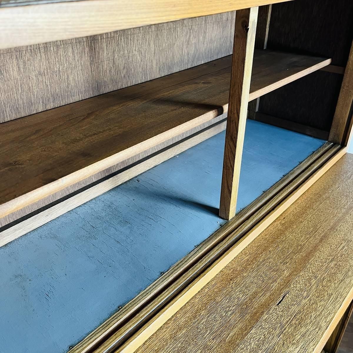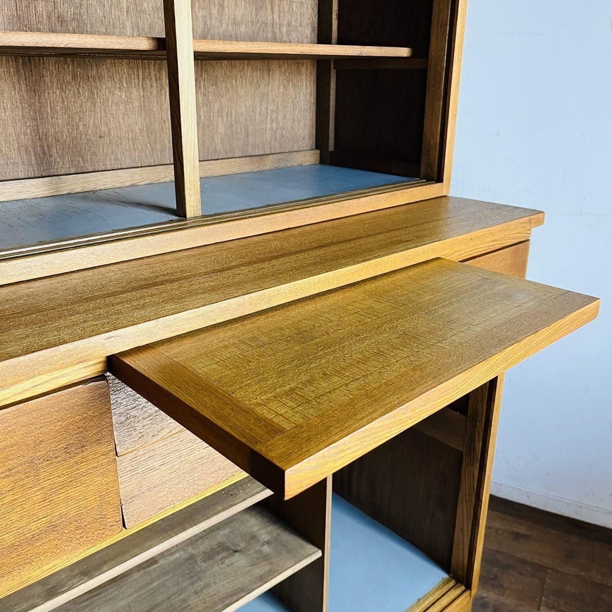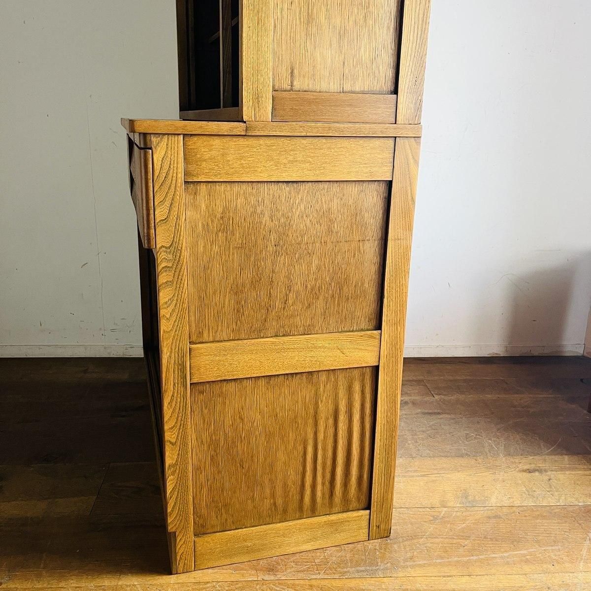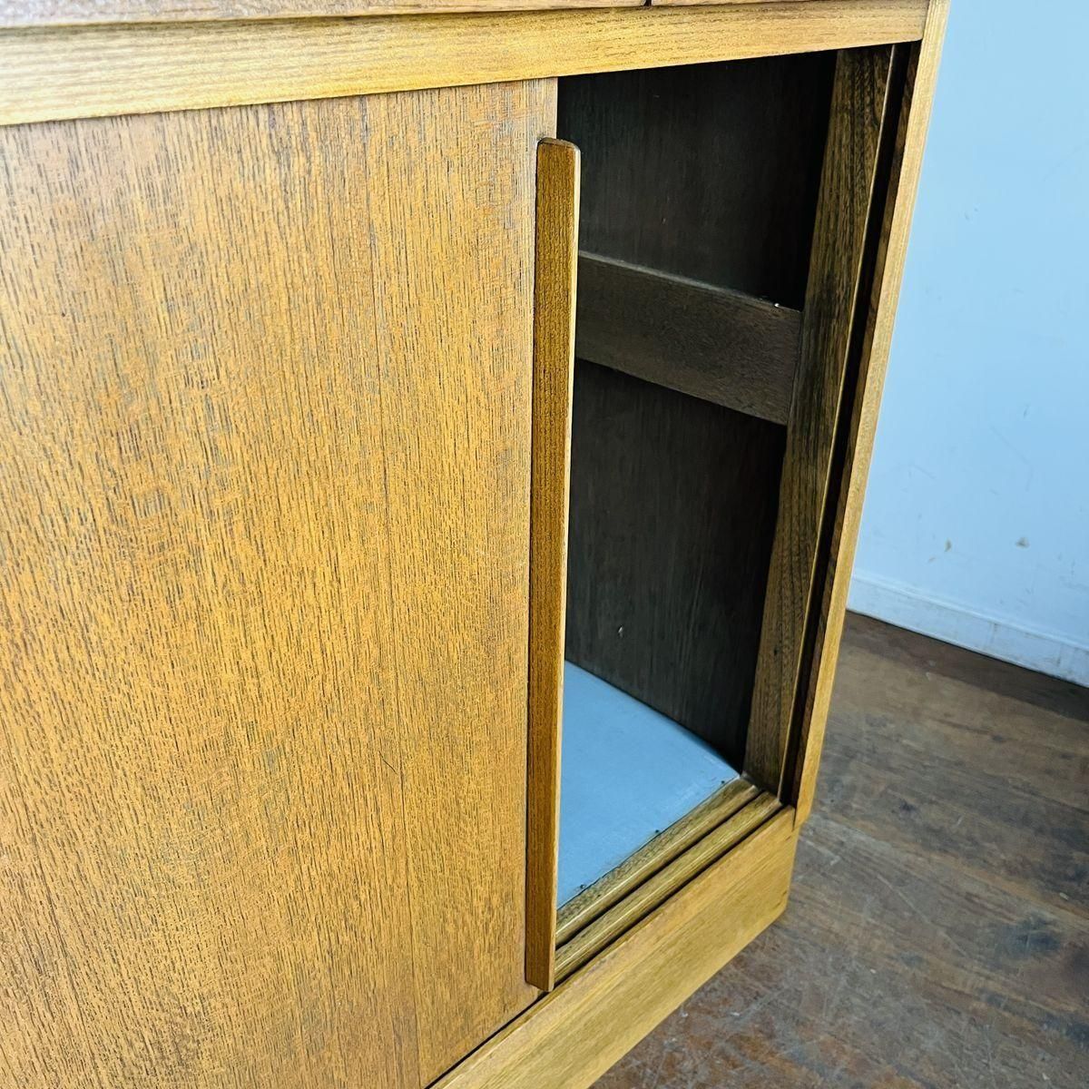 上段のガラス戸や引き出し、下段の収納スペースも実用的で、器や台所まわりの物の収納にぴったりです。