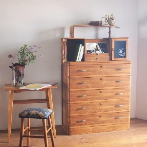 木地はやわらかいブラウン色で落ちついた優しい印象です。5杯の引き出しと、ひらき扉の中の仕切り棚が魅力的。食器棚としてかっこよく素適に活躍してくれそうです。
