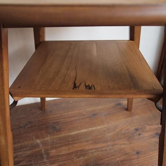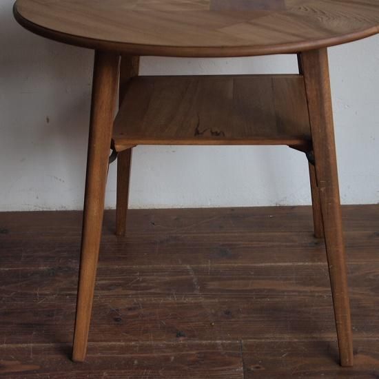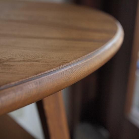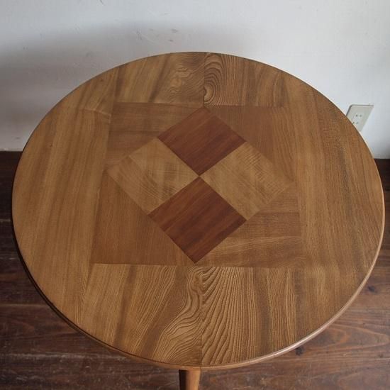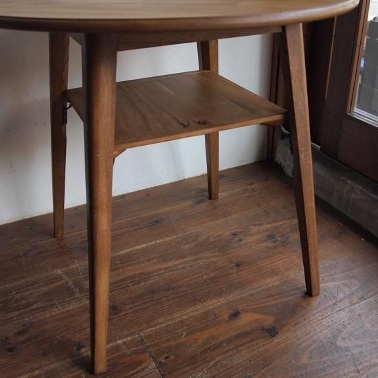 天板に象嵌細工が施された「丸ティーテーブル」。ブック置きもついた、すっきりと気の利いたデザイン。しっとりと優しい木地で、天板の細工、脚の細いラインがきれいです。