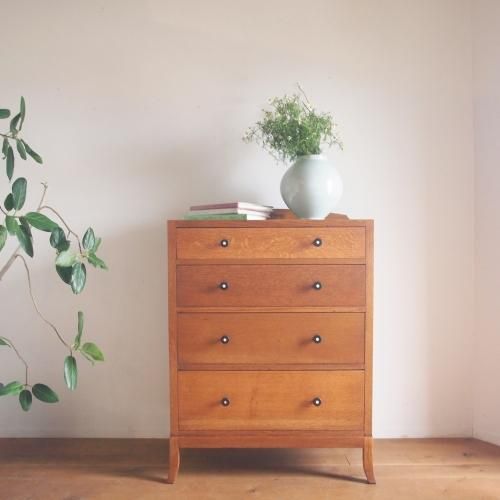4杯の細長の「チェスト」。丸みをおびた木の取手がすてきな雰囲気。落ち着いた印象の木地色で、書類やちょっとした衣類の整理にも活躍してくれそうですね。天板に「緑やお花」を置いても相性が良さそうです。